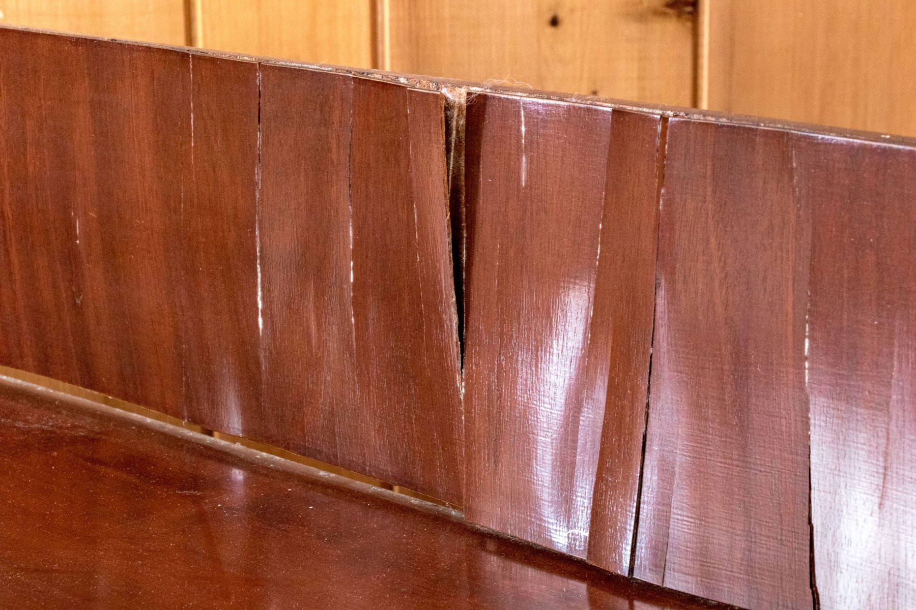 Splits and lifting with losses to the veneers. A loss below the drop front writing desk to the frame underneath on left hand side with another loss on the left side below the table top. Wear is commensurate with age and use.