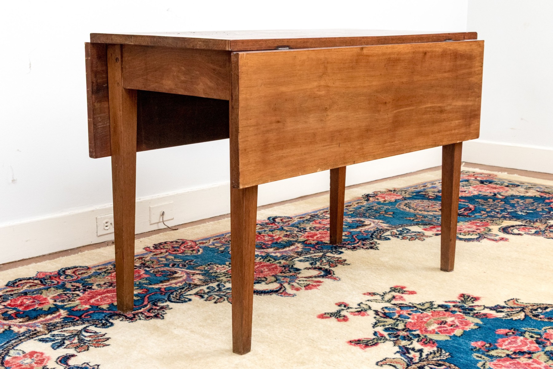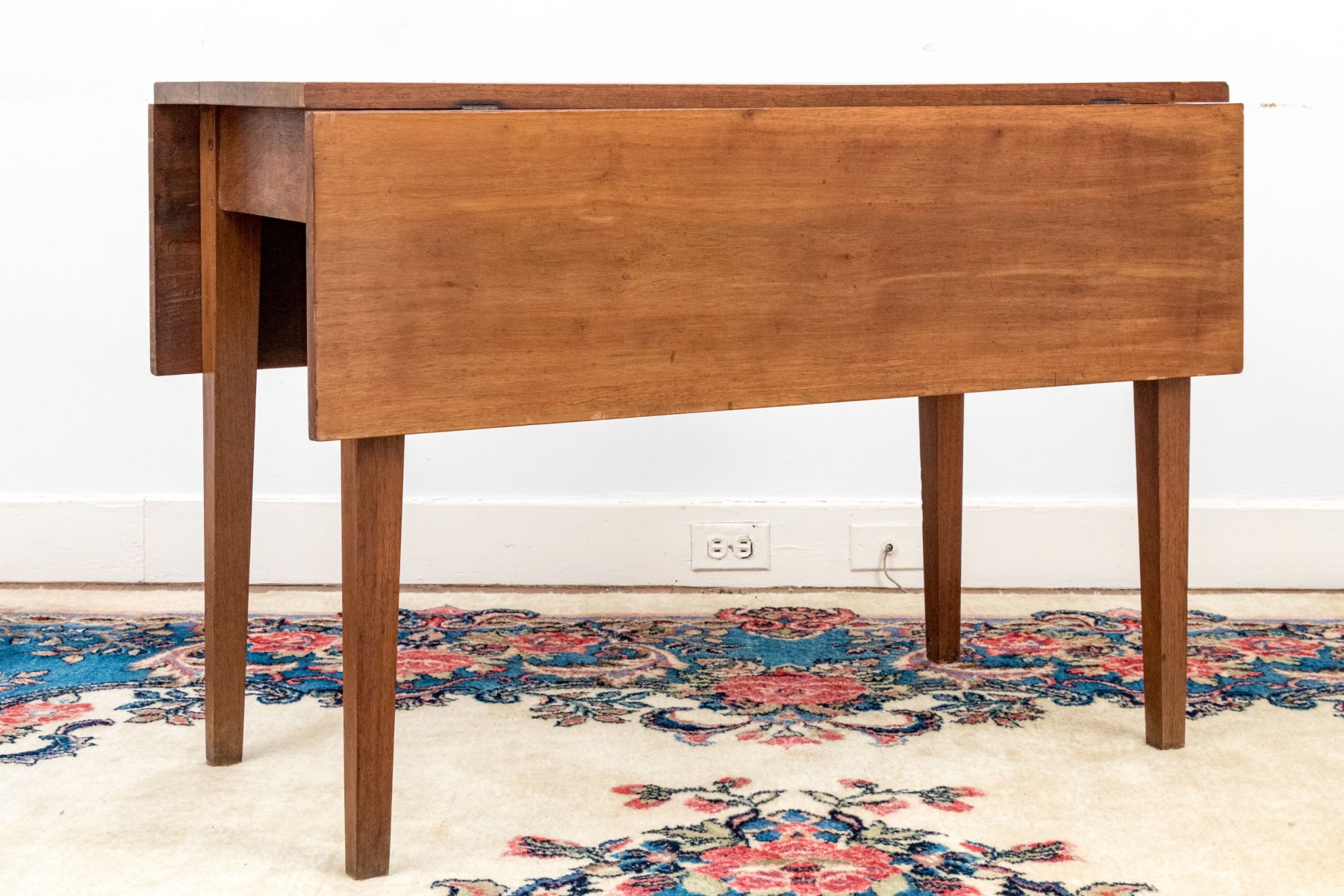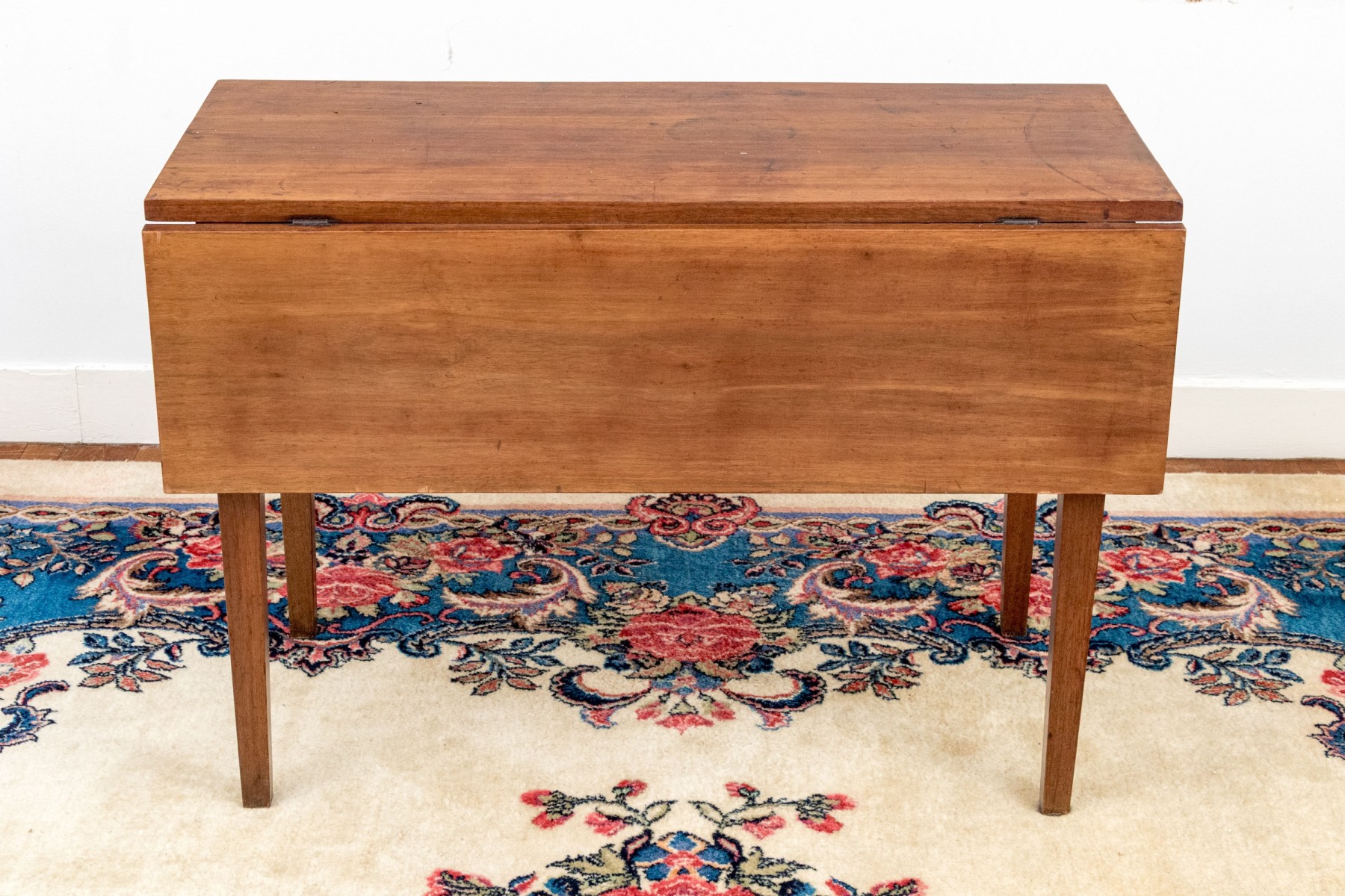 A sleek antique pembroke table in honeyed medium brown, showcasing straight leaves over straight tapered legs for a clean, minimalist appearance.