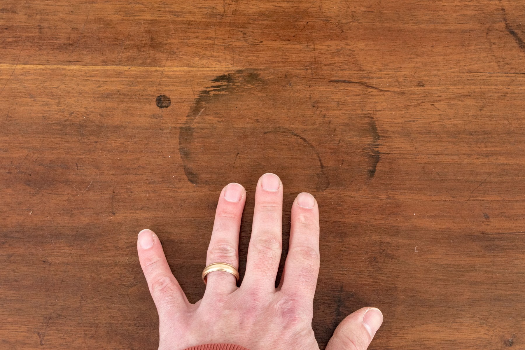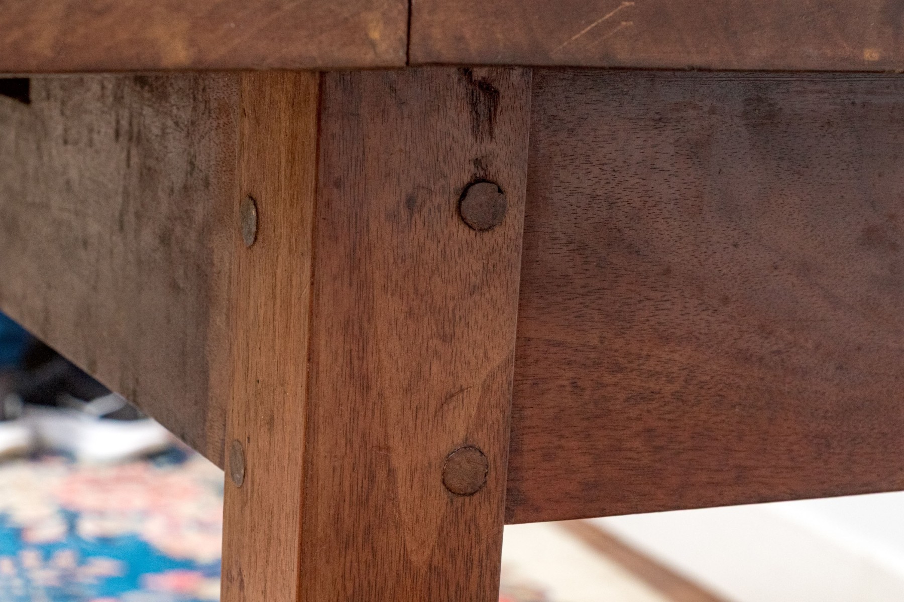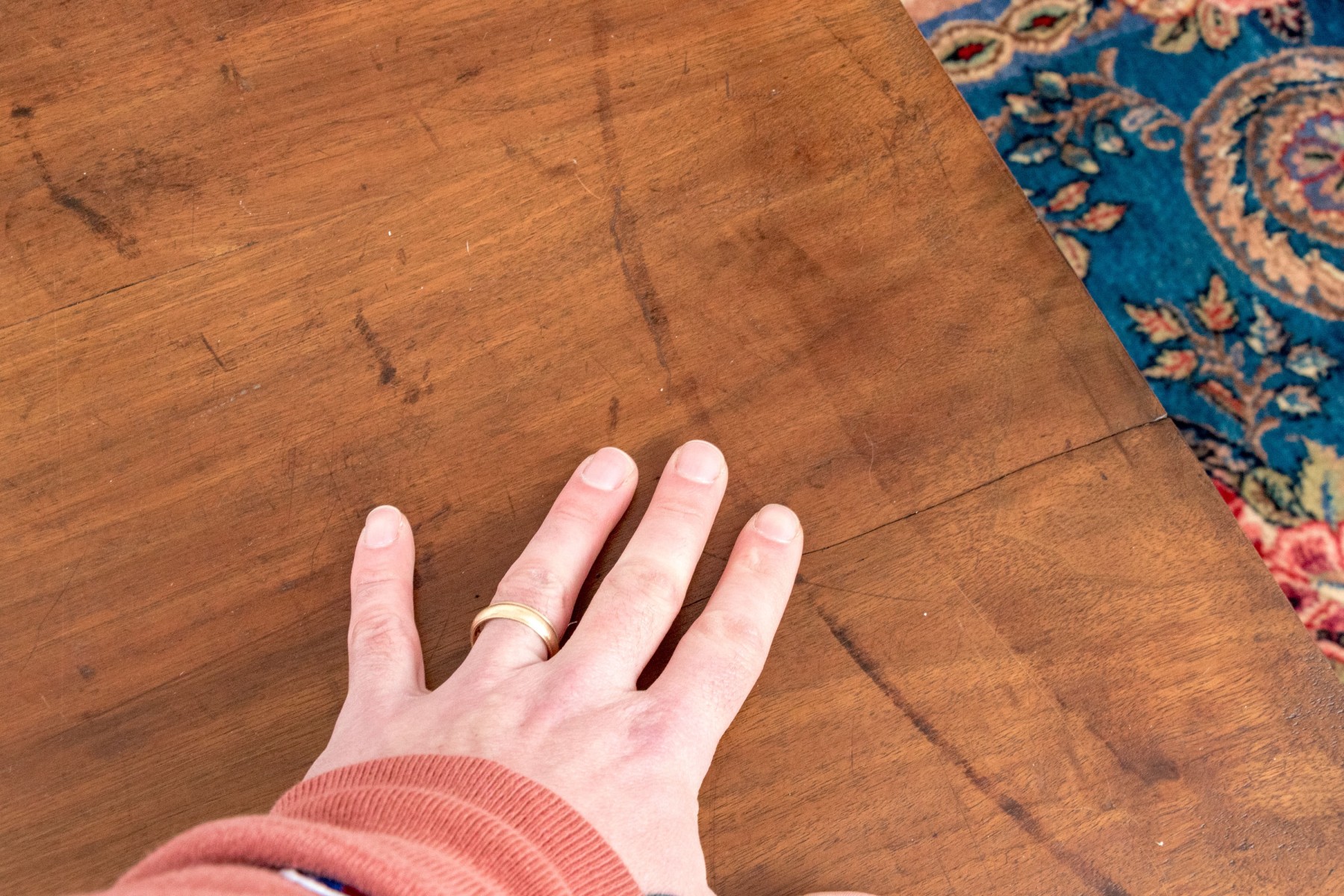 Presents well overall with wear commensurate with age and use including ring stains and scratches to the tabletop with checking to the center panel.