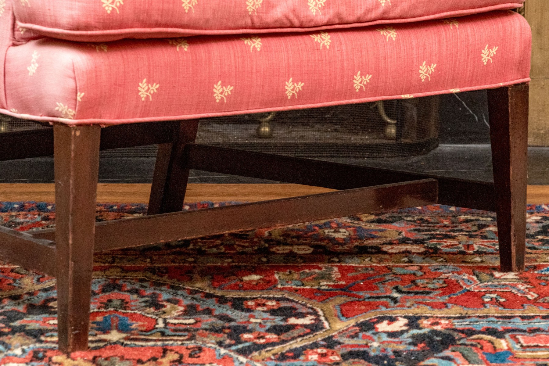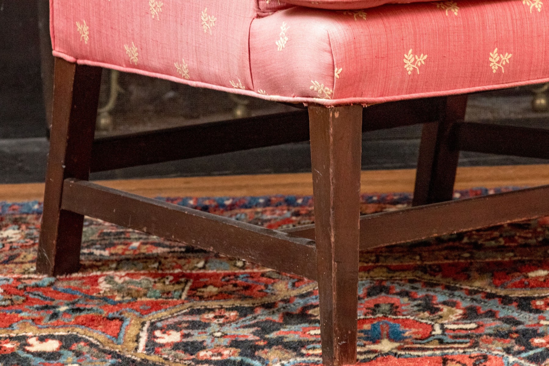 A wonderful Federal wingback armchair in classic form with a camelback and large flared wings with pipe trims, rolled arms, and a deep-set seat raised over a cherry frame in a dark brown finish with simple straight tapered legs and a stylized box stretcher.