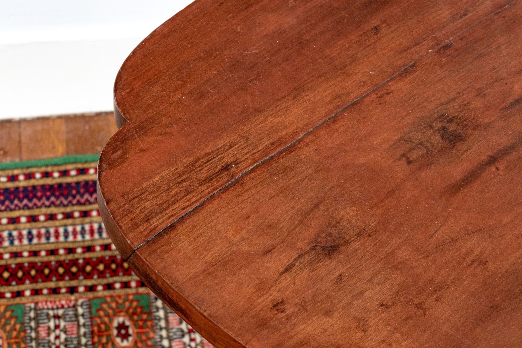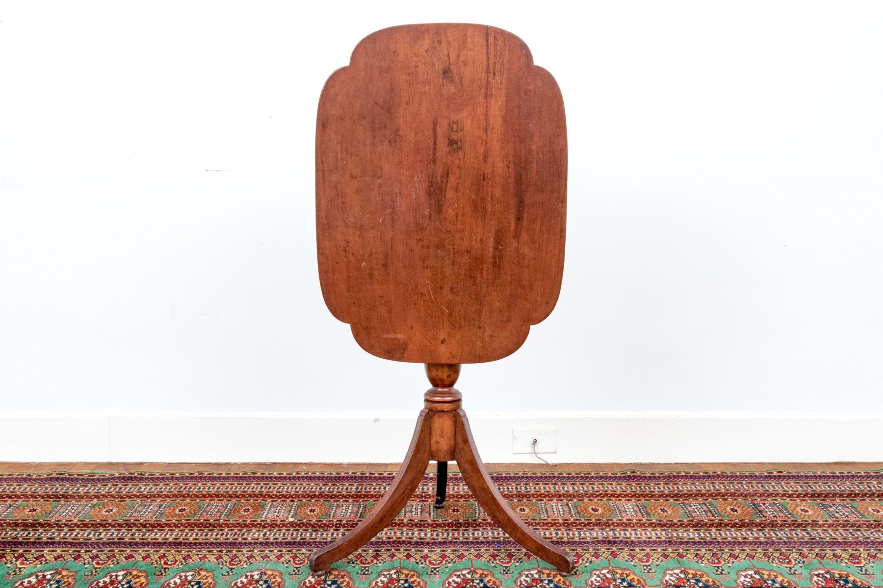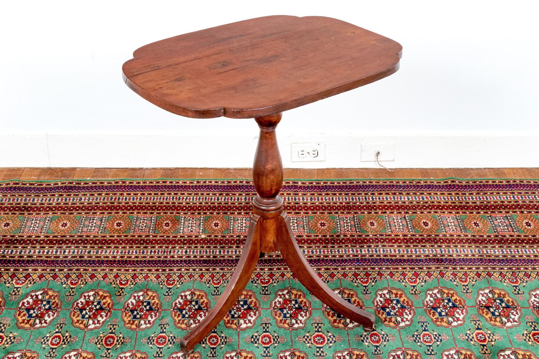 A delightful American Federal occasional table crafted in warm-toned medium brown cherry. The table sports an oval quatrefoil tilt top supported by a baluster column leading to a tripod of elegantly curved legs on bun feet.