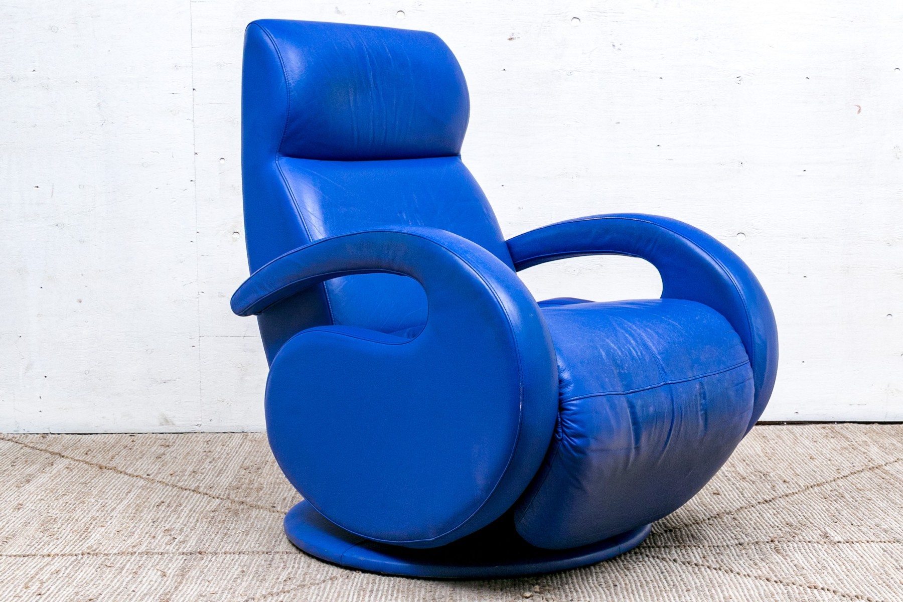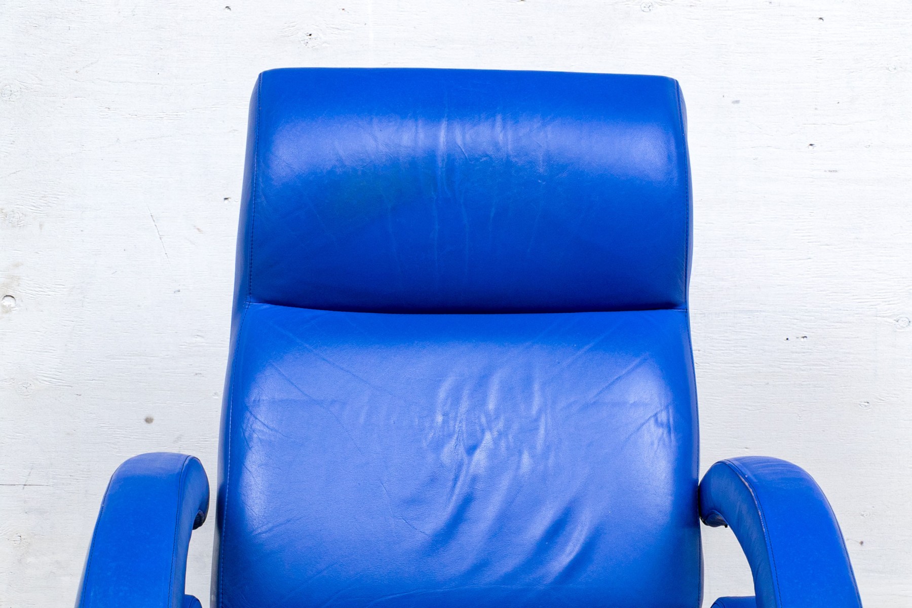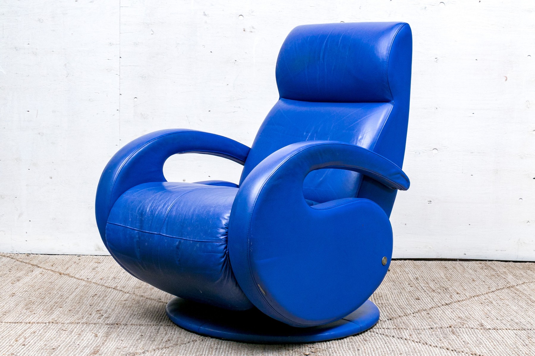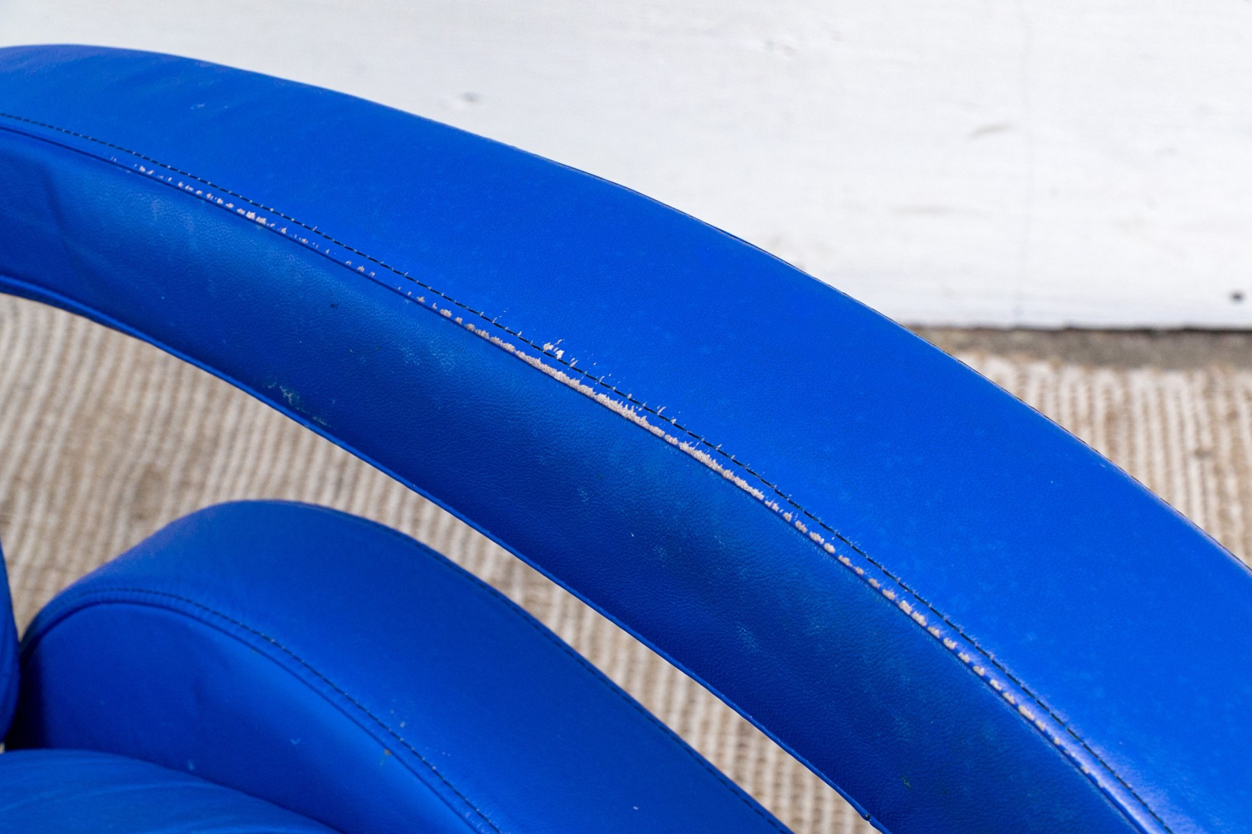 A large scale club chair with sloping back on a swivel base all in bright blue. The chair with large curved arms open at the sides.