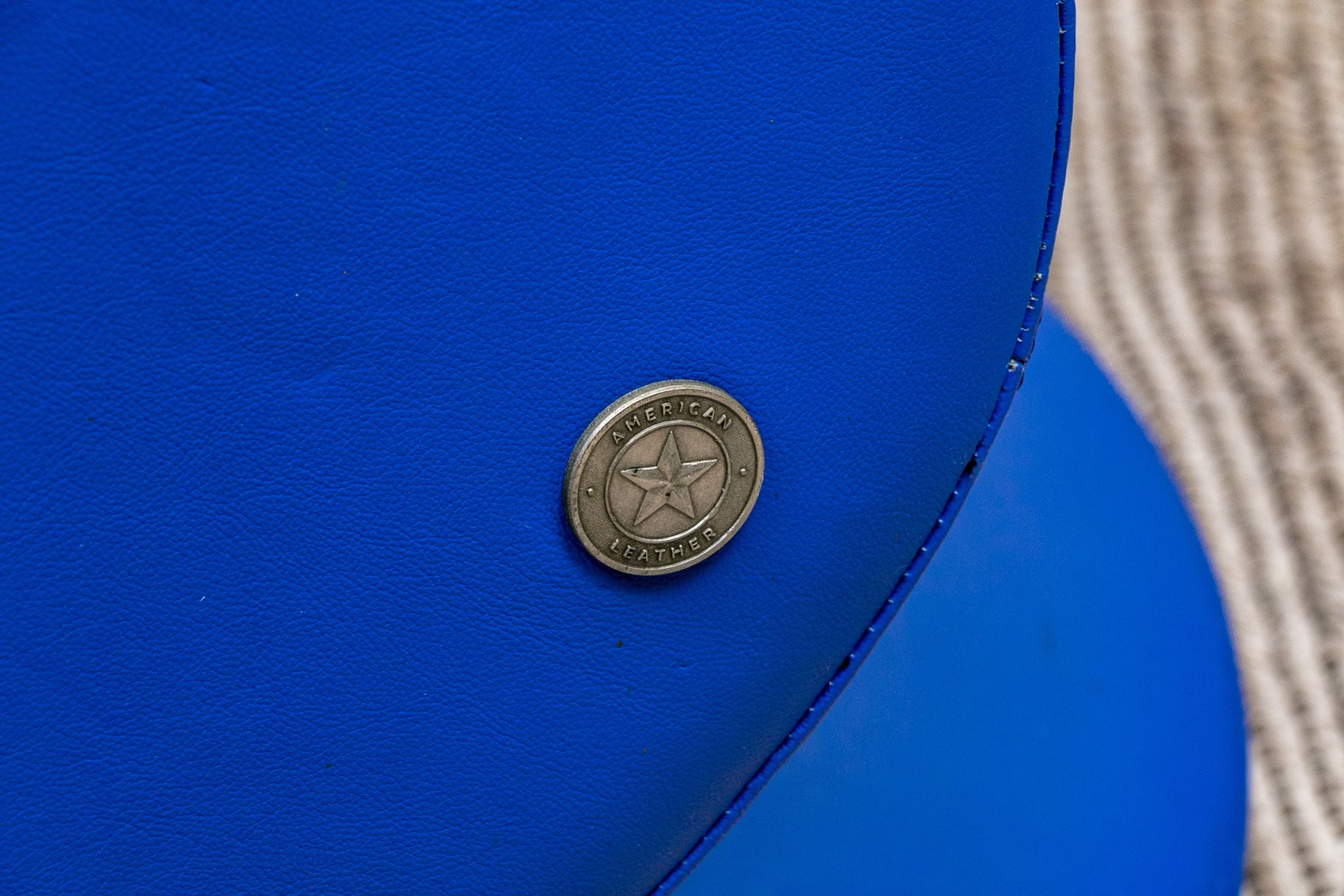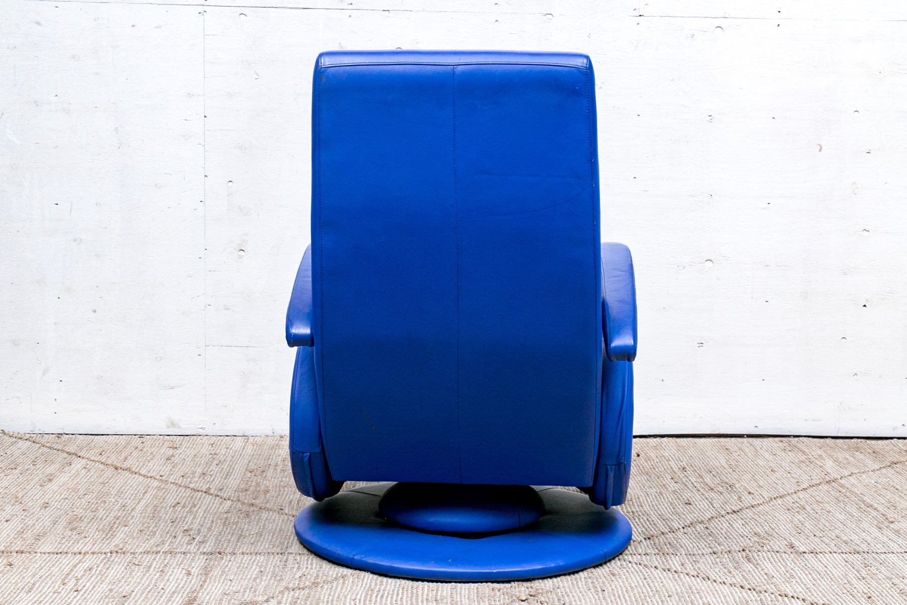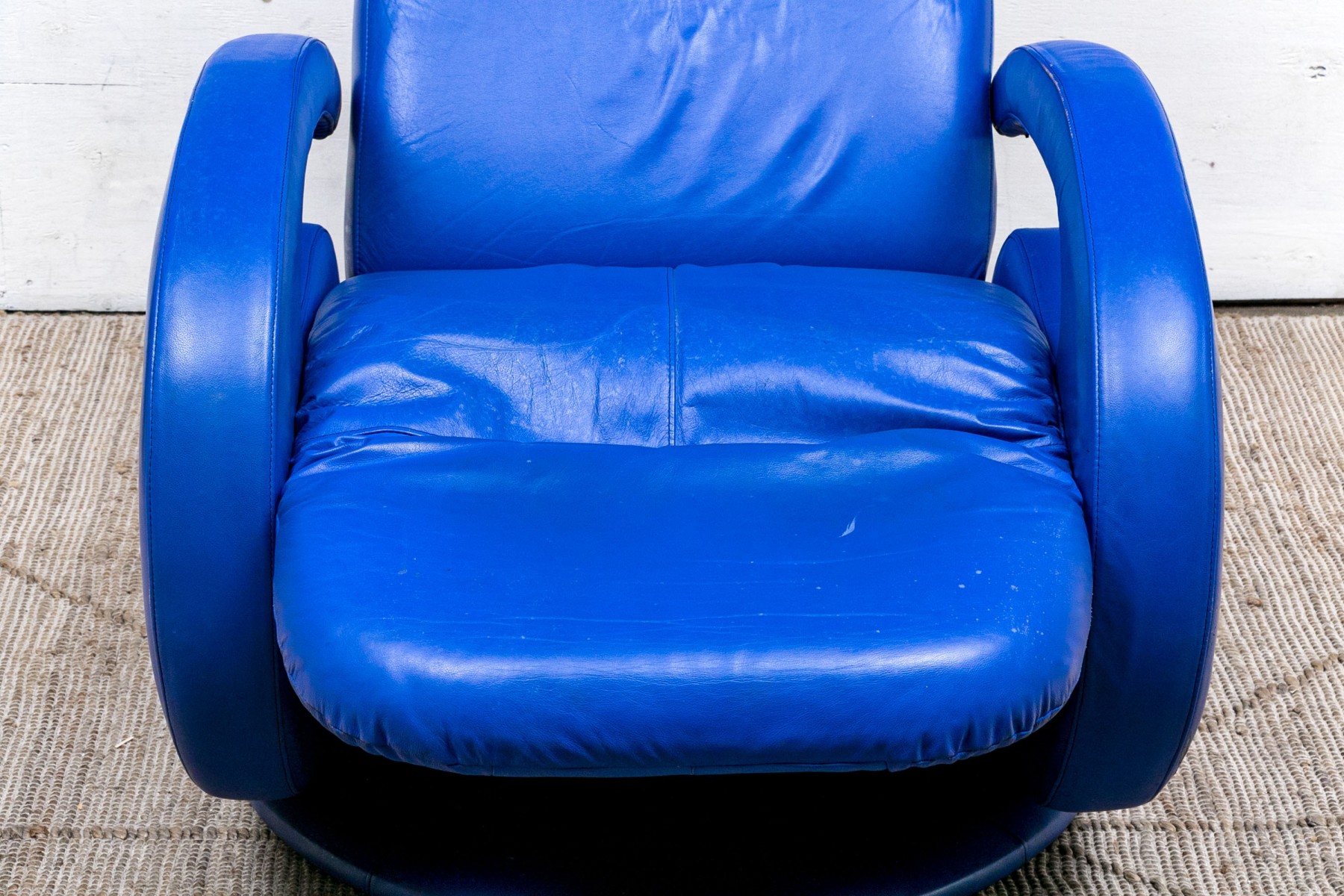 A large scale club chair with sloping back on a swivel base all in bright blue. The chair with large curved arms open at the sides.