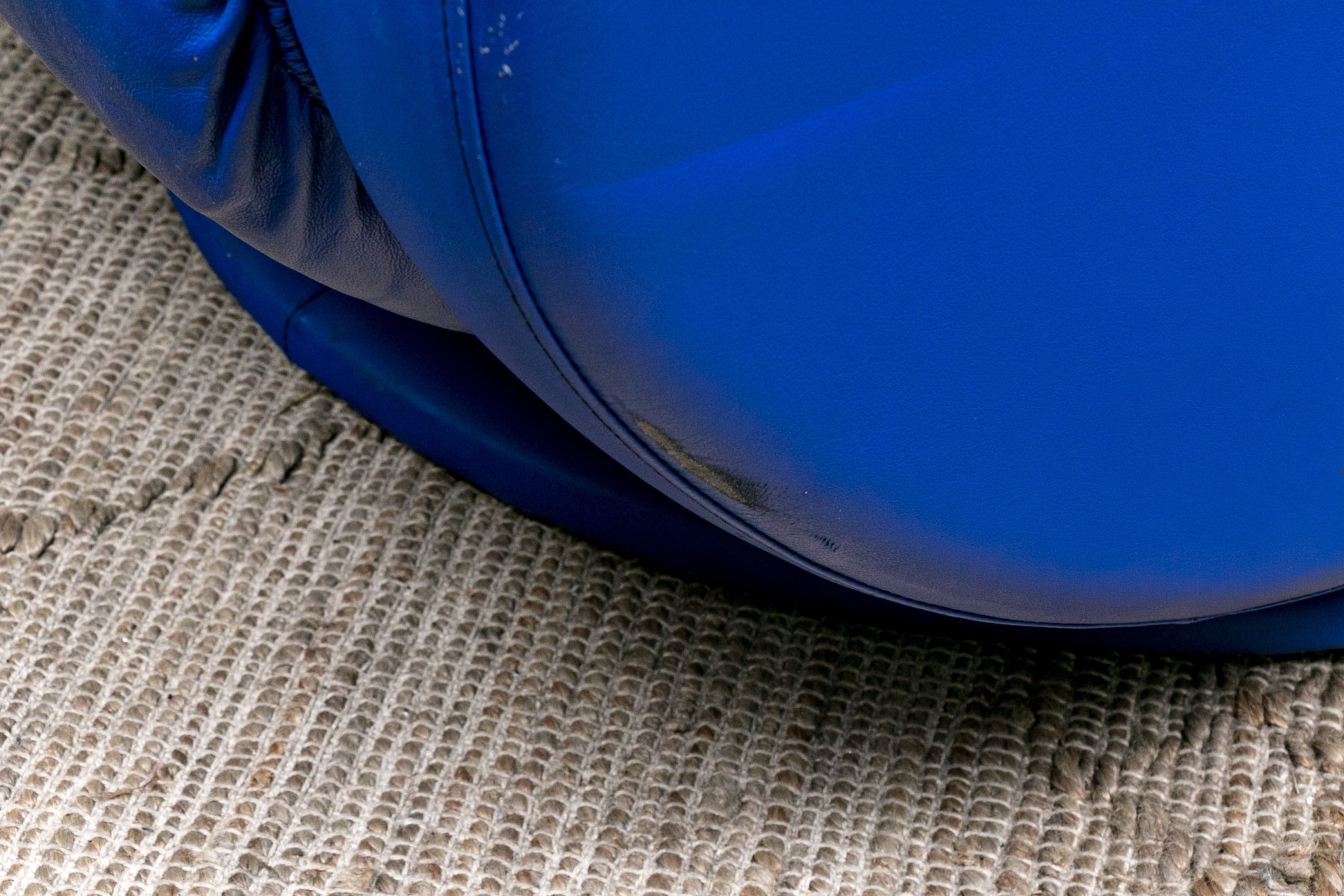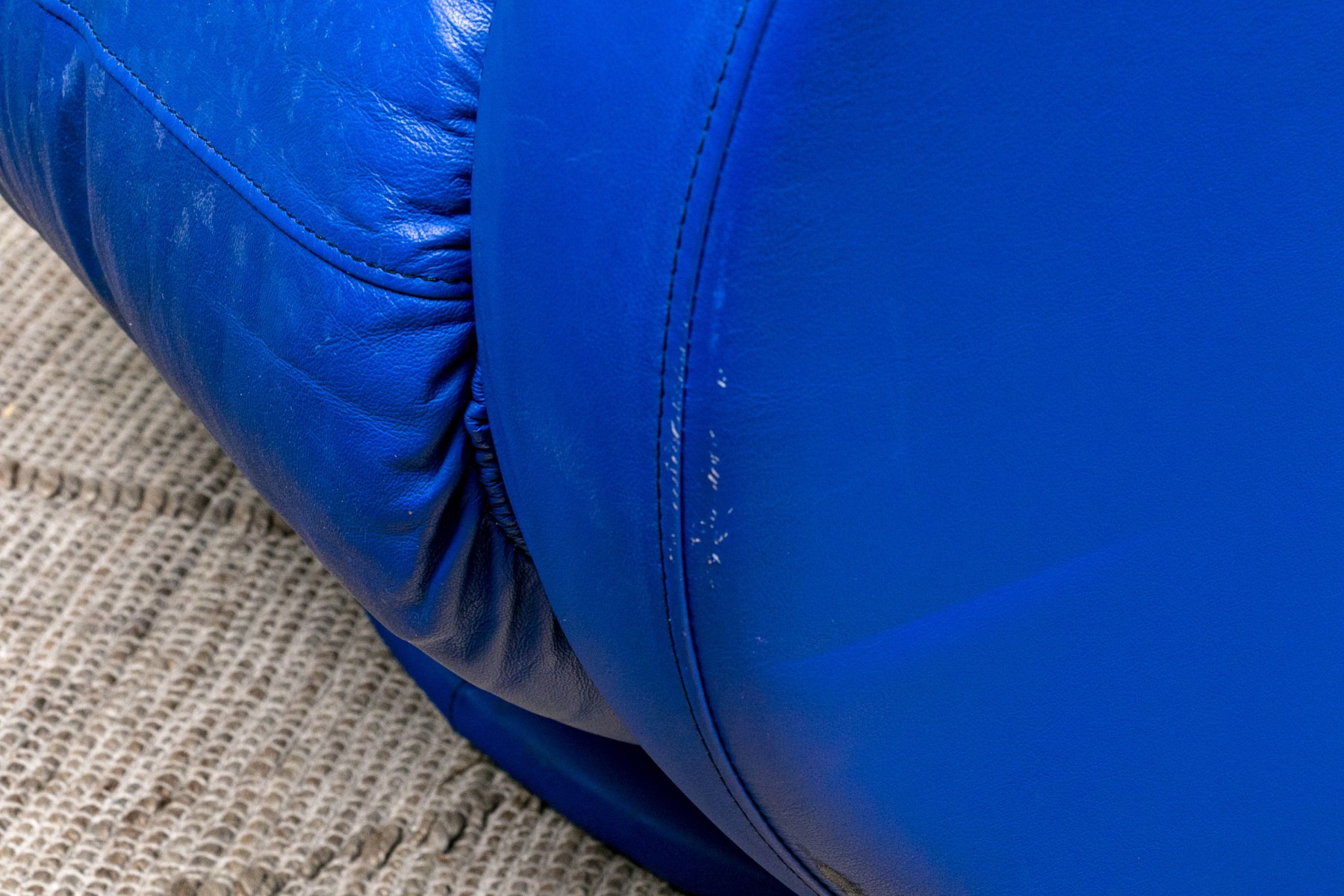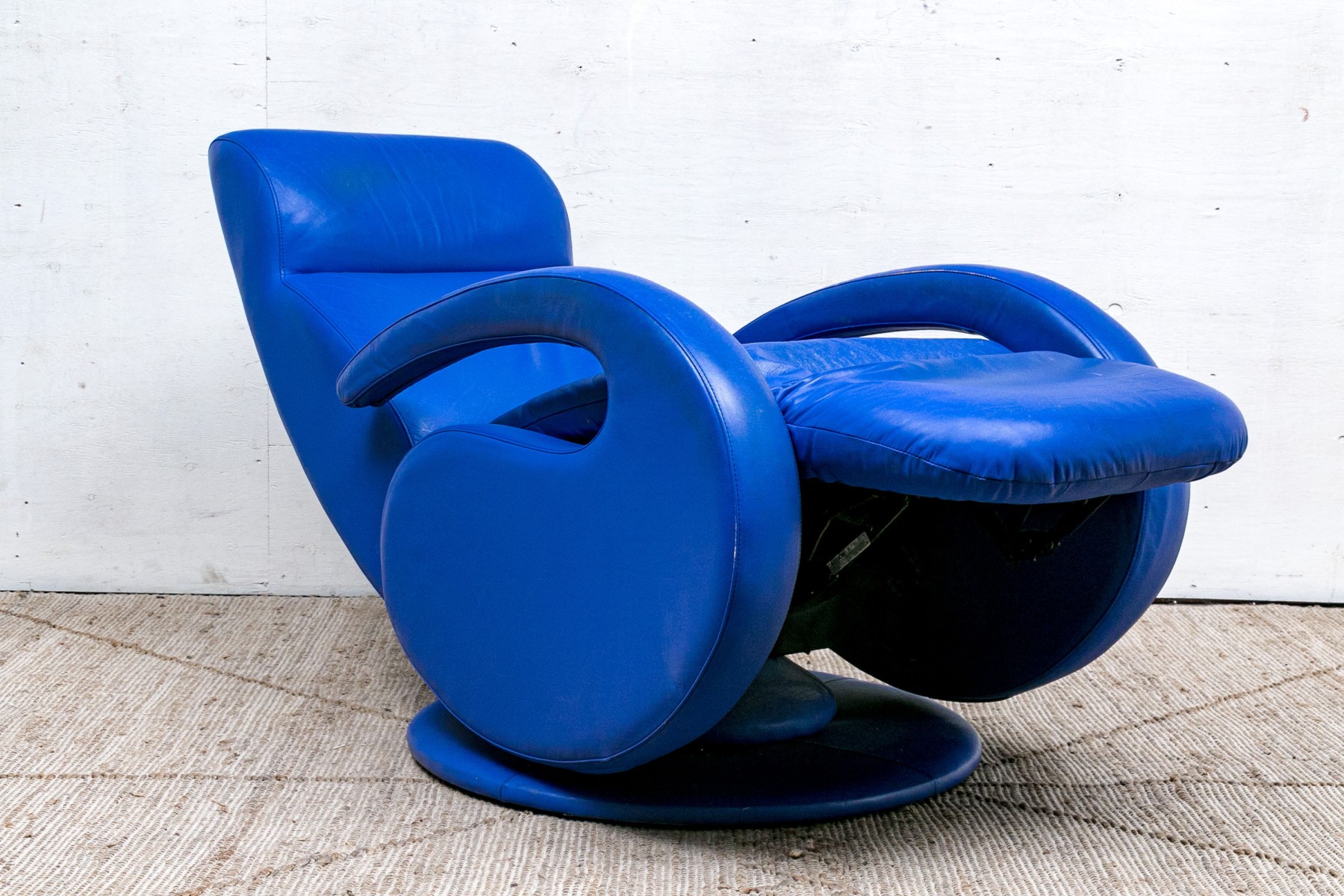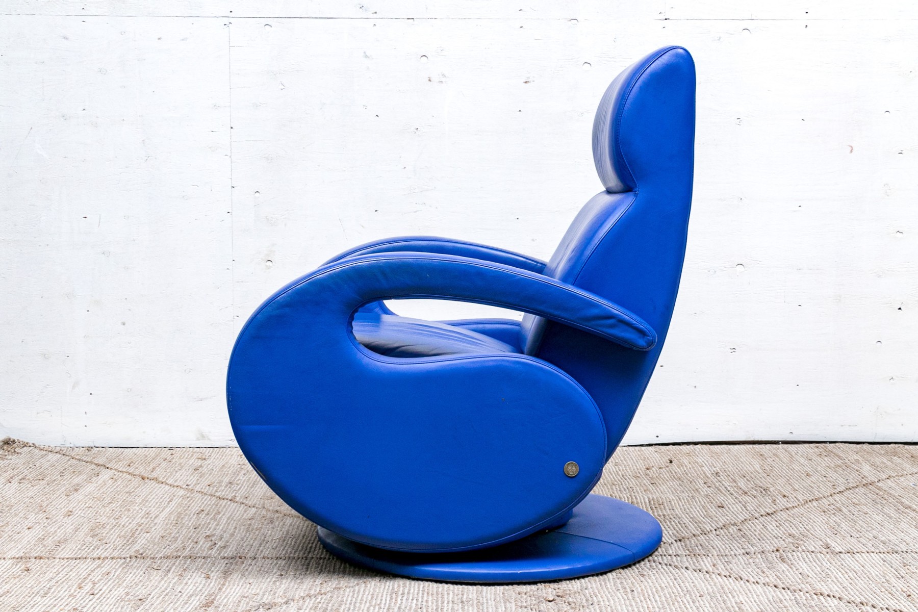 A large scale club chair with sloping back on a swivel base all in bright blue. The chair with large curved arms open at the sides.