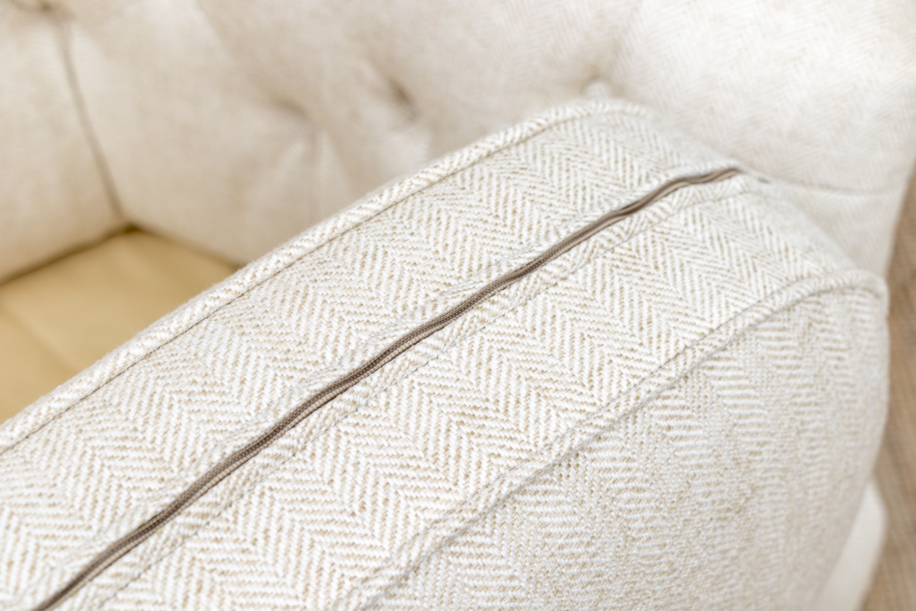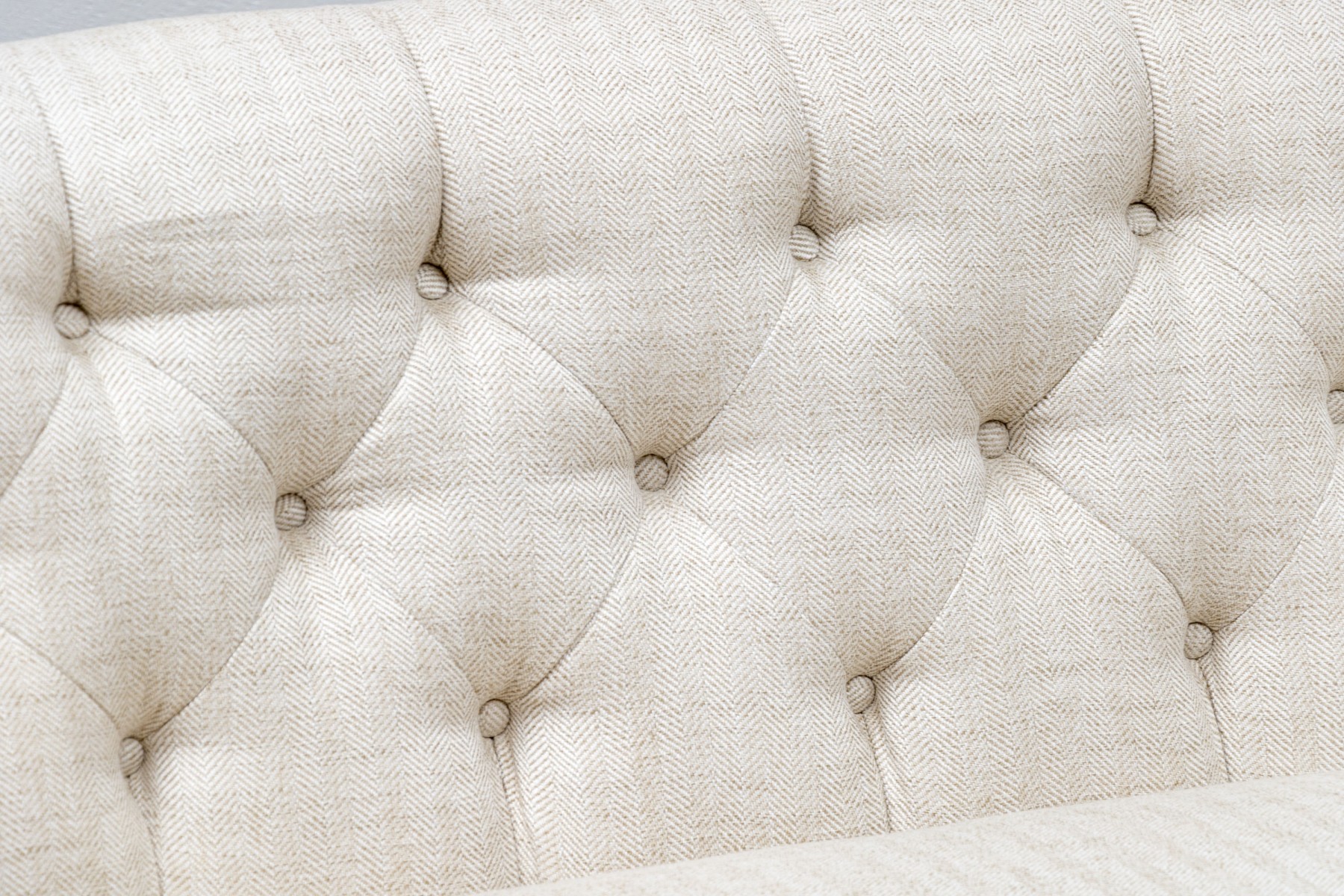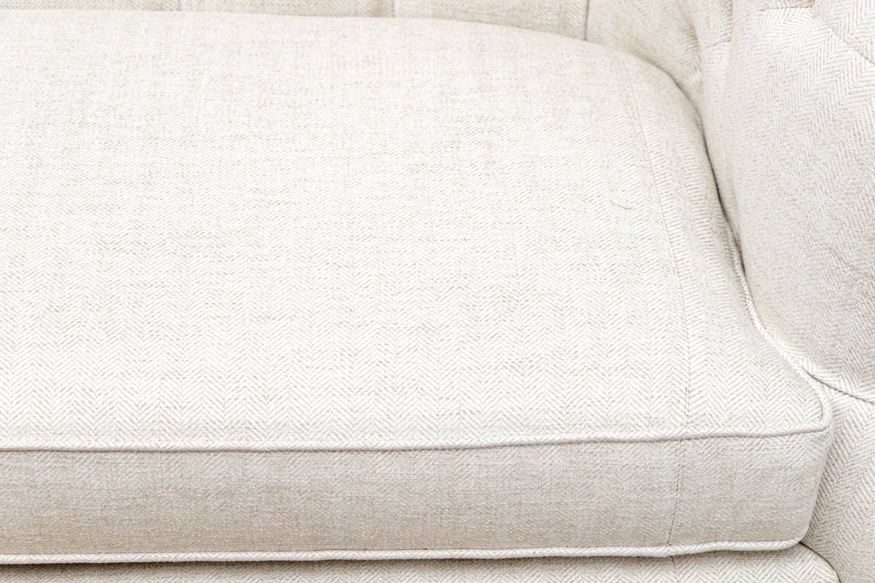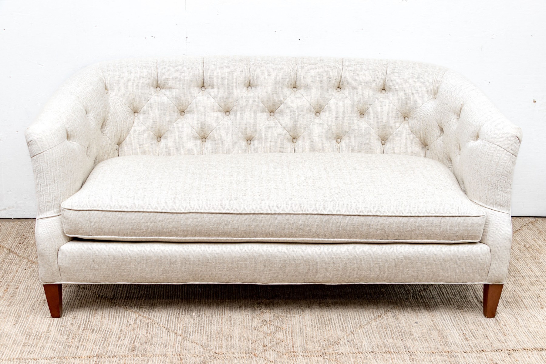 The upholstered settee with a single upholstered seat cushion with piped trim. The settee with a button tufted seat back and arms with slight flare to the ends of the arms.