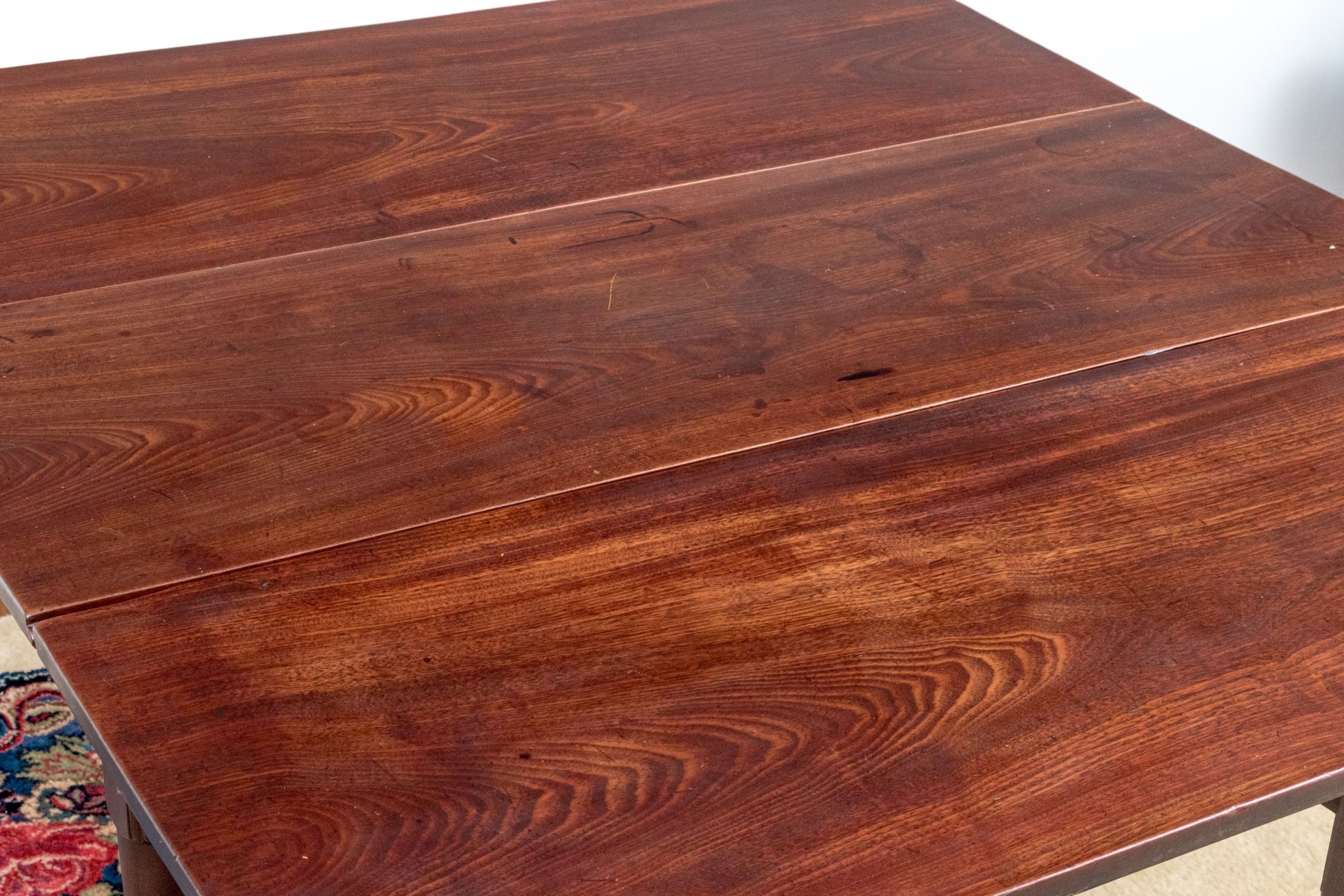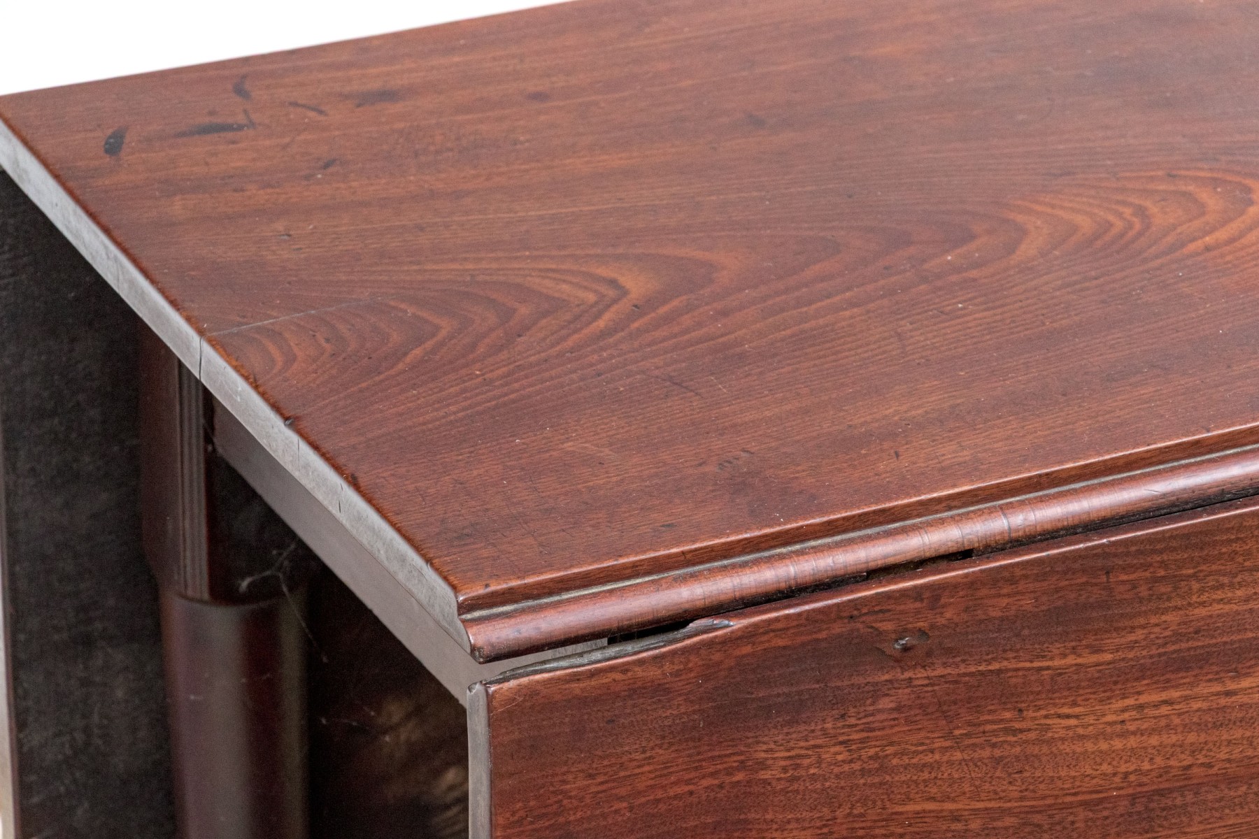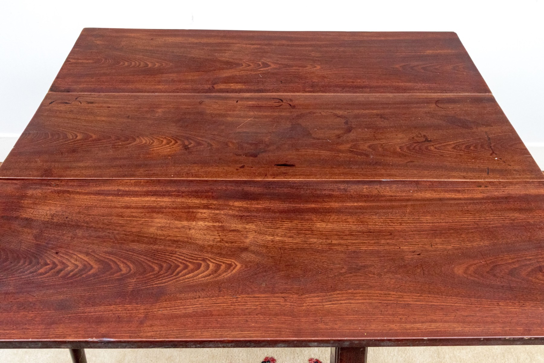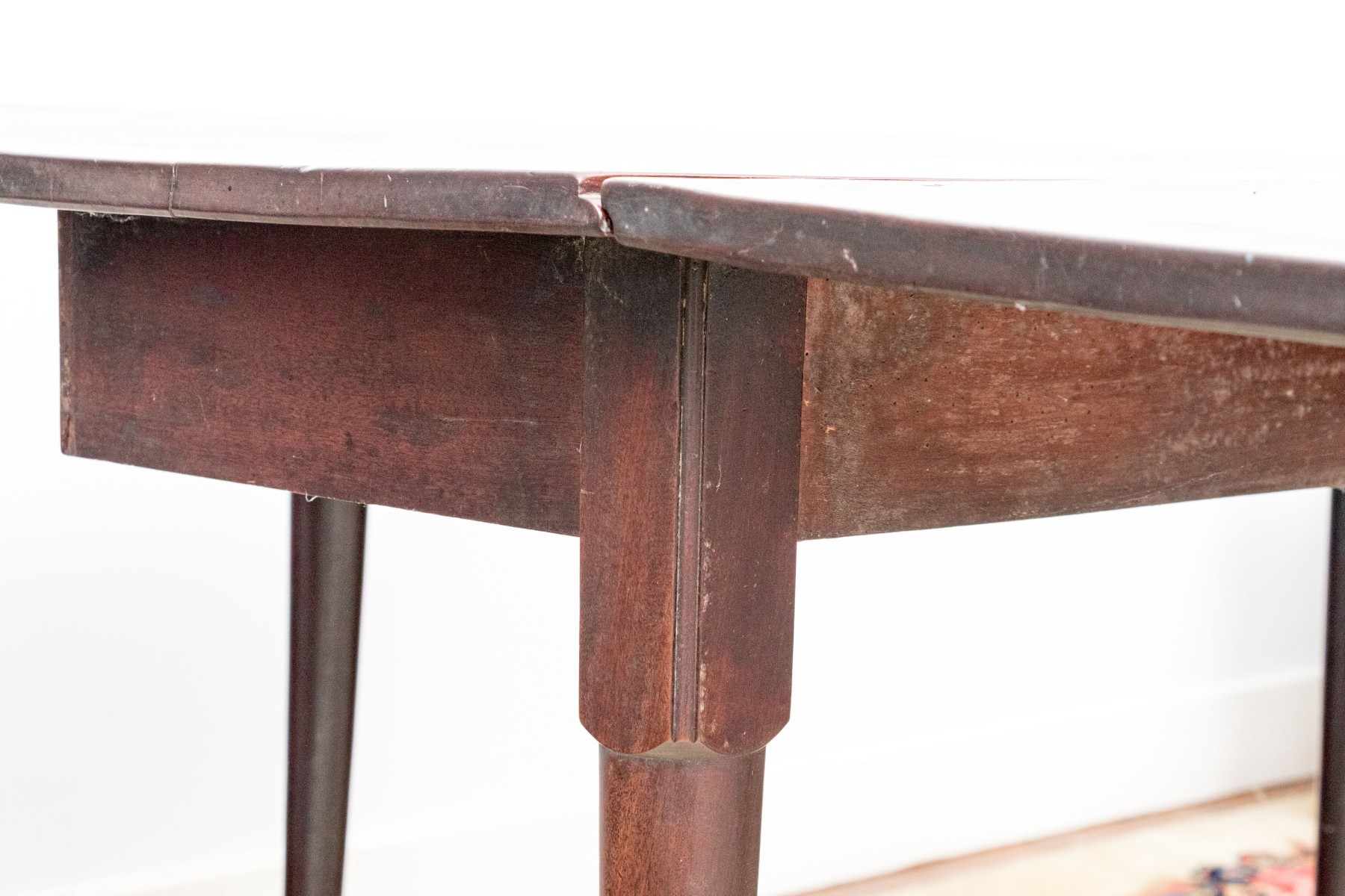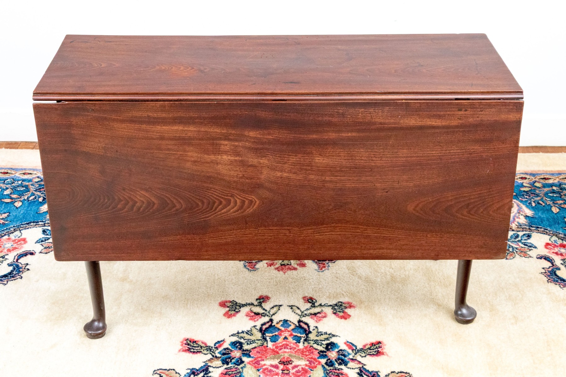 A fine antique American Queen Anne drop leaf table showcasing rich deep brown mahogany. The table sports extra long rectangular leaves raised over a simple straight apron on cylindrical legs flaring out to pad feet.