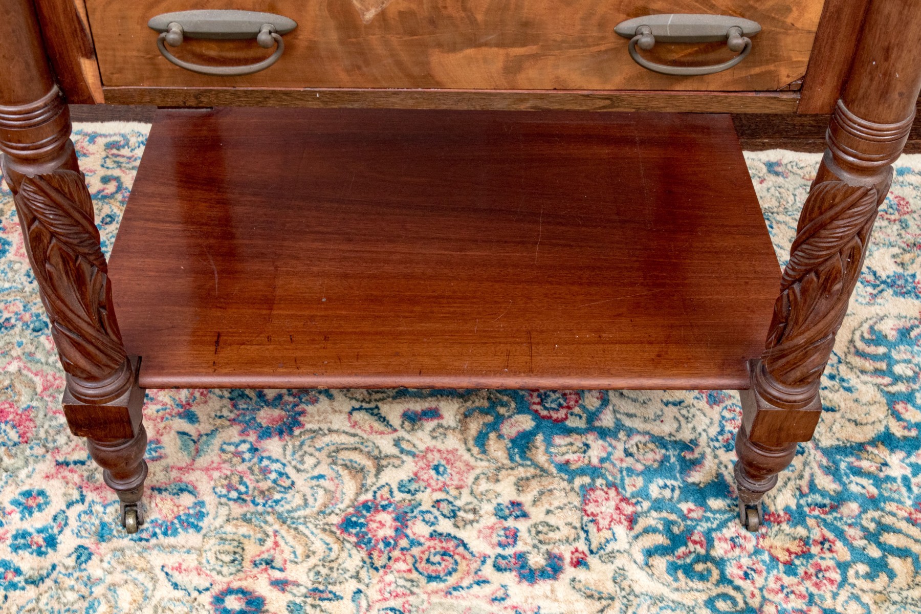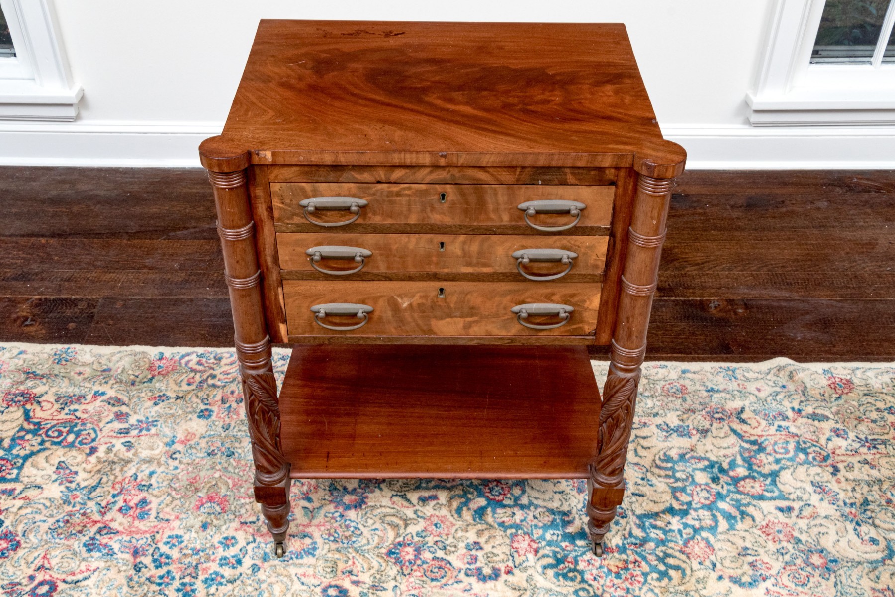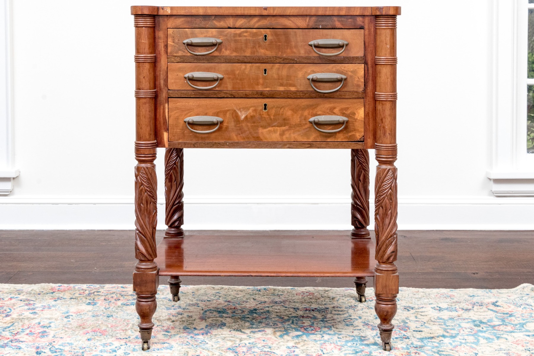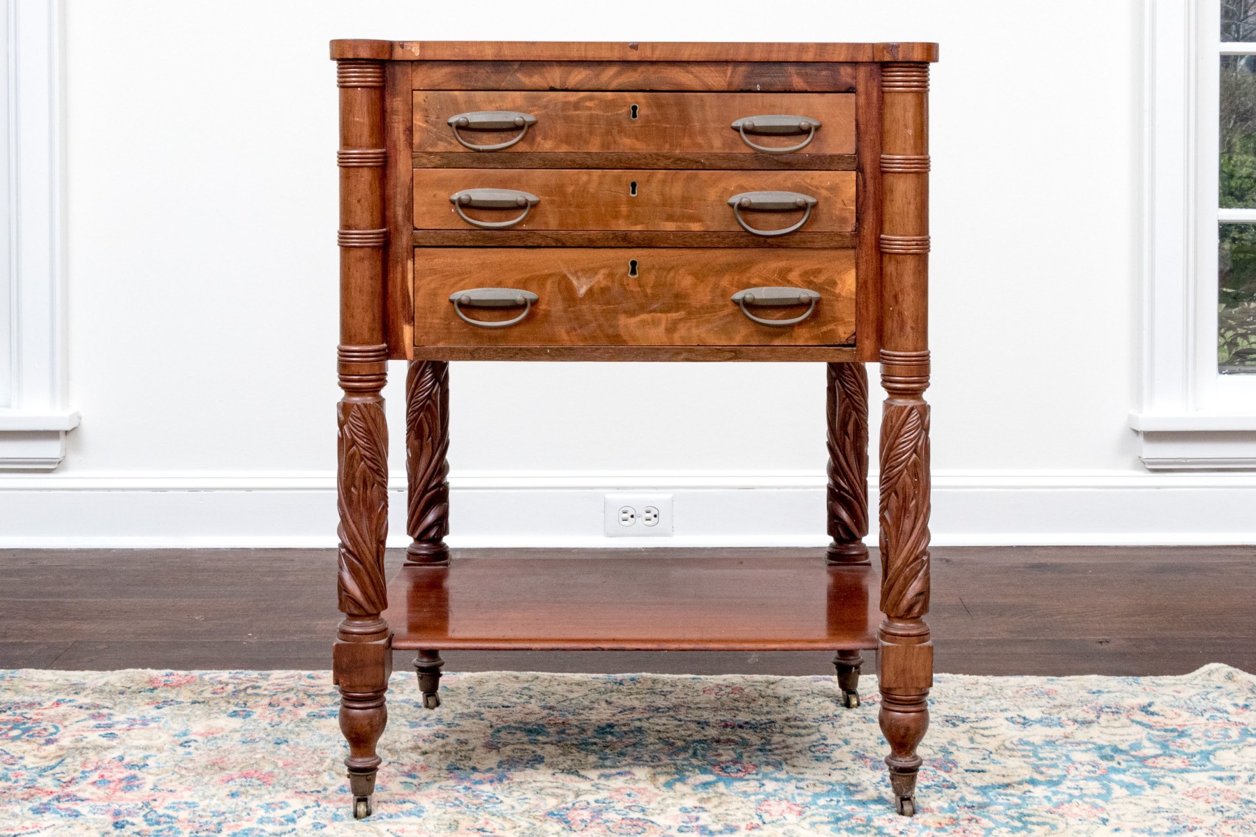 Mahogany with cookie corners and acanthus hand carved leaves. Three graduated drawers with lower shelf.