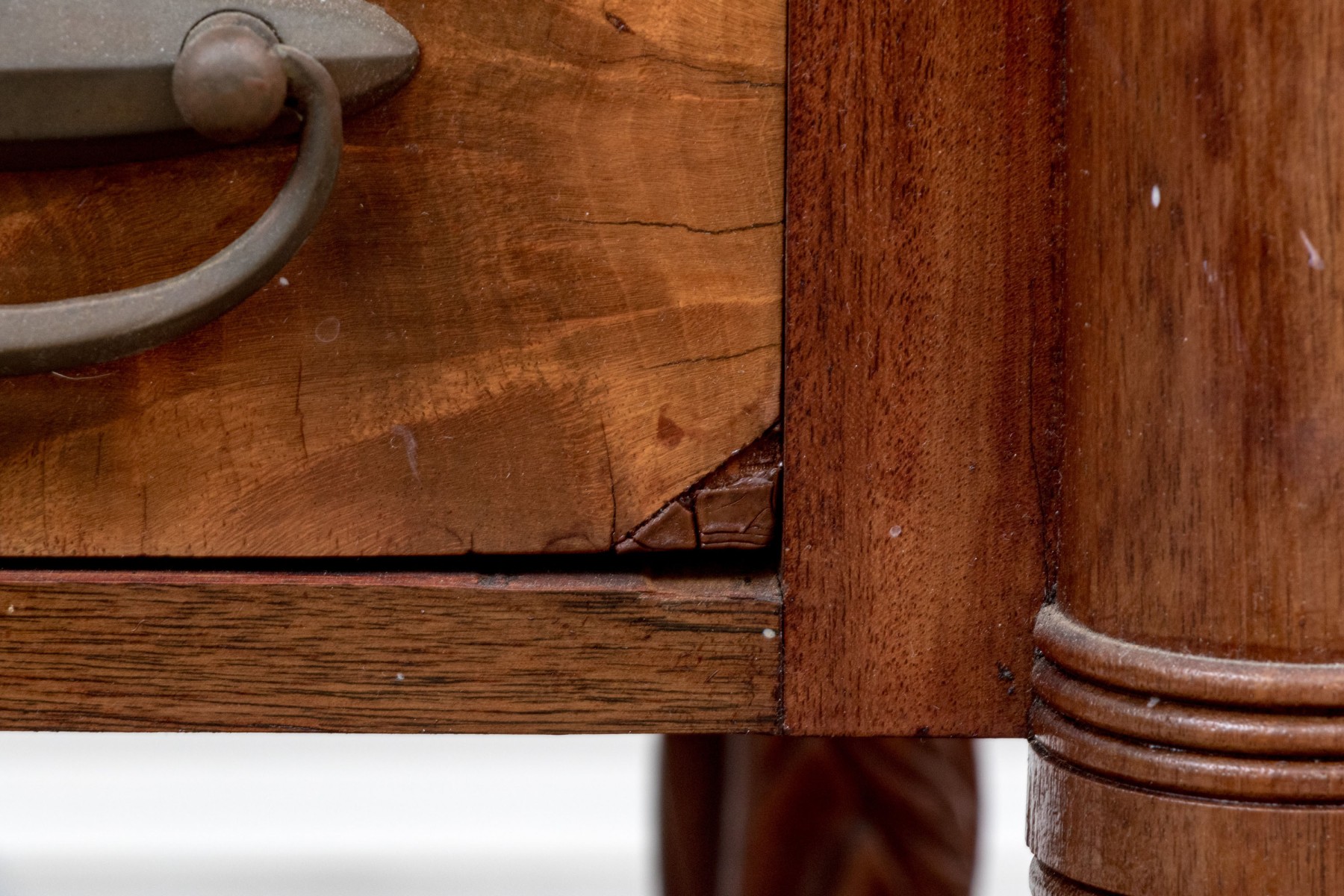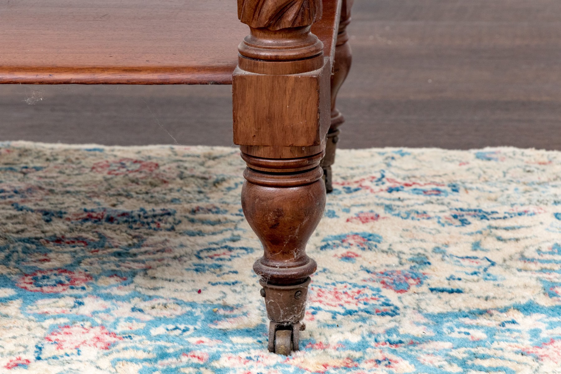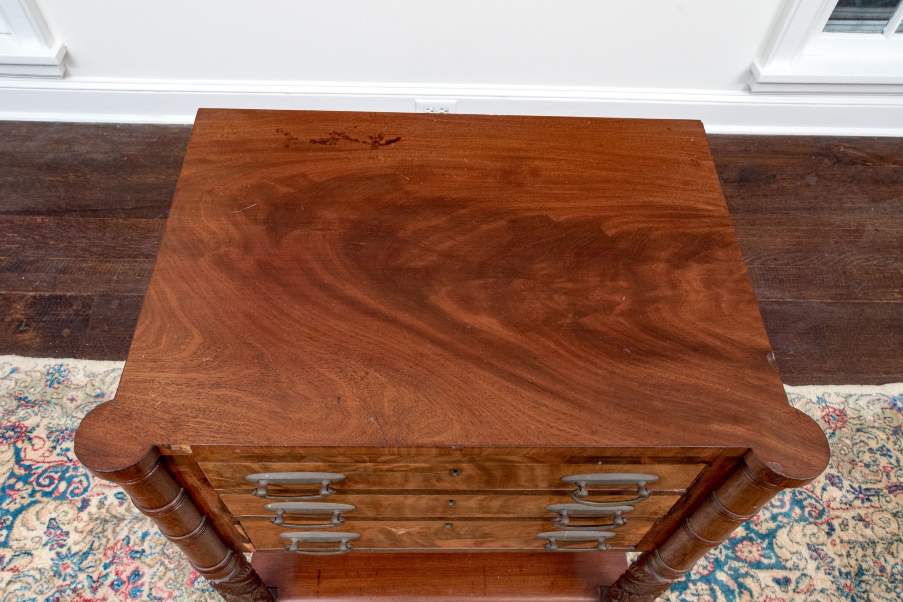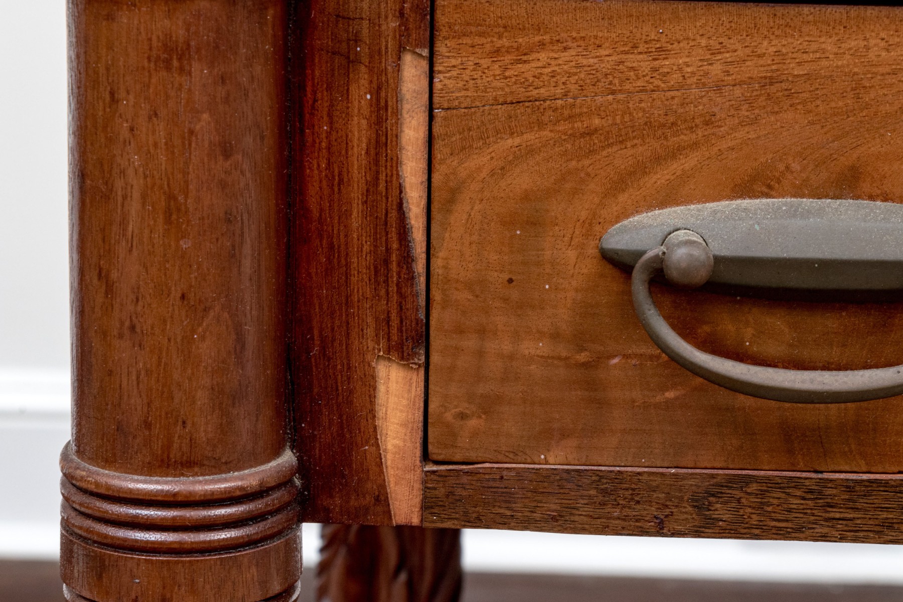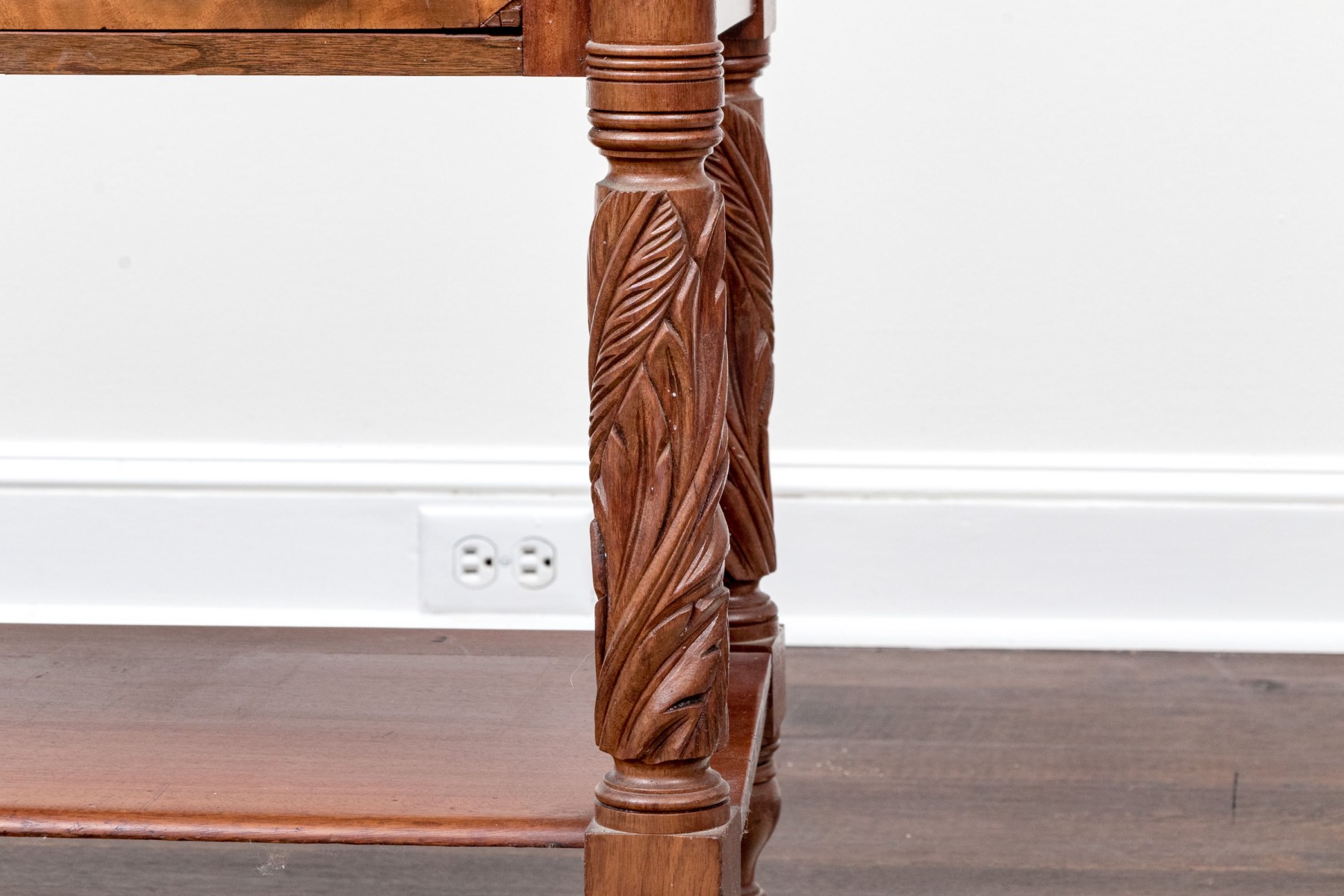 Mahogany with cookie corners and acanthus hand carved leaves. Three graduated drawers with lower shelf.