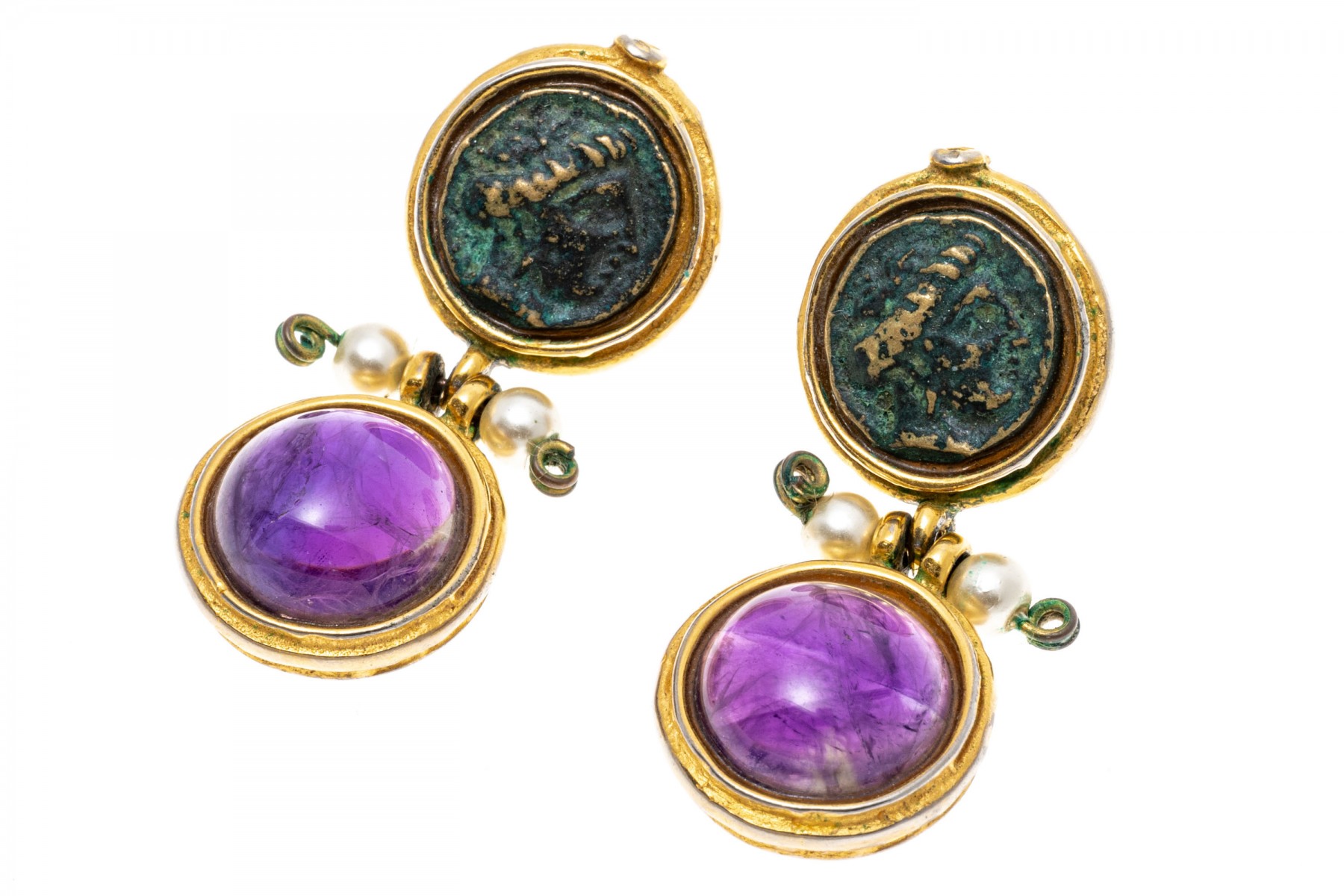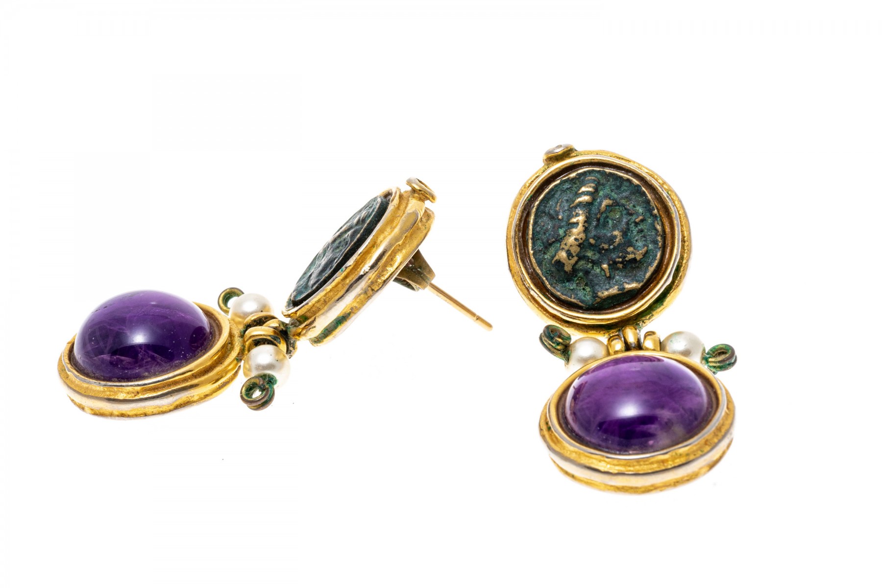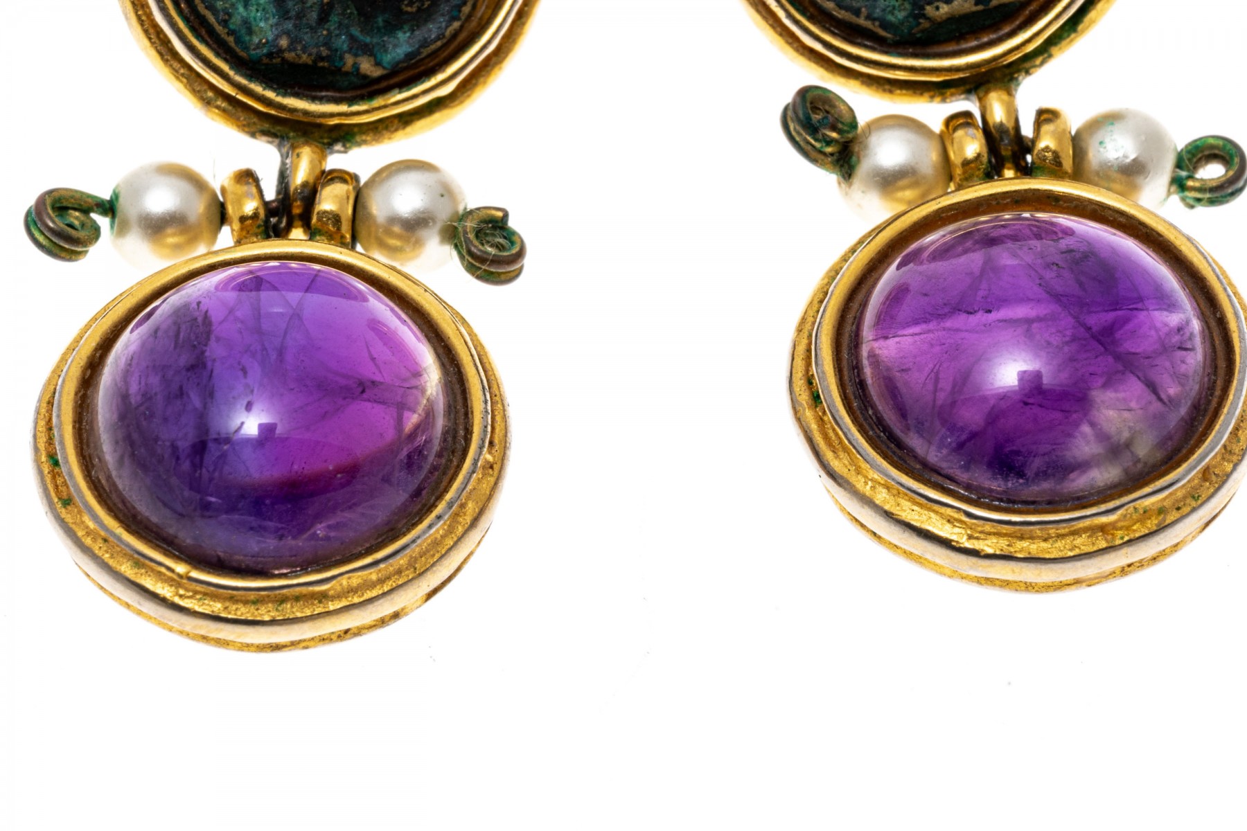 Rustic pendant earrings. The top of the earrings are set with medallion accents while round cabochon cut amethyst are suspended from the base. Faux pearls accent the center hinge. Post and clutch backings.