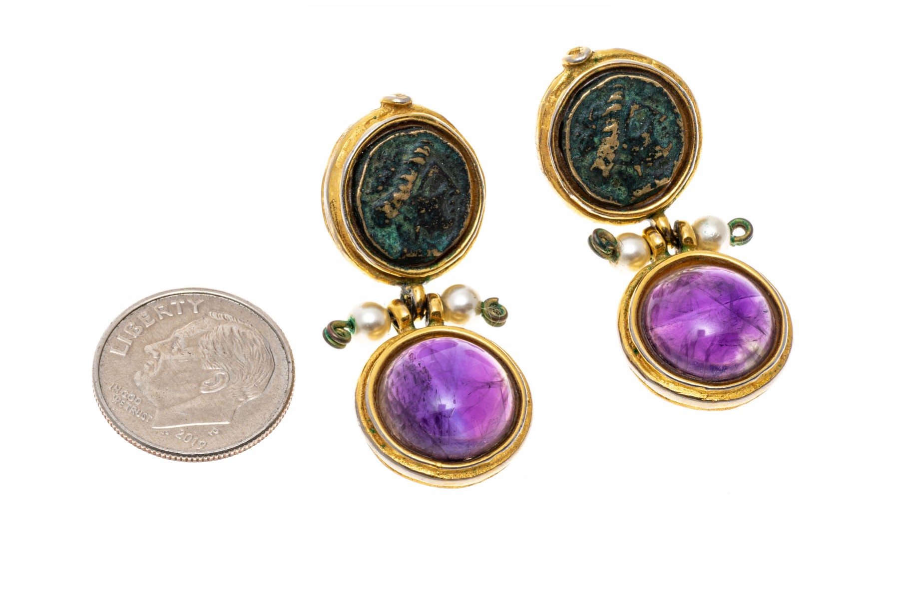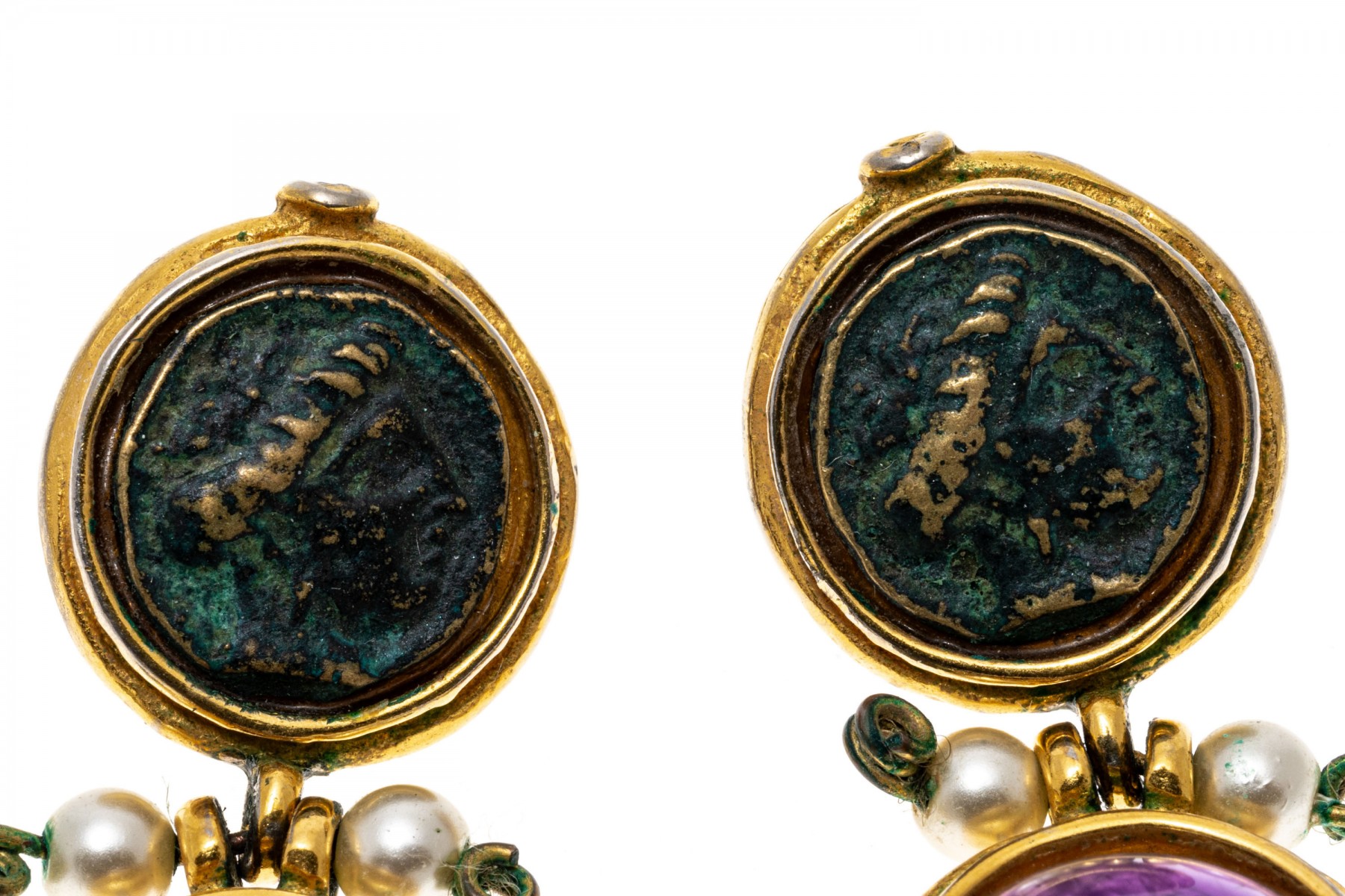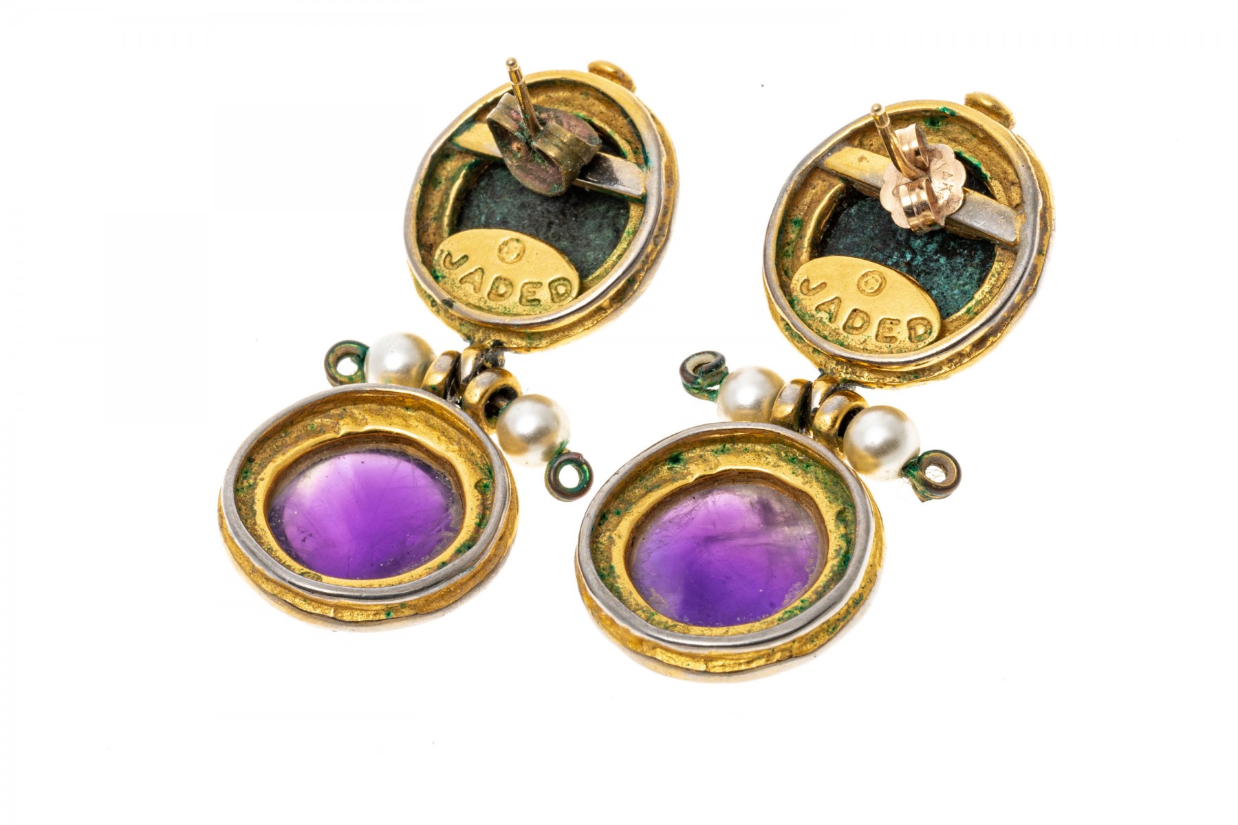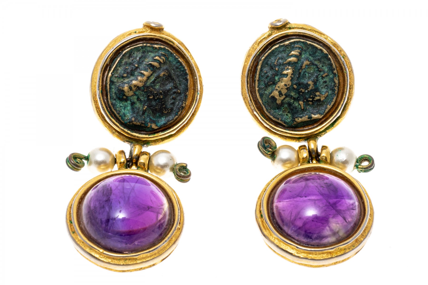 Rustic pendant earrings. The top of the earrings are set with medallion accents while round cabochon cut amethyst are suspended from the base. Faux pearls accent the center hinge. Post and clutch backings.