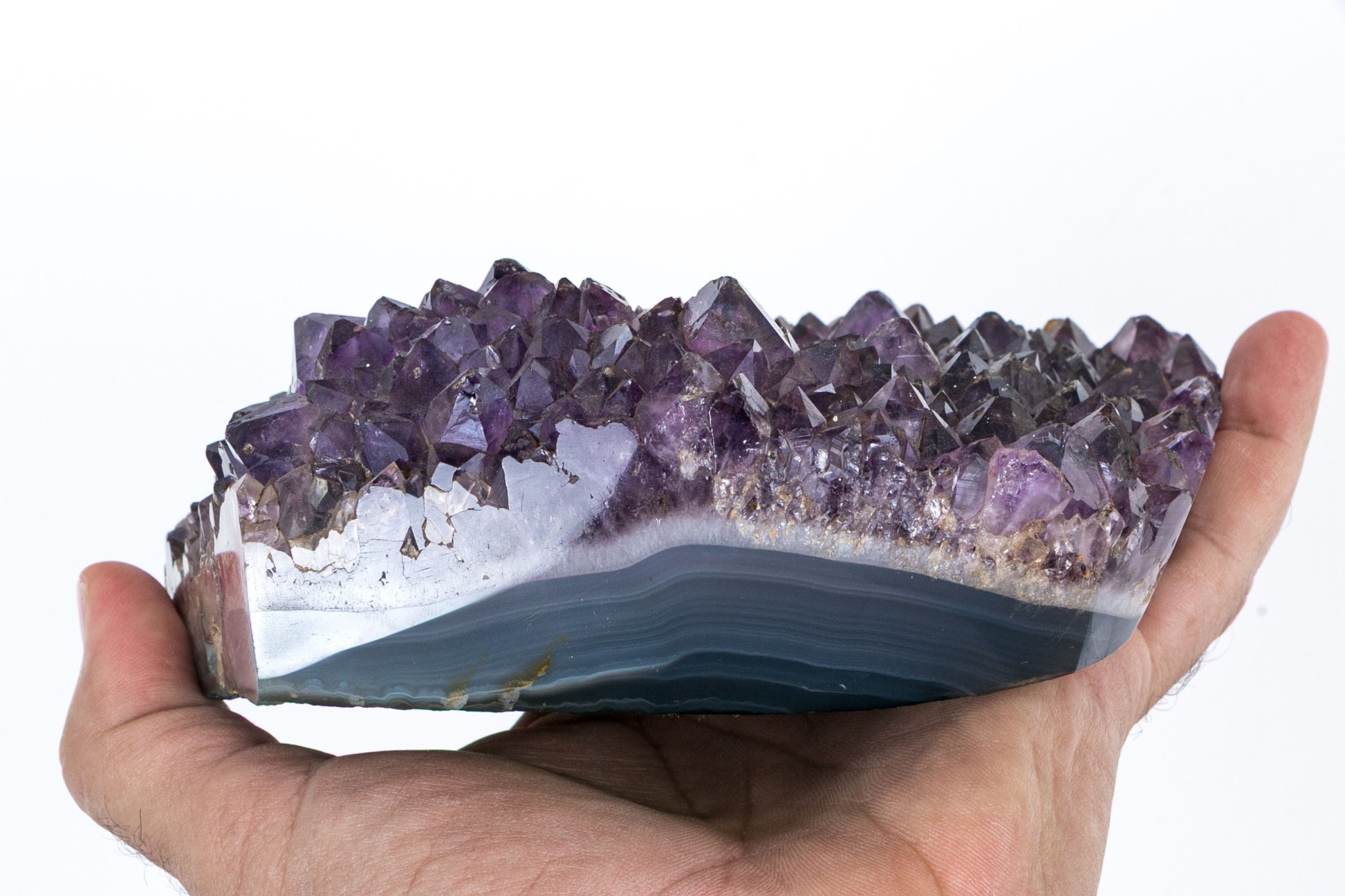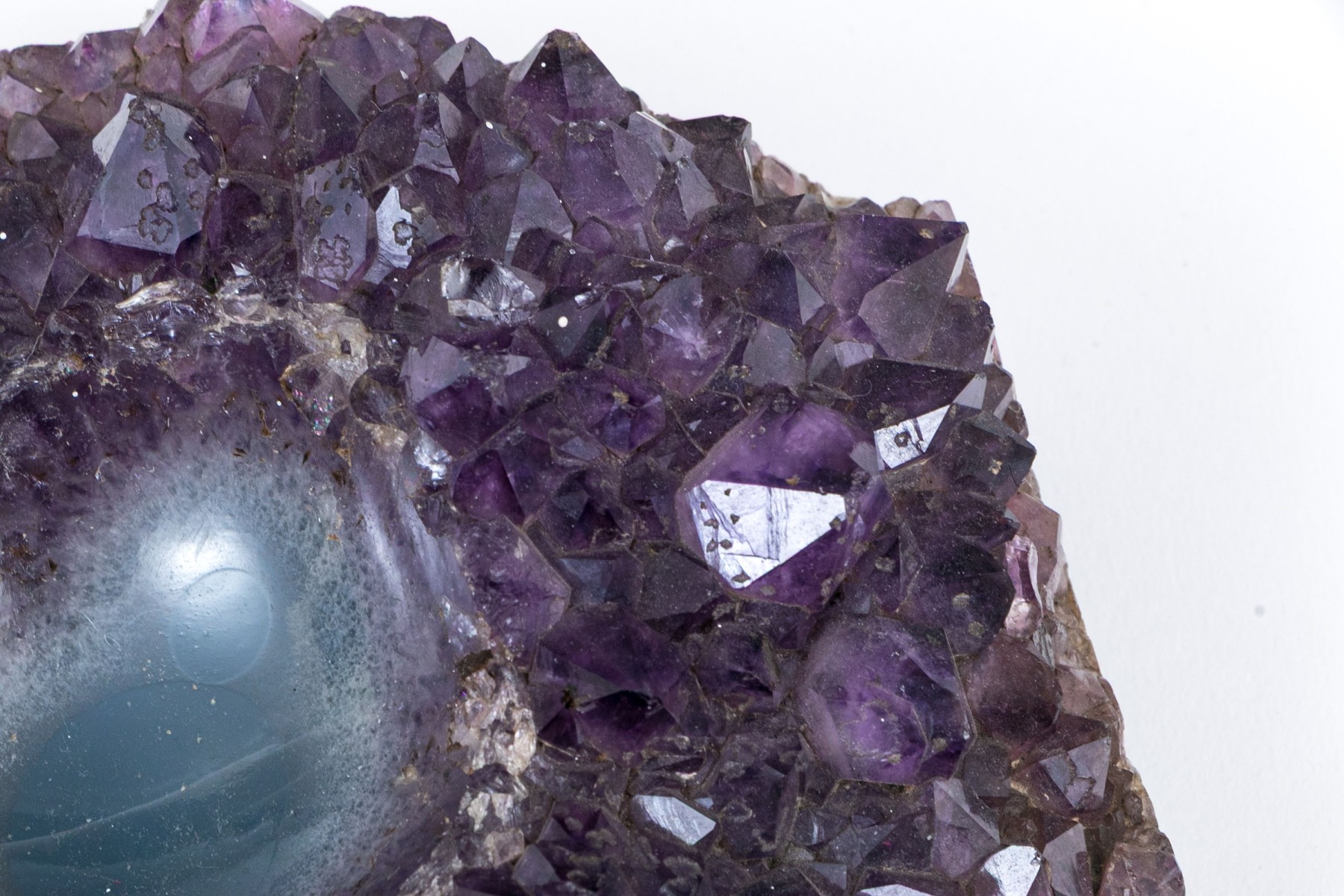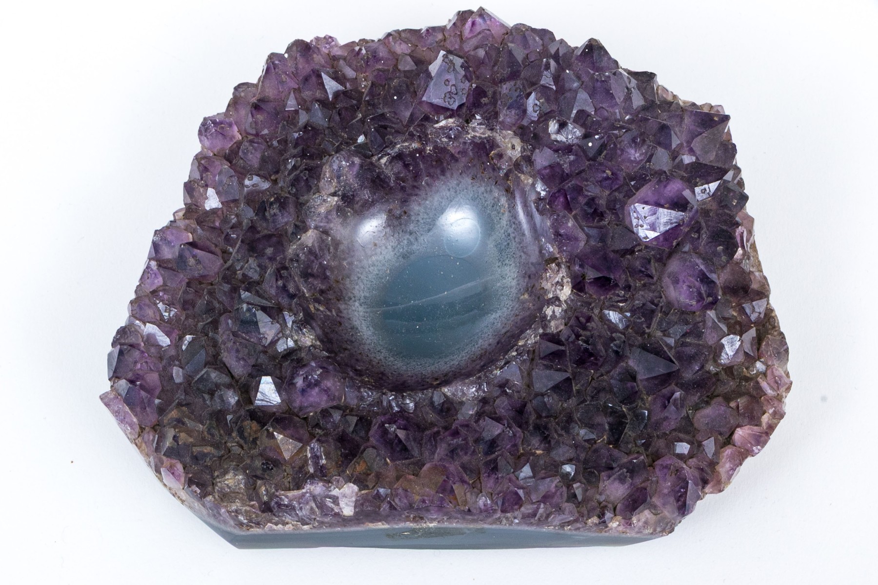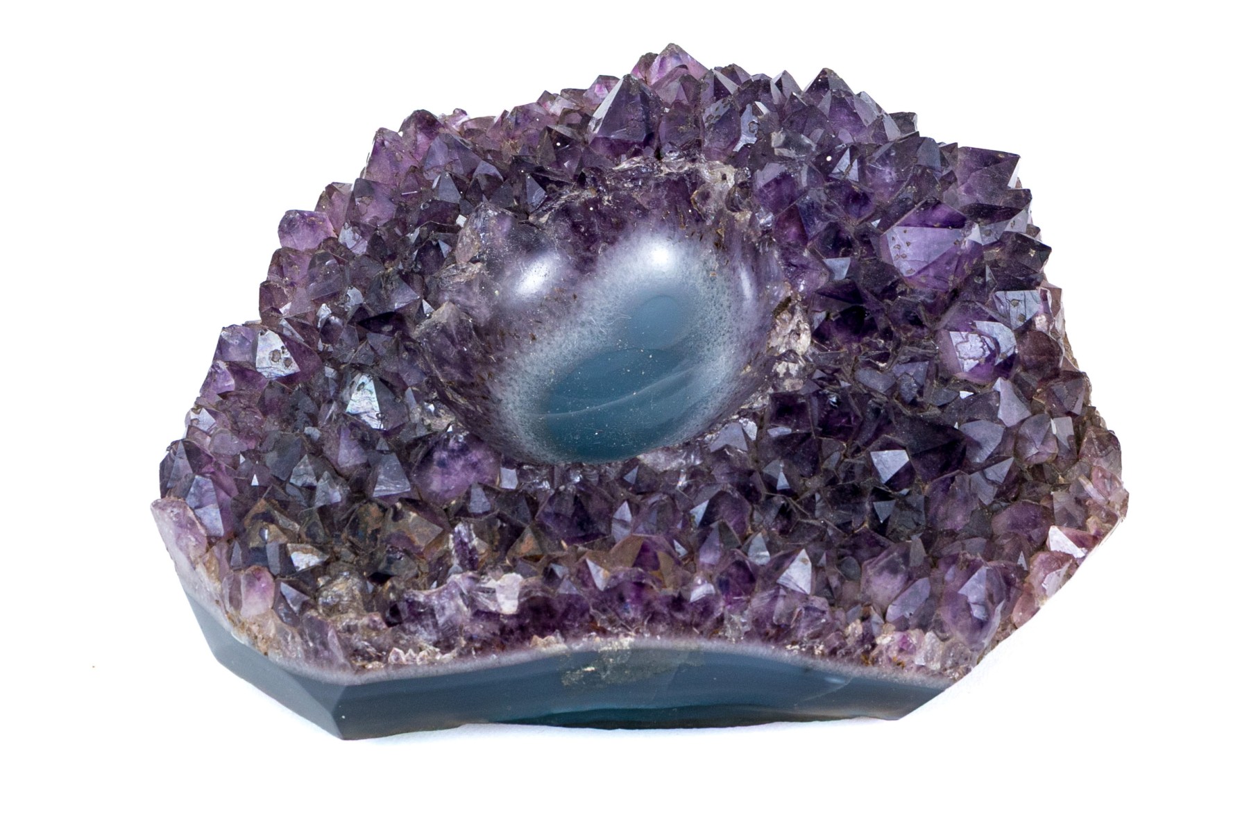 A gorgeous amethyst specimen with deep purple color and fine texture throughout, featuring a rounded center recession perfect for use as a votive, ashtray, trinket dish, or simply as a point of focal interest, revealing the dark blue stone below.
