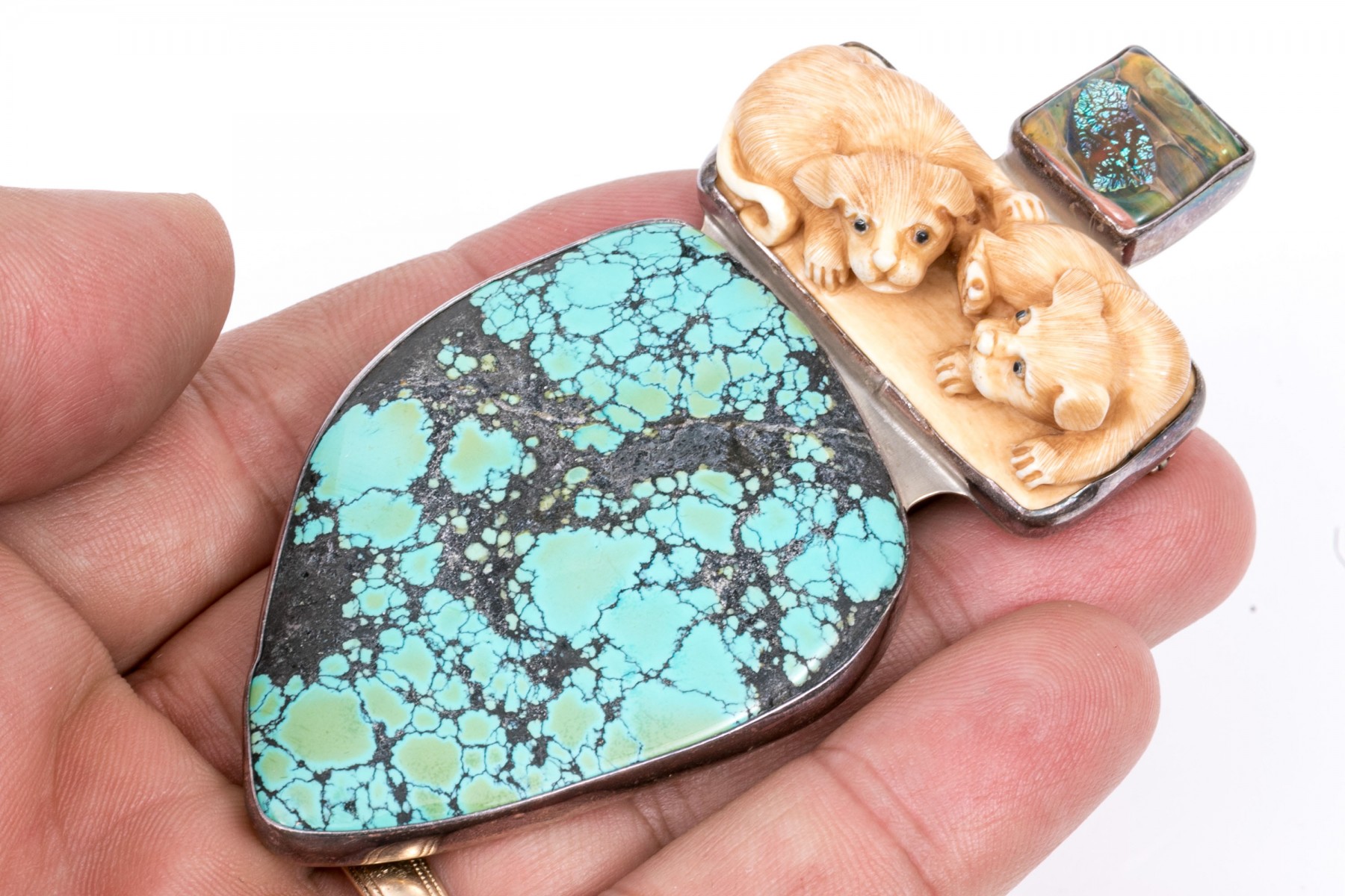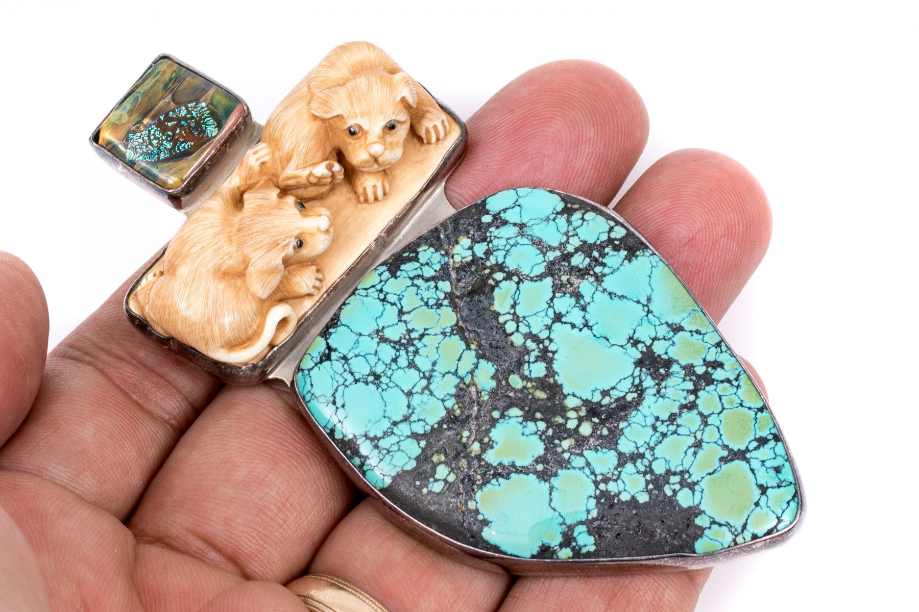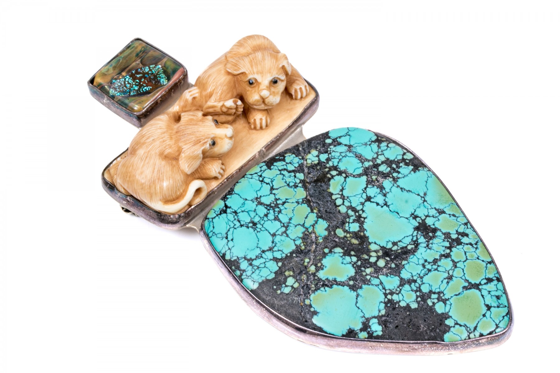 Sterling silver brooch. This striking, hand-made brooch by Amy Kahn Russell is a large, freeform turquoise, bezel set and topped with carved bone playing cats, and a bezel set iridescent glass top. The brooch is also accompanied by a bale in the back, so it can be worn as a pendant