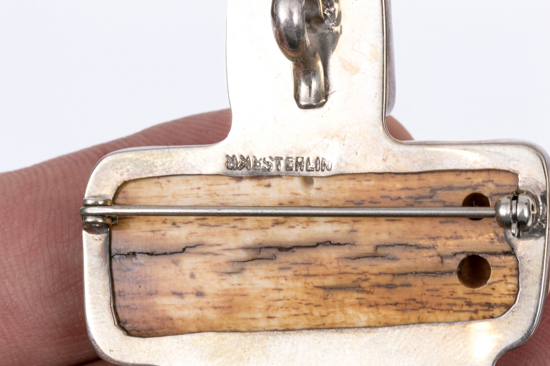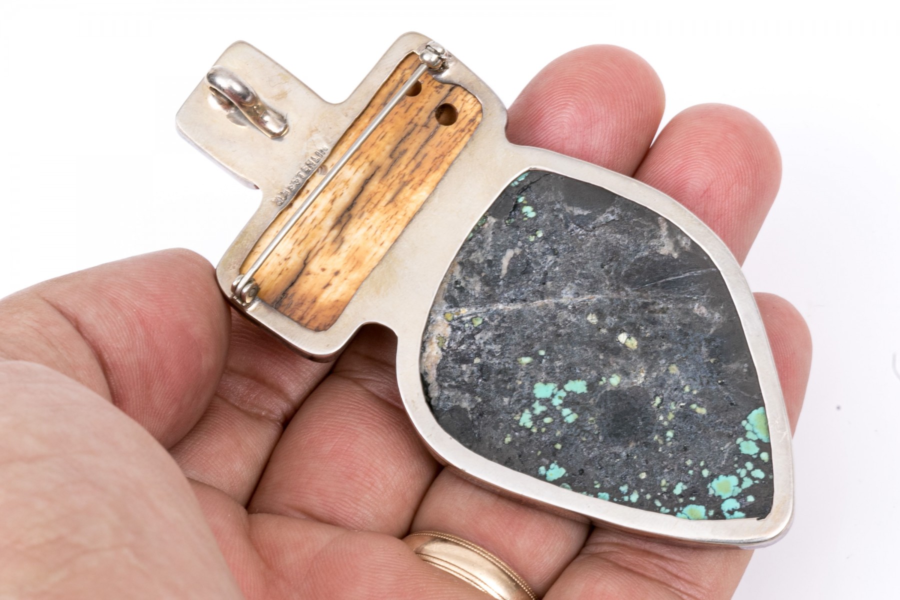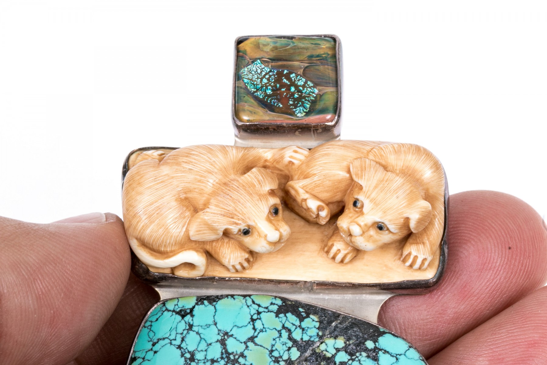 Sterling silver brooch. This striking, hand-made brooch by Amy Kahn Russell is a large, freeform turquoise, bezel set and topped with carved bone playing cats, and a bezel set iridescent glass top. The brooch is also accompanied by a bale in the back, so it can be worn as a pendant