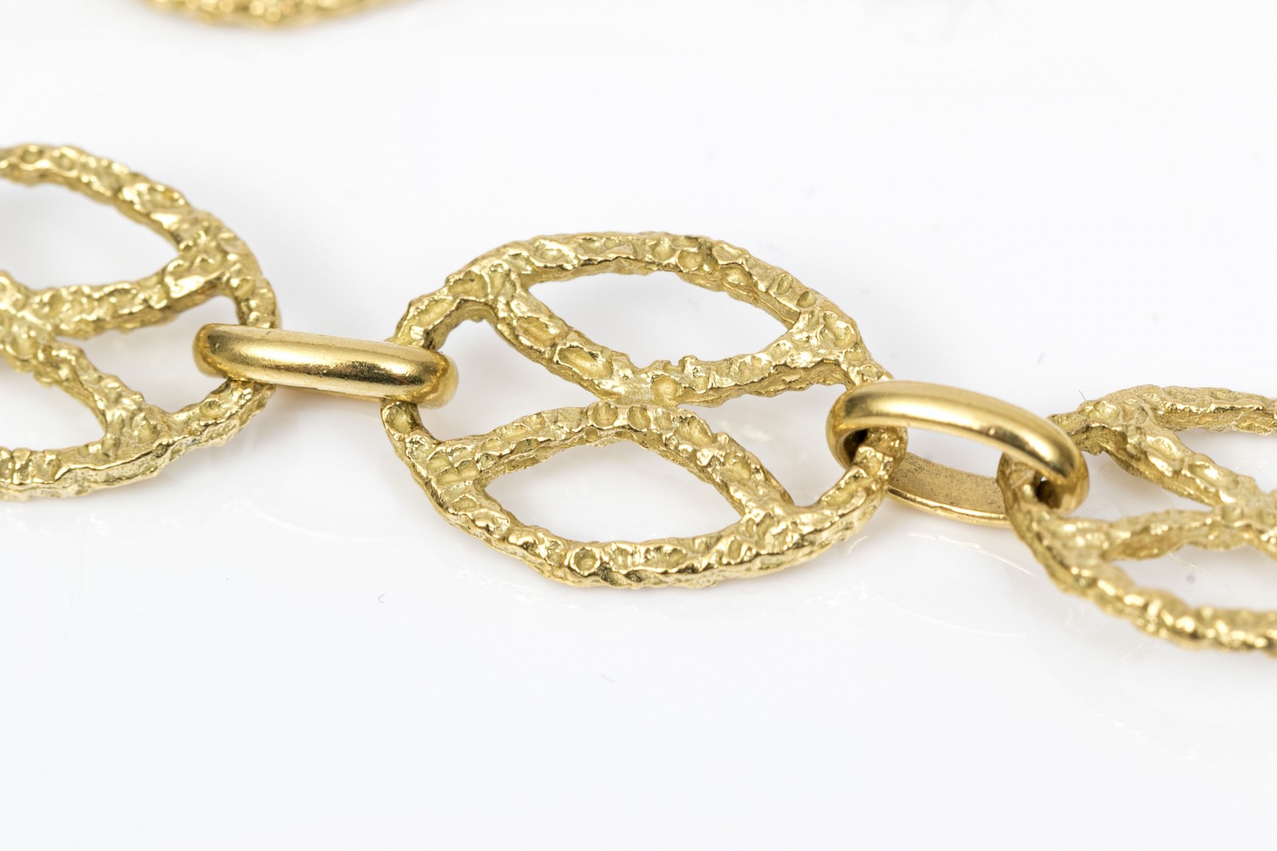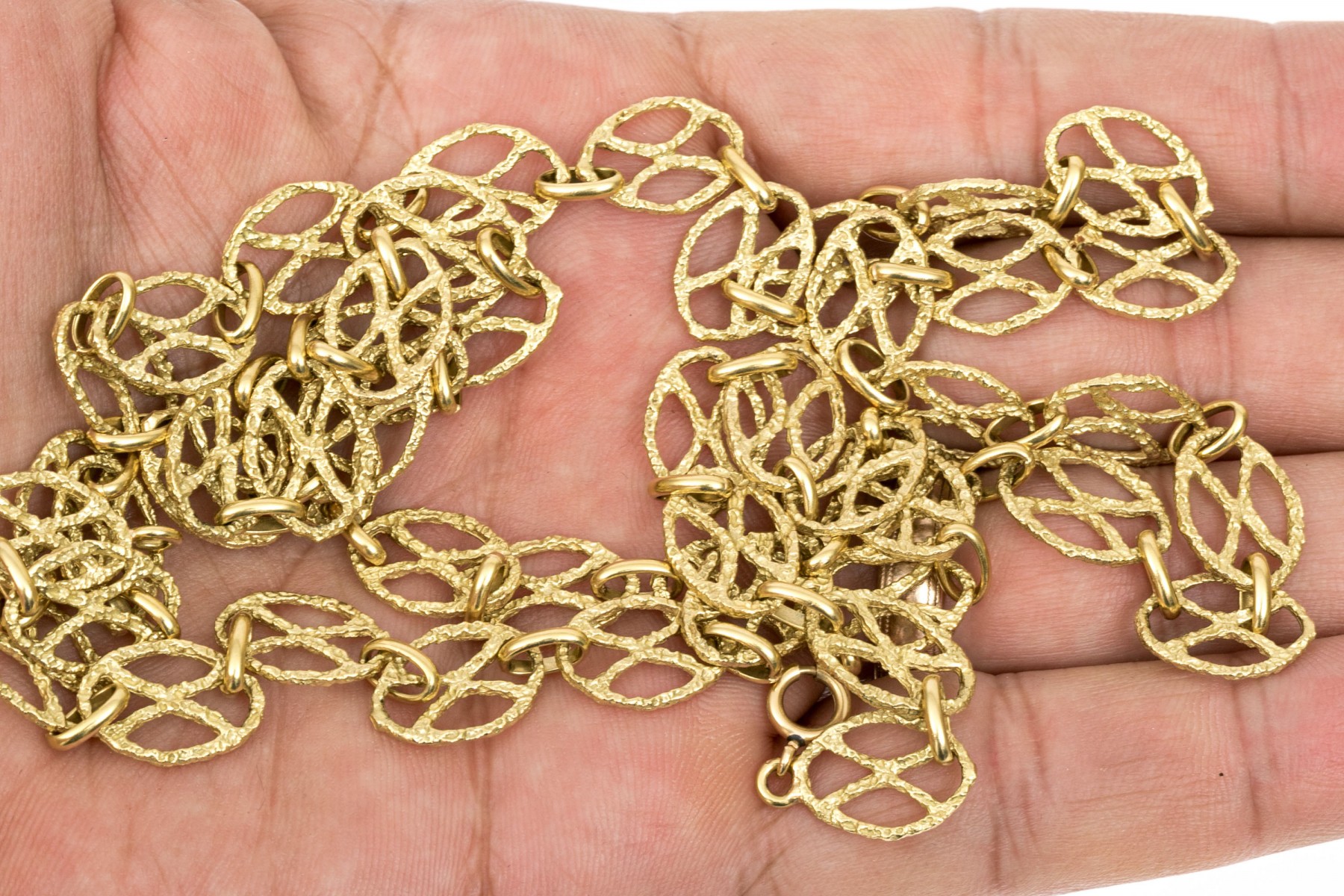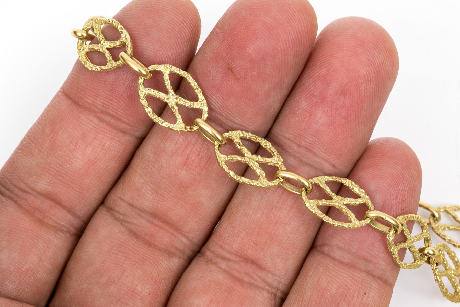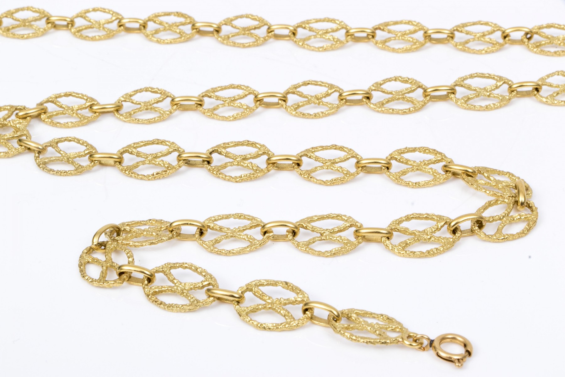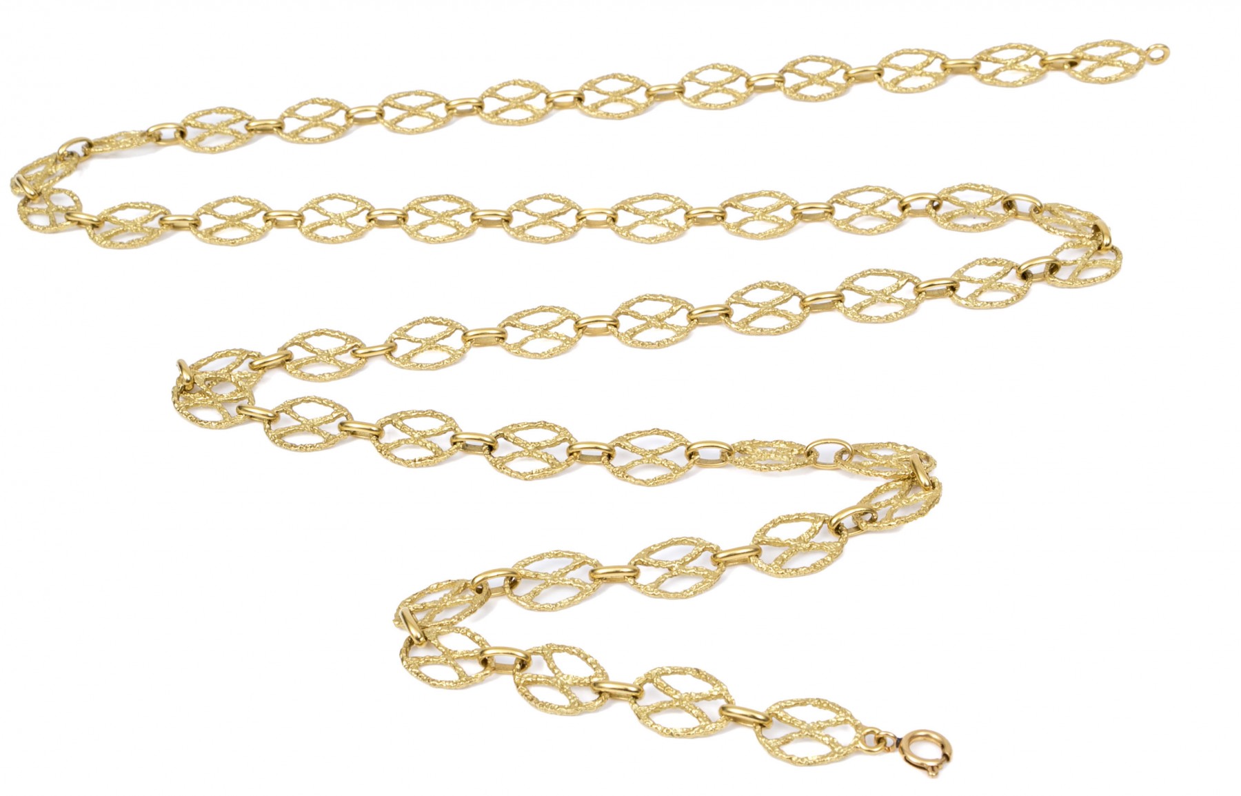 An 18K yellow gold necklace. A fancy link necklace having both smooth and textured open links.