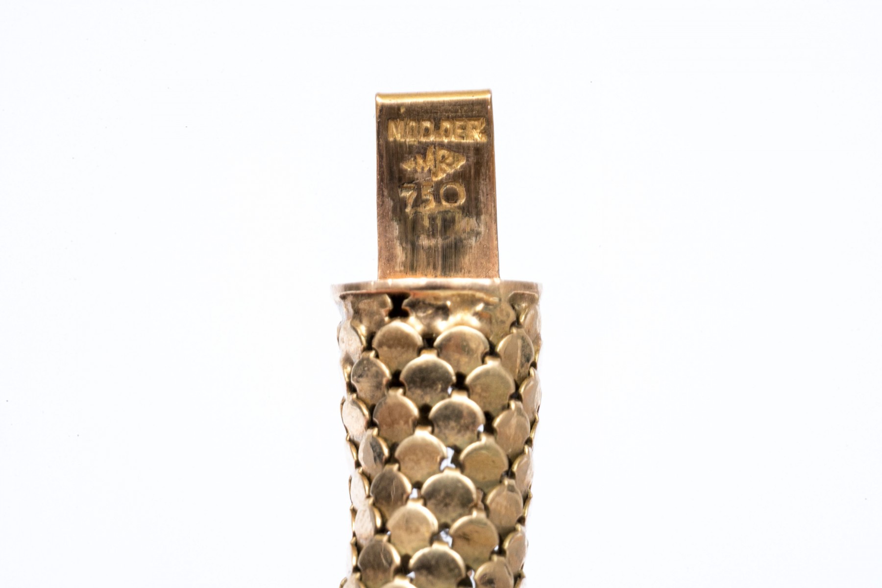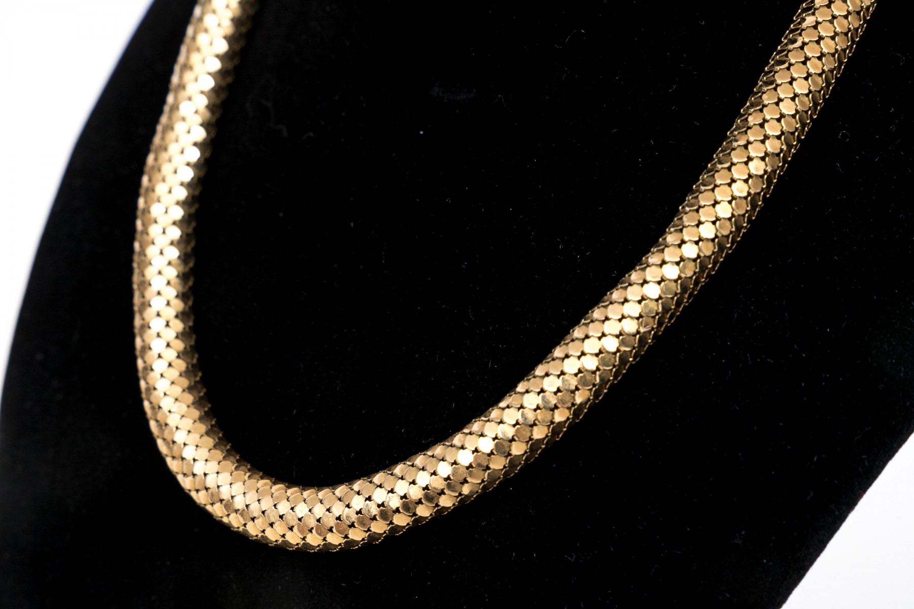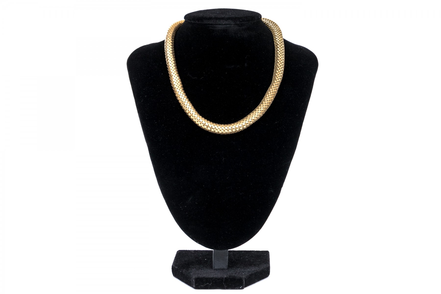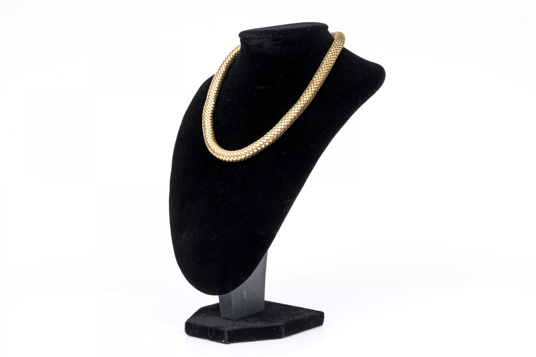 An 18K yellow gold necklace. A fancy cylindrical form necklace having a hidden clasp with safety.