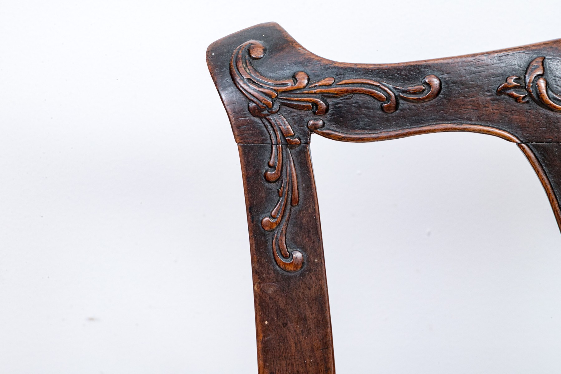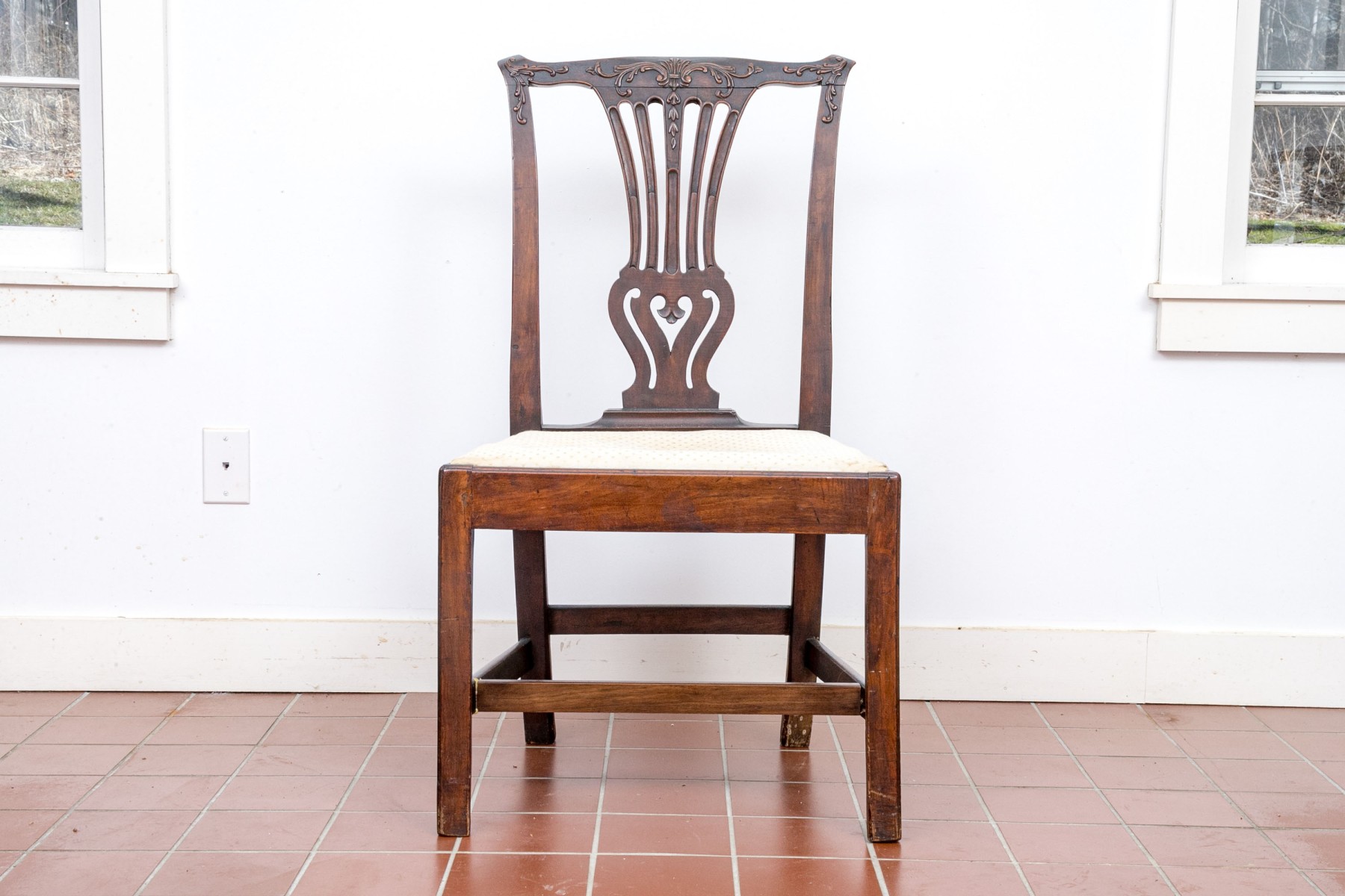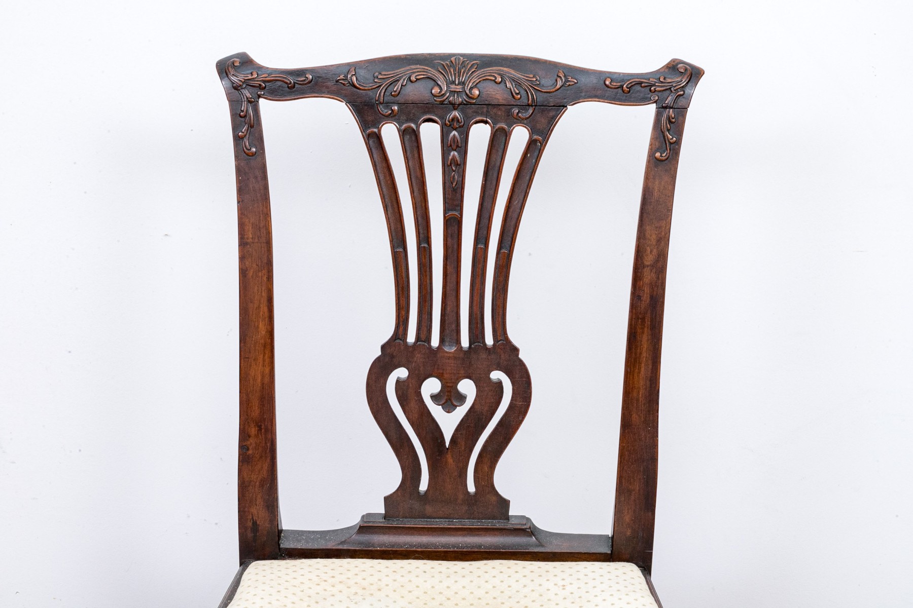 Raised on four squared legs with stretcher support, an upholstered seat cushion, with beautifully carved openwork back splat with foliate scroll carved embellishment to top rail.