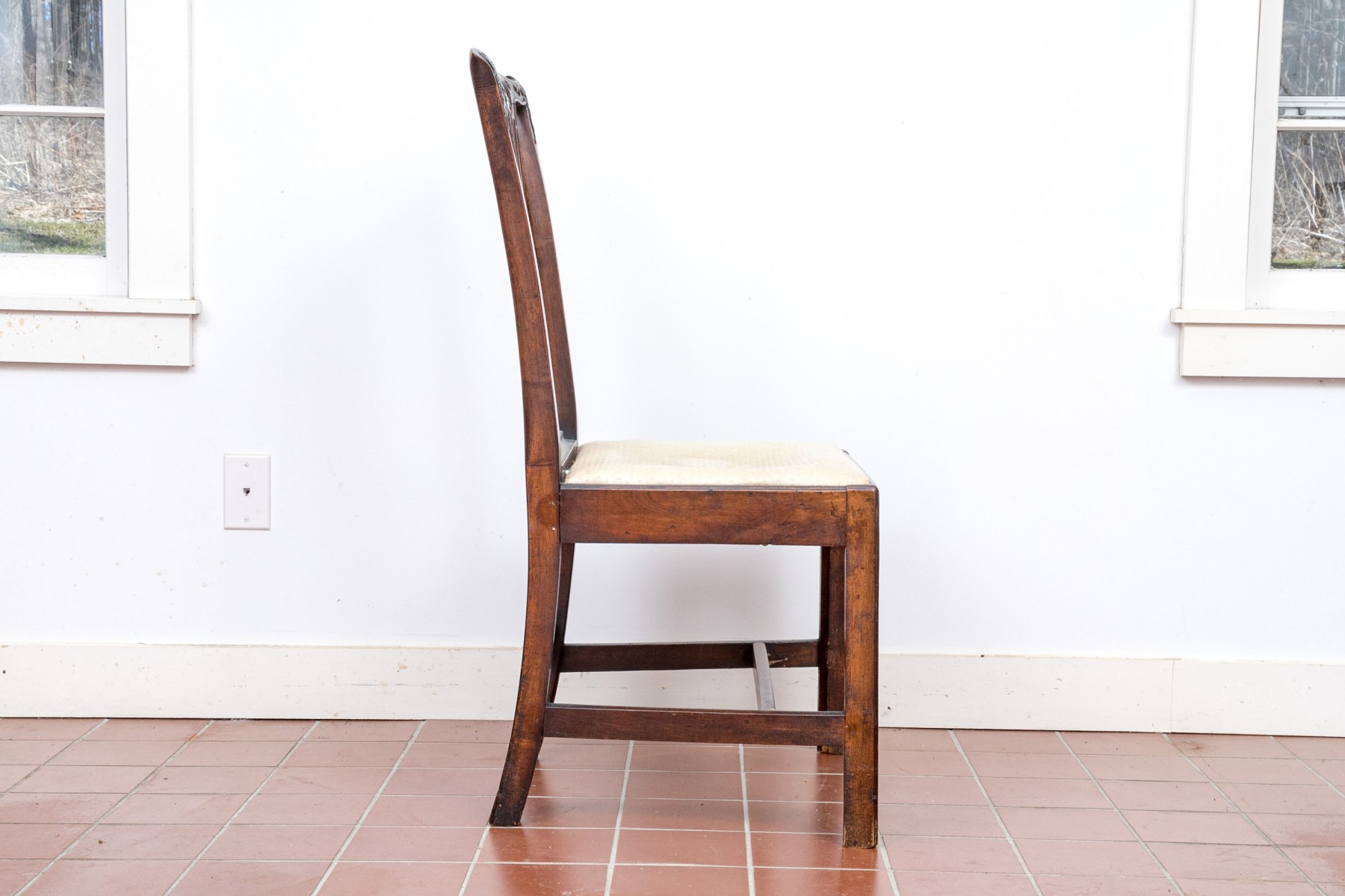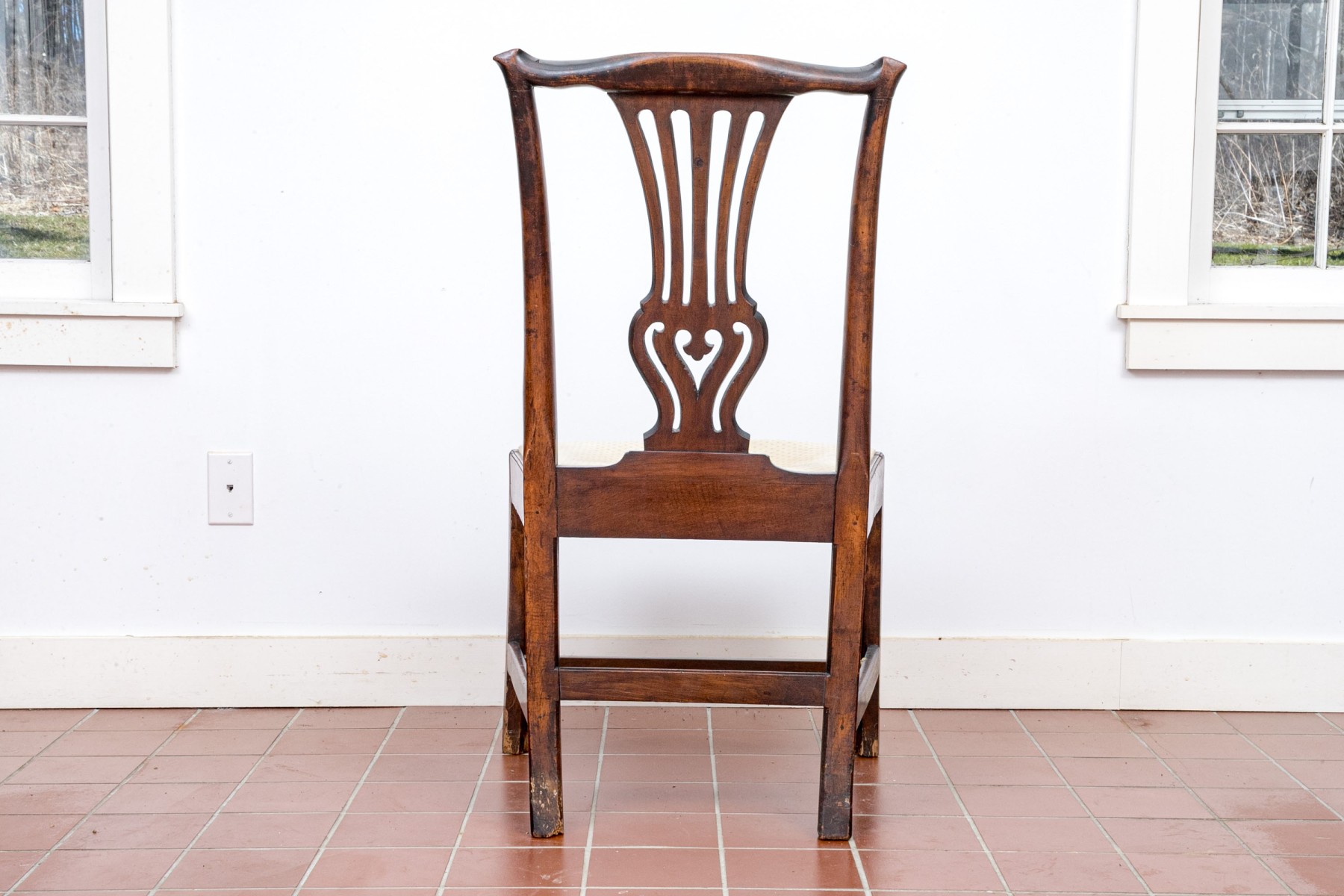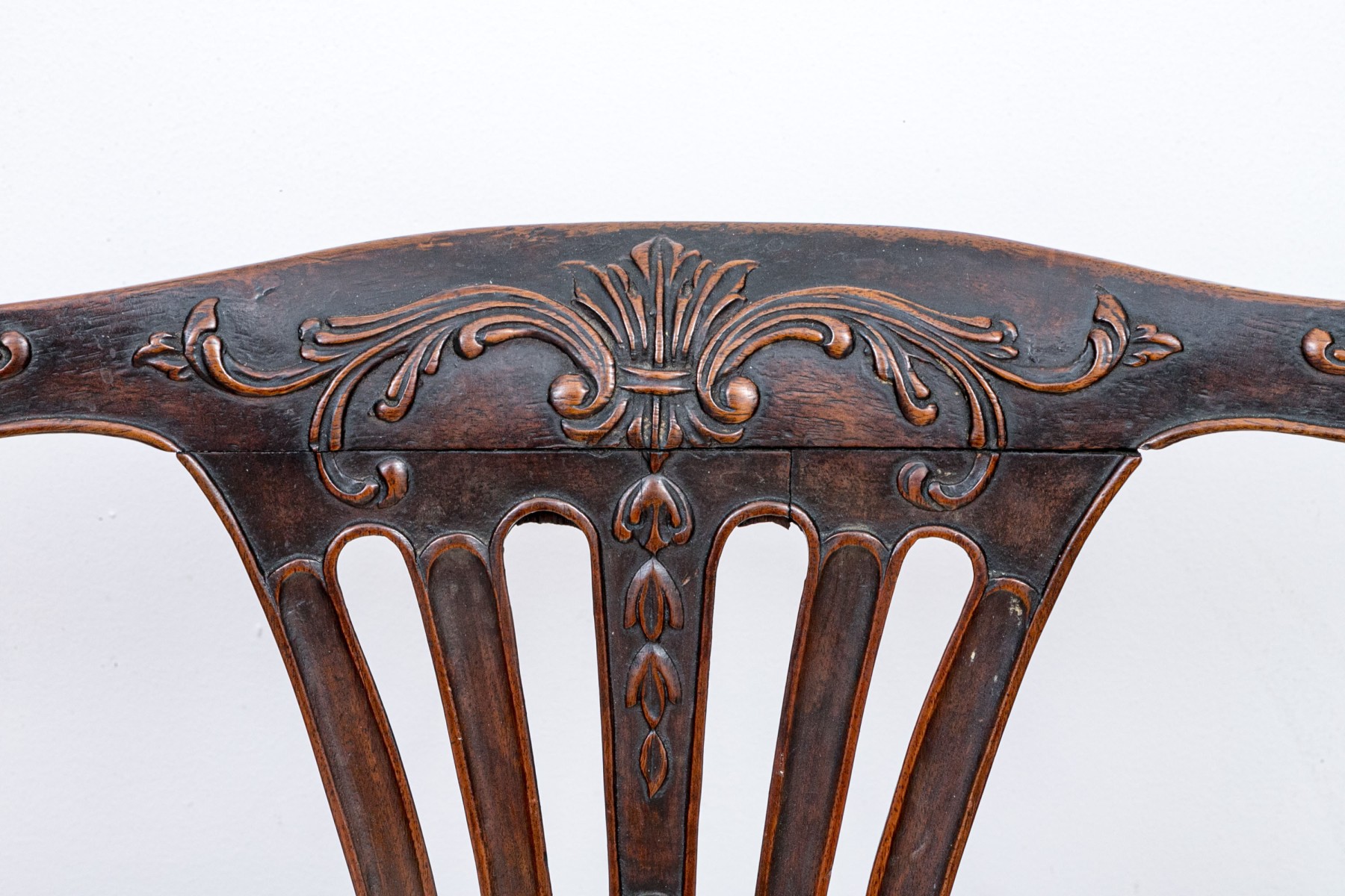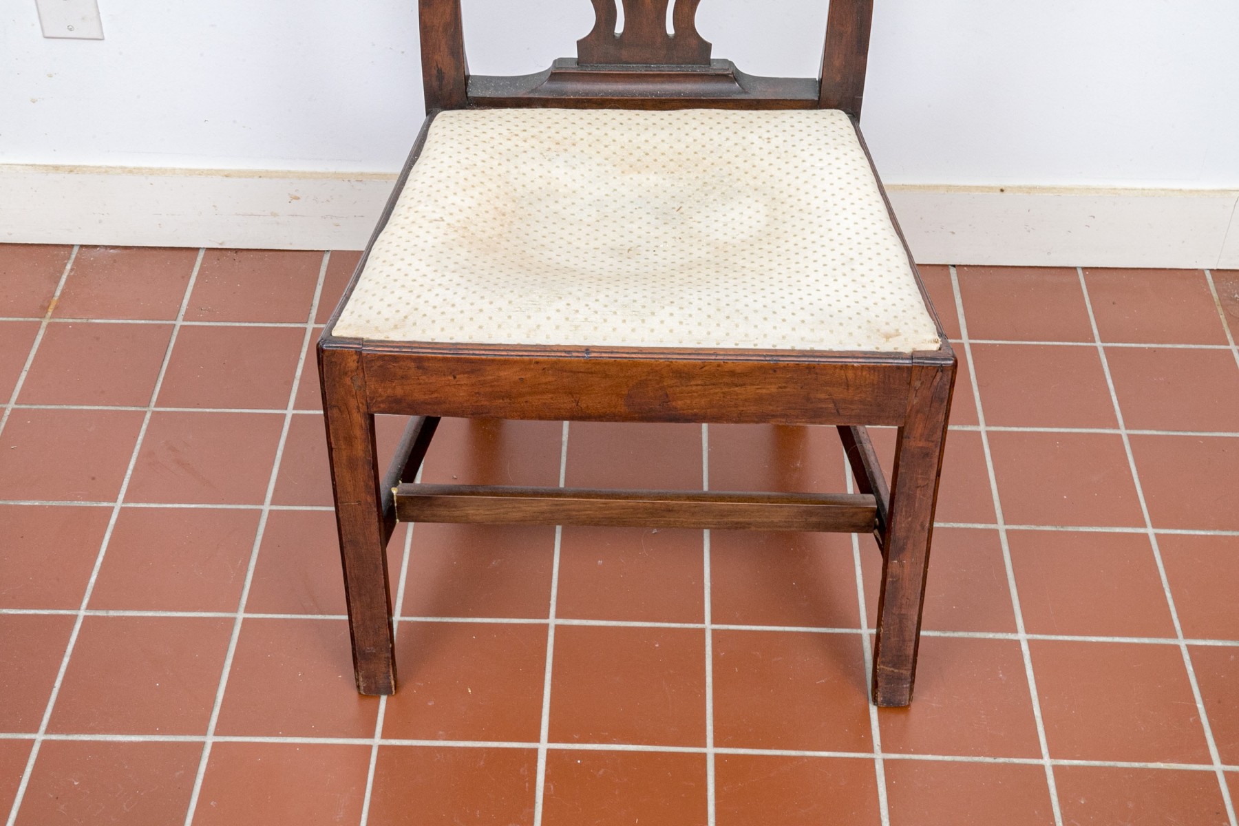 Raised on four squared legs with stretcher support, an upholstered seat cushion, with beautifully carved openwork back splat with foliate scroll carved embellishment to top rail.
