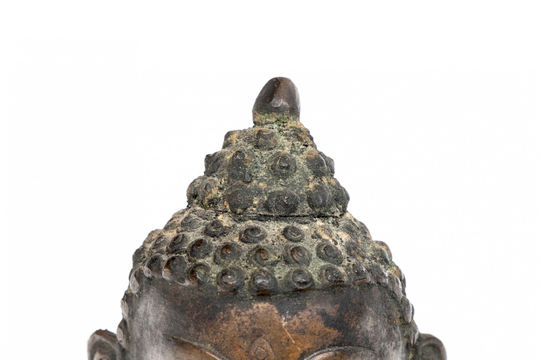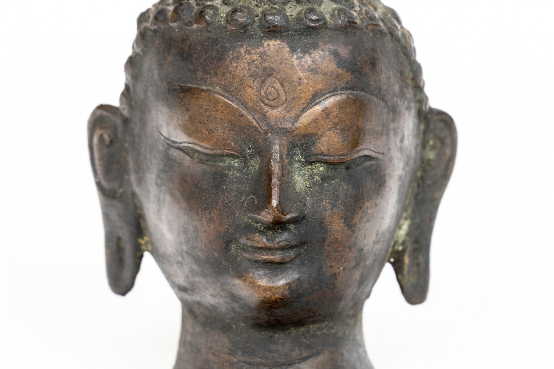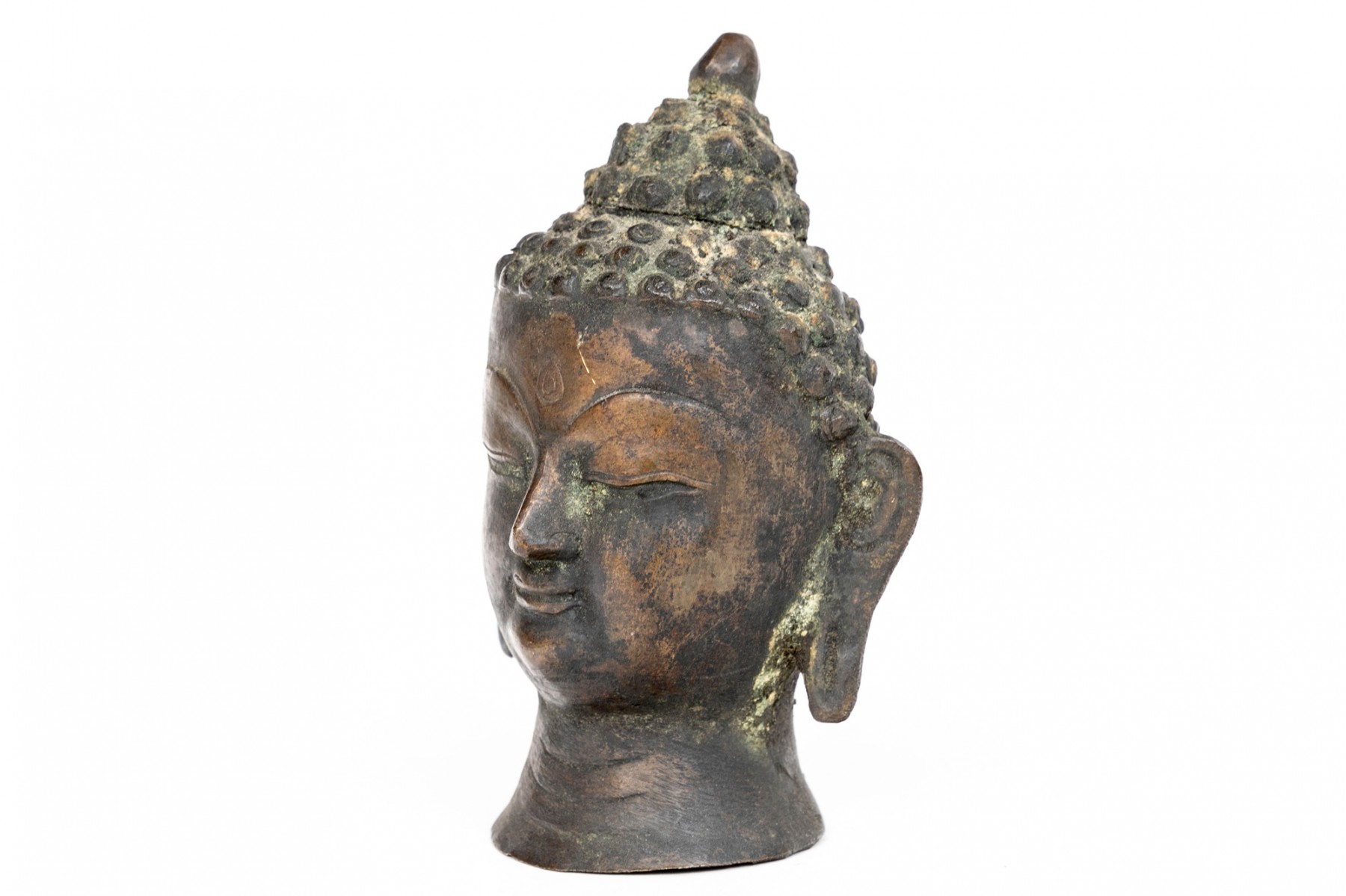 An antique small bronze dark patinated head of Buddha, with headdress