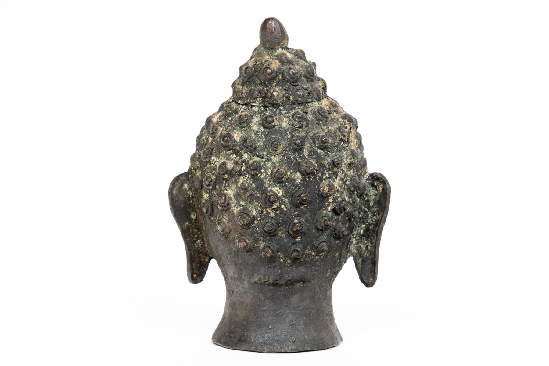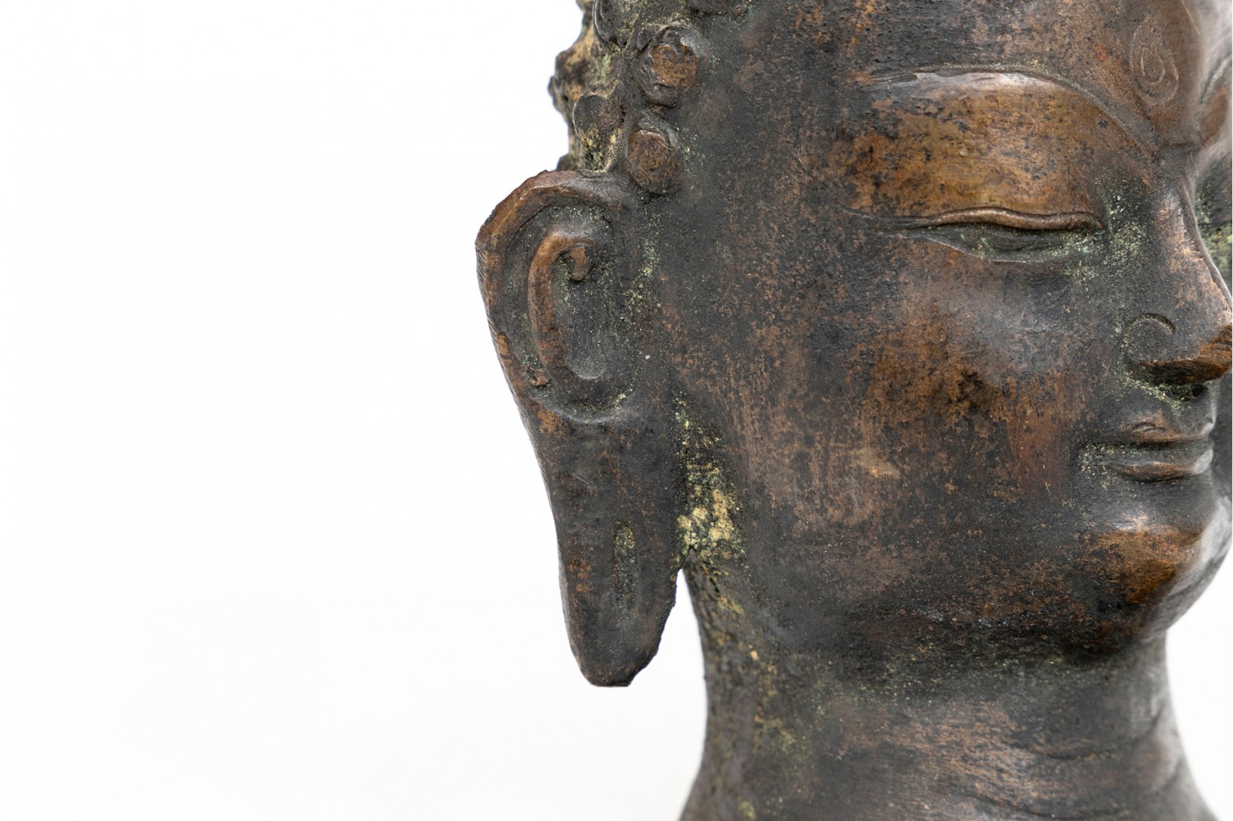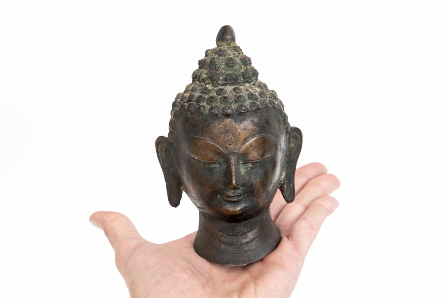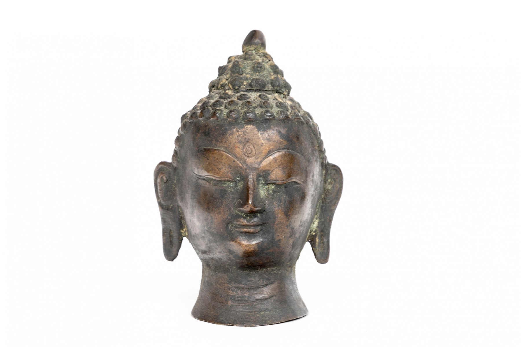 An antique small bronze dark patinated head of Buddha, with headdress