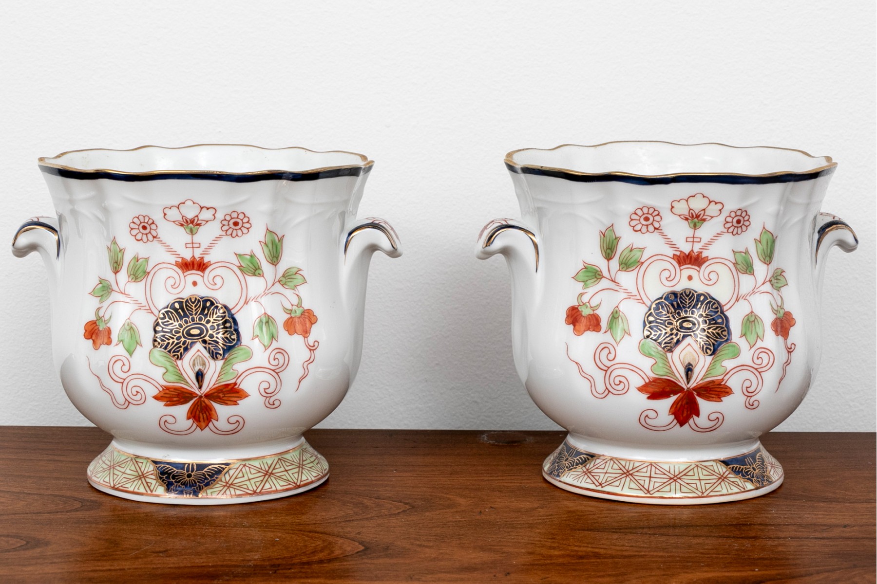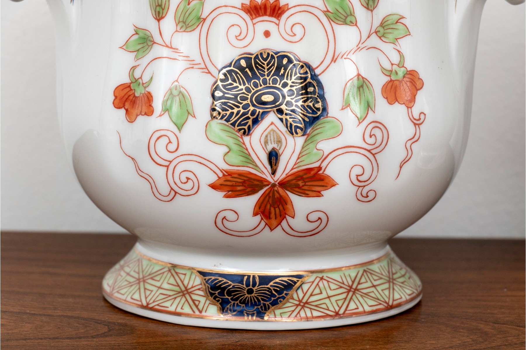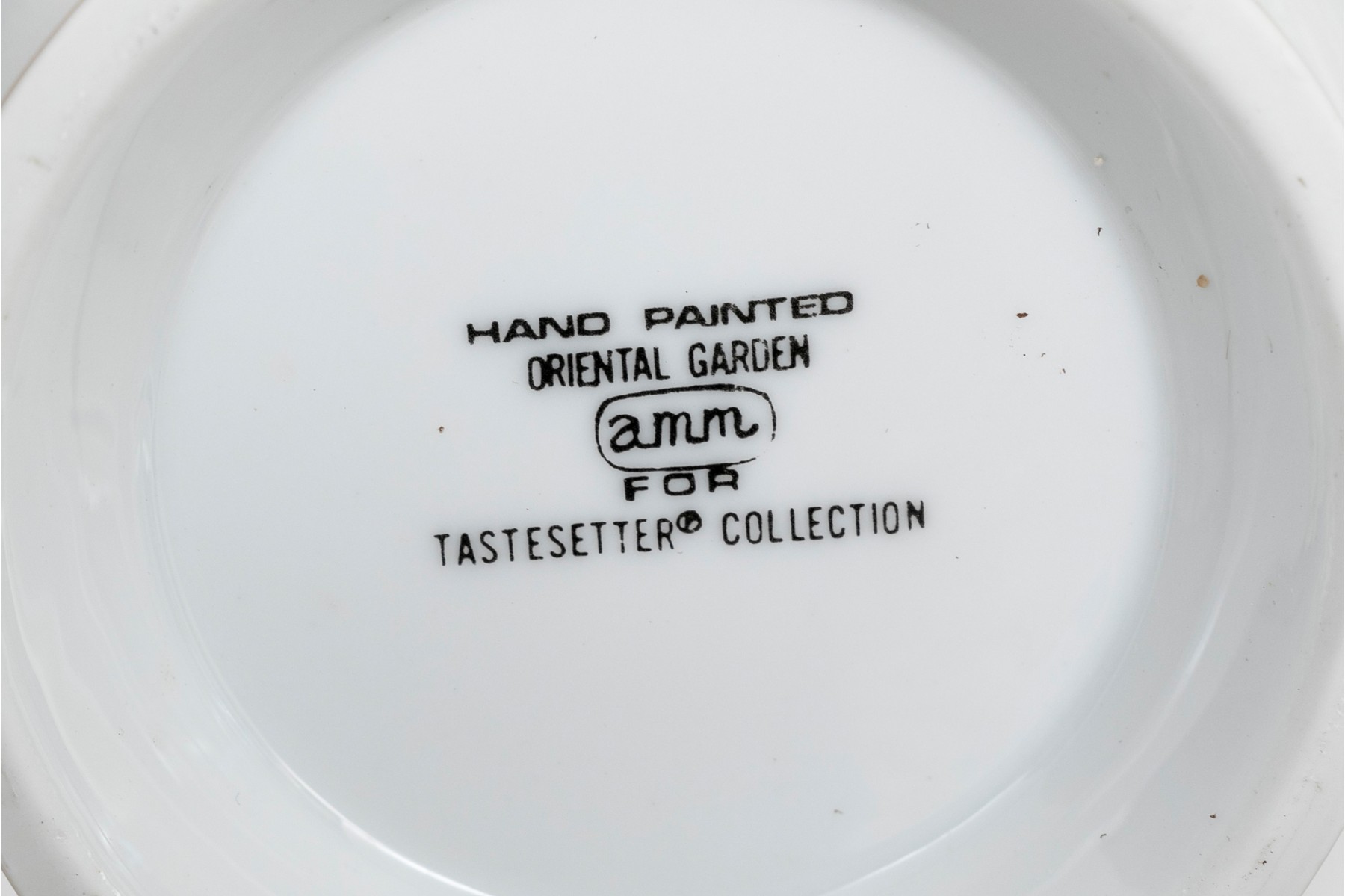 Including a lovely pair of export style twin handled porcelain vases / coolers with scalloped mouth trim, standing on circular feet and marked underfoot "HAND PAINTED / ORIENTAL GARDEN / amm / FOF / TASTESETTER COLLECTION".