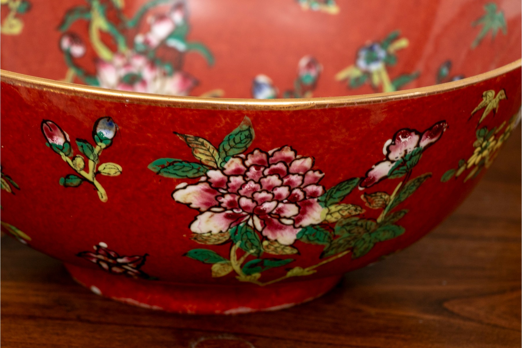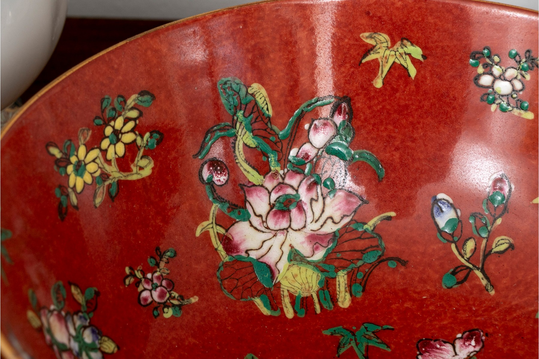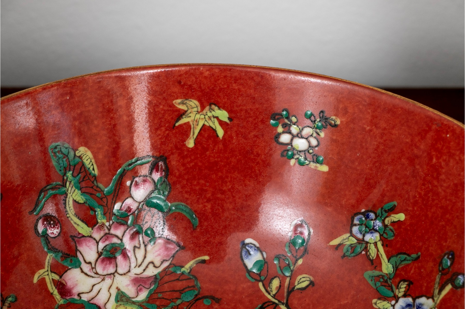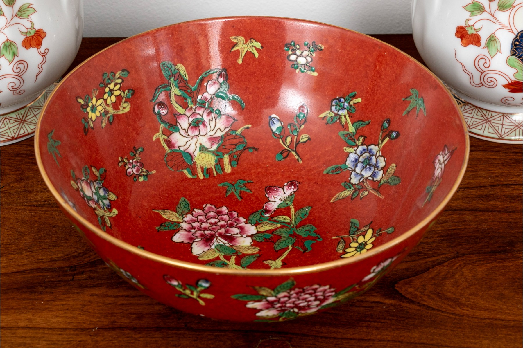 Together with a famille rose decorated on red ground porcelain bowl with floral sprays throughout.