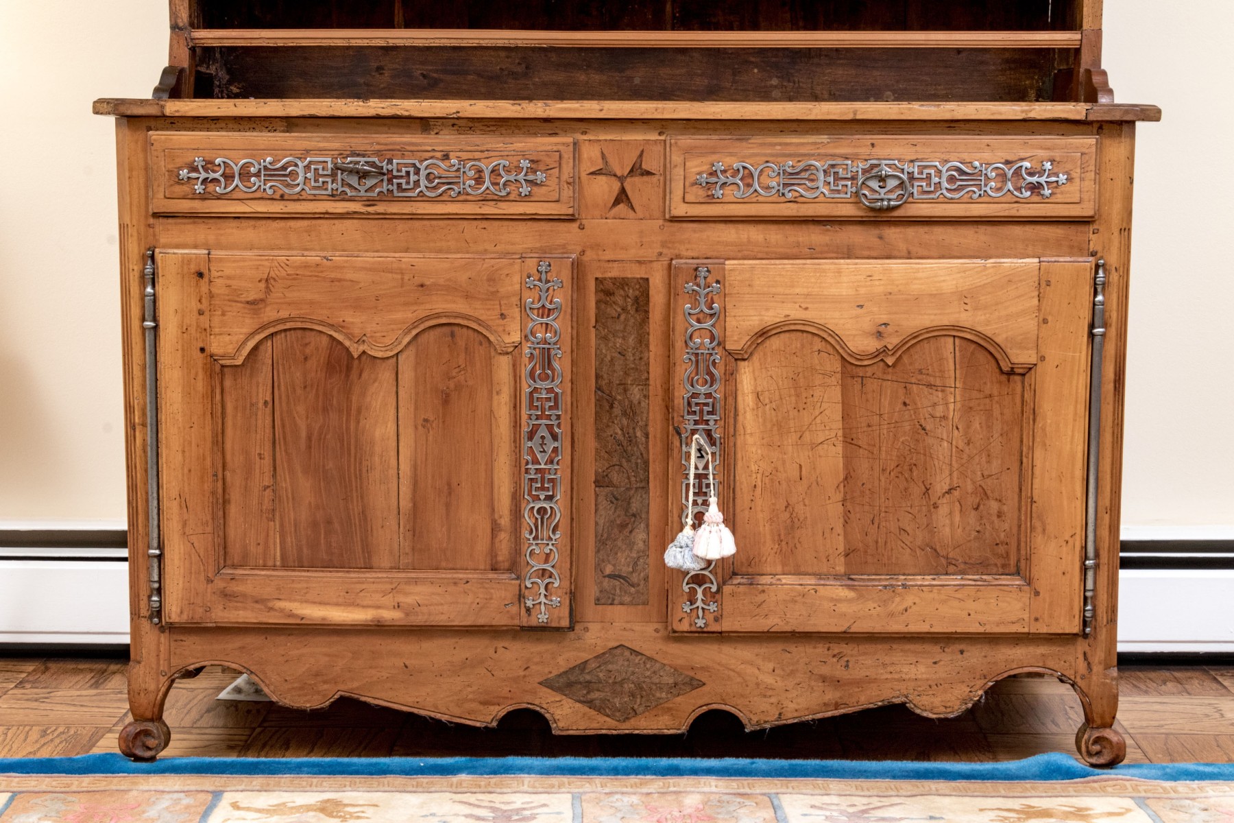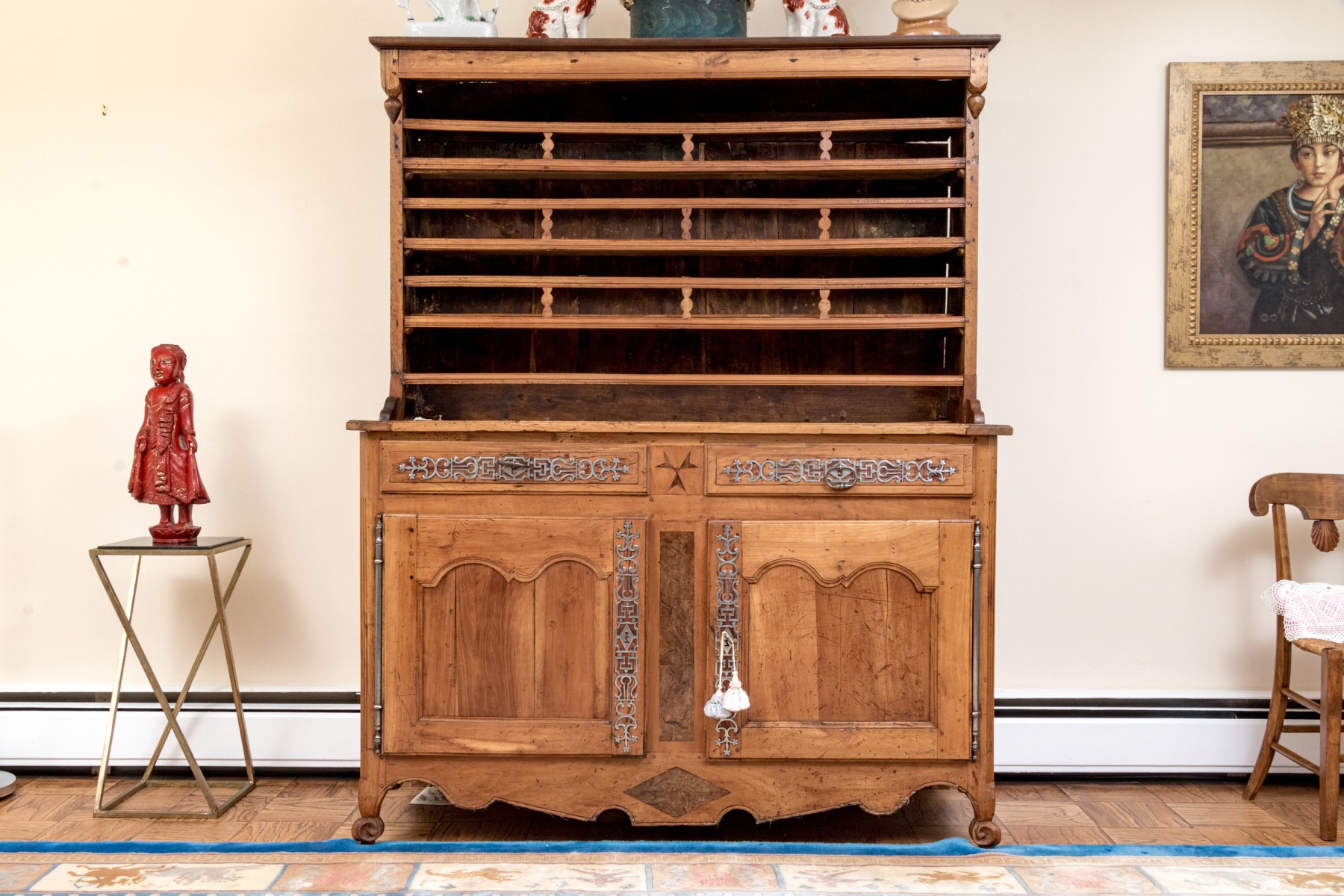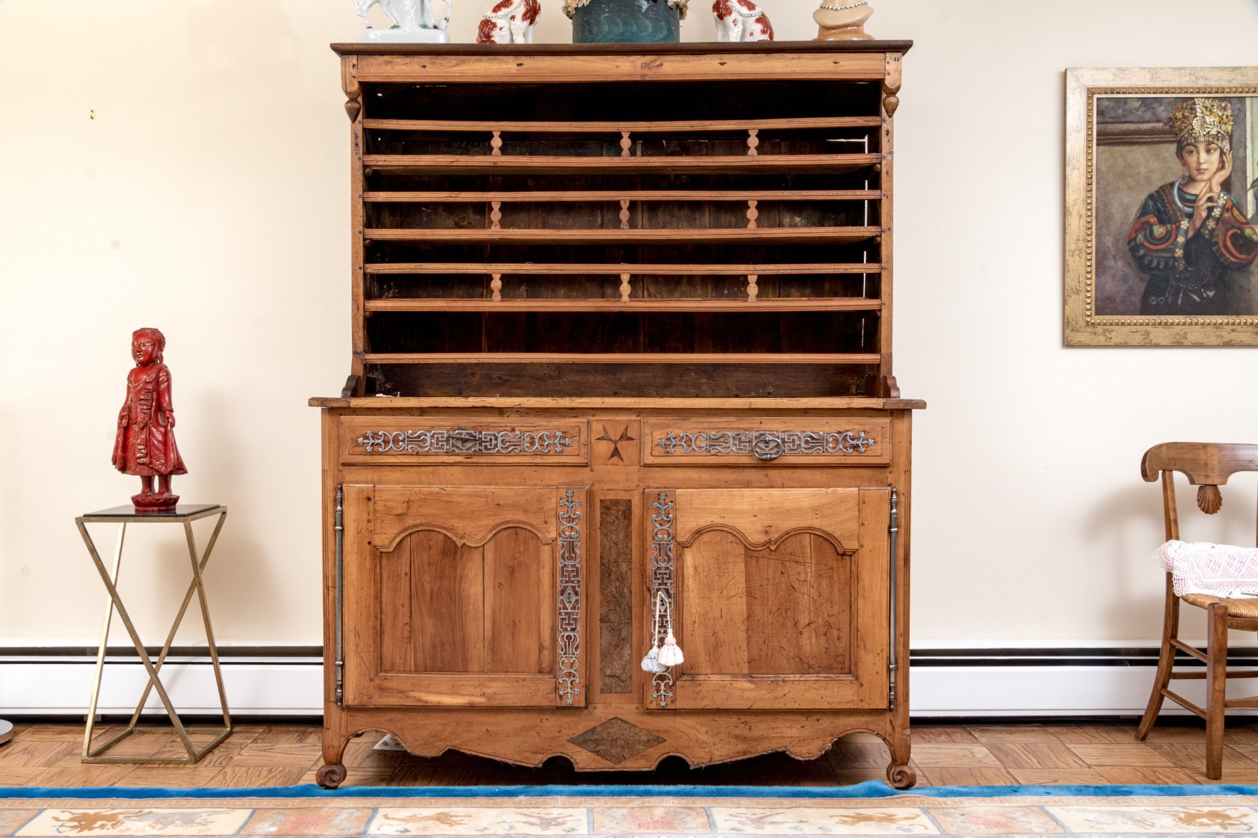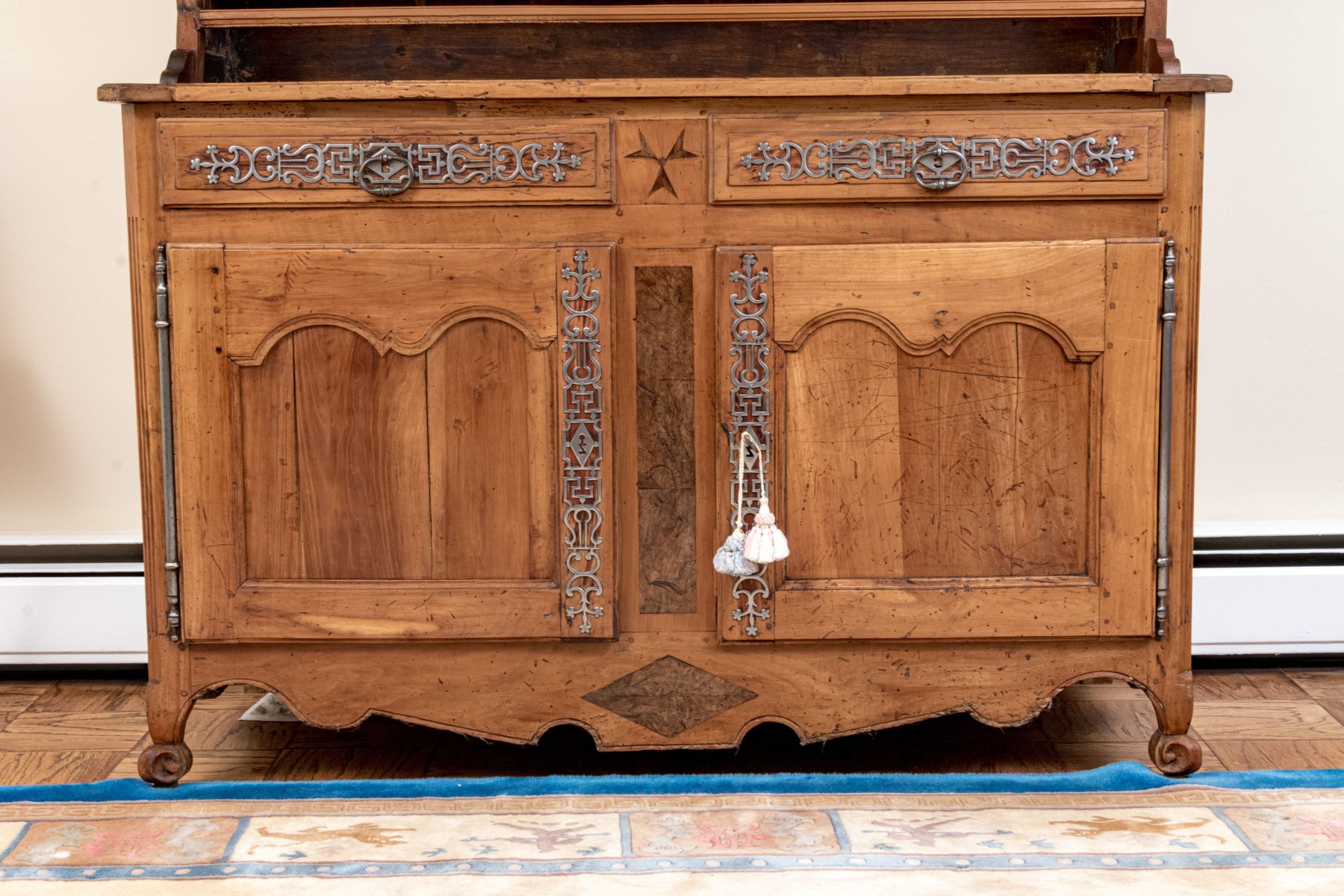 The French term vaisselier refers to a piece of furniture for storing and exhibiting china in the formal or informal dining rooms of provincial homes. Traditional French country vaisseliers, consist of a two door buffet, occasionally with drawers, with a shelved cupboard resting on top of it. With ornate brass mounts and hardware. A key. Opens to two paper lined shelves. Top Cupboard with four shelves.