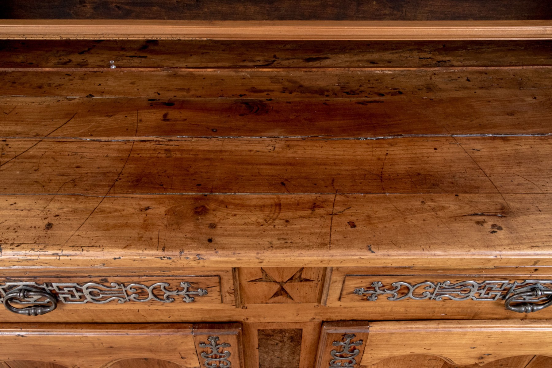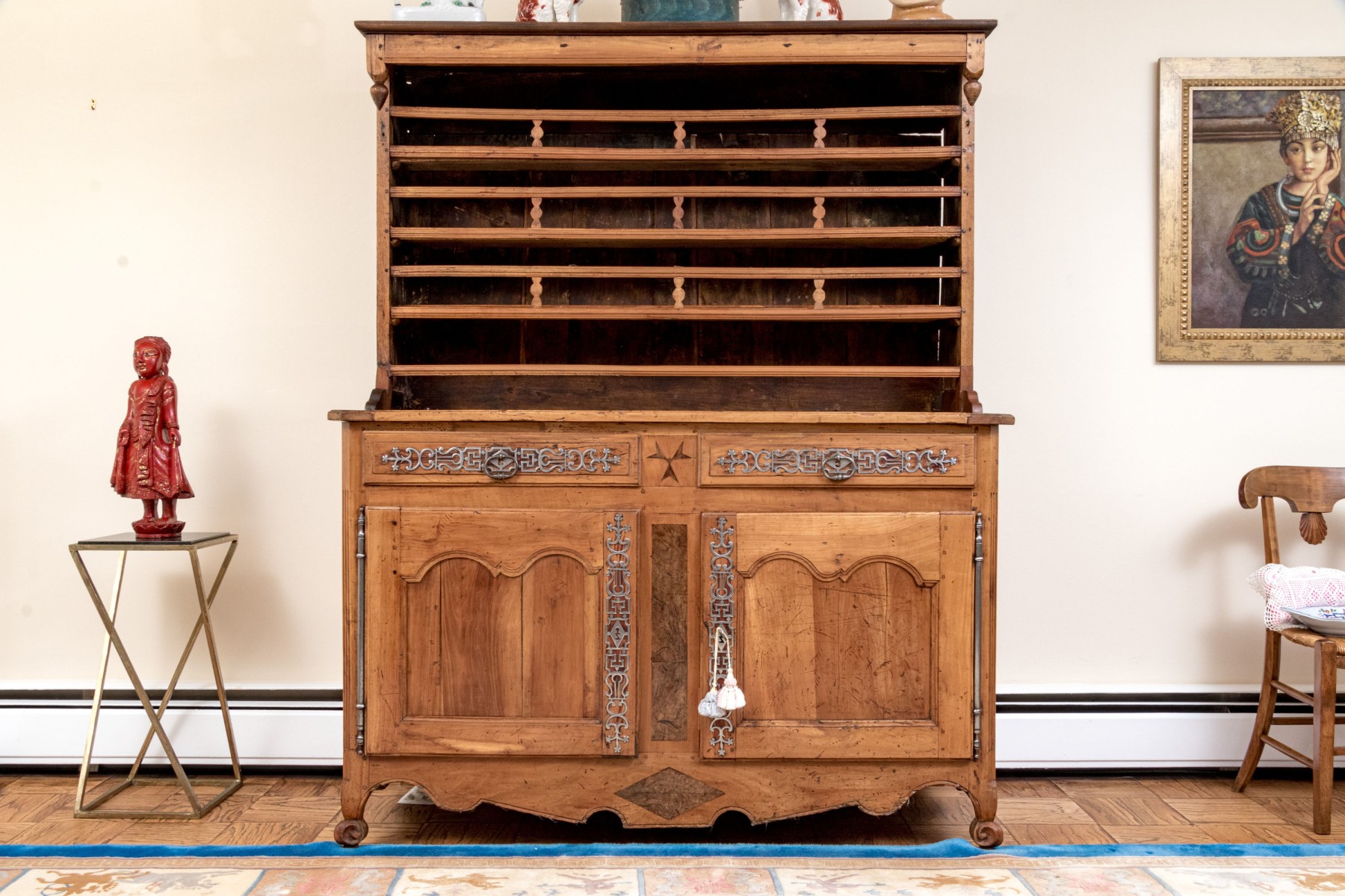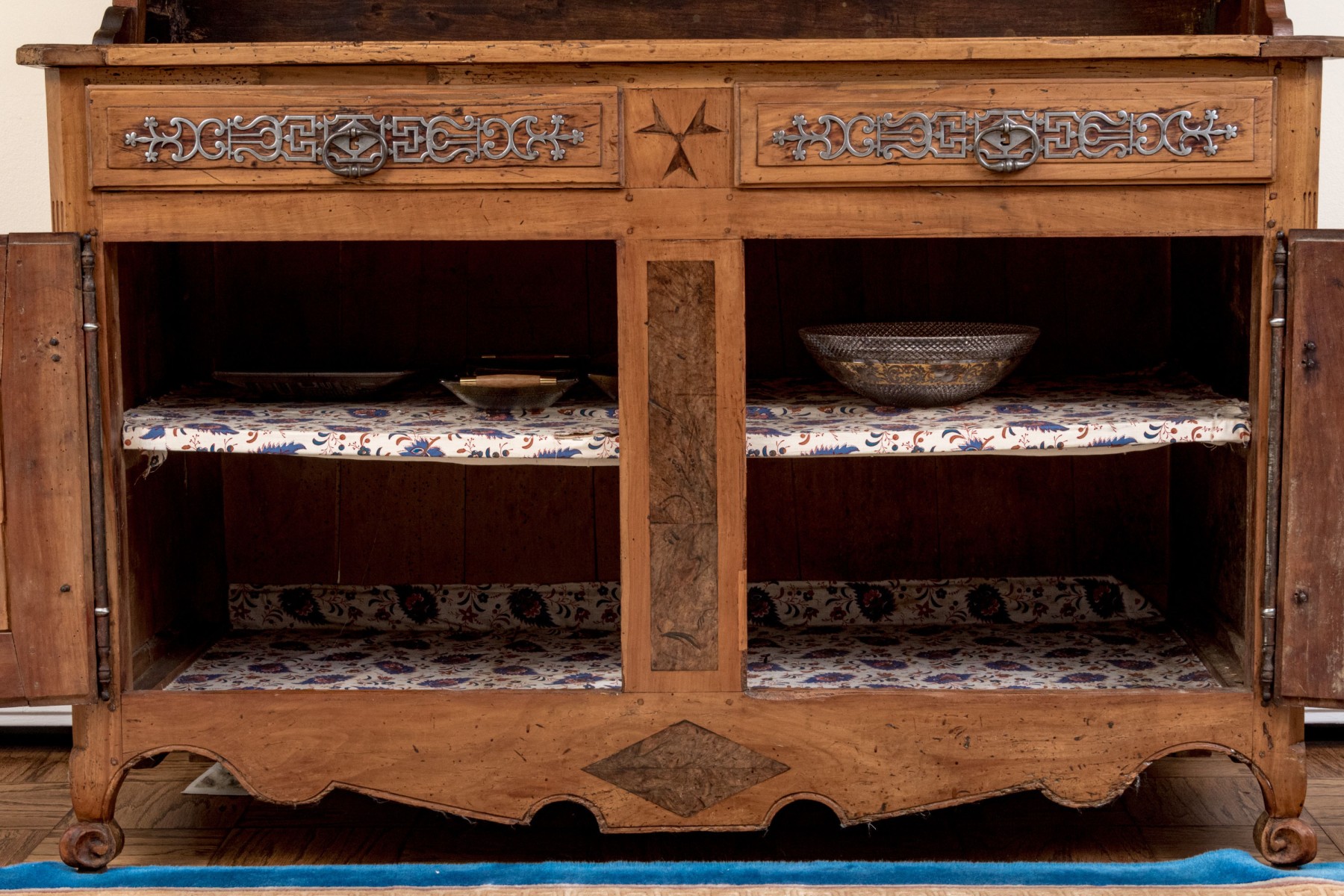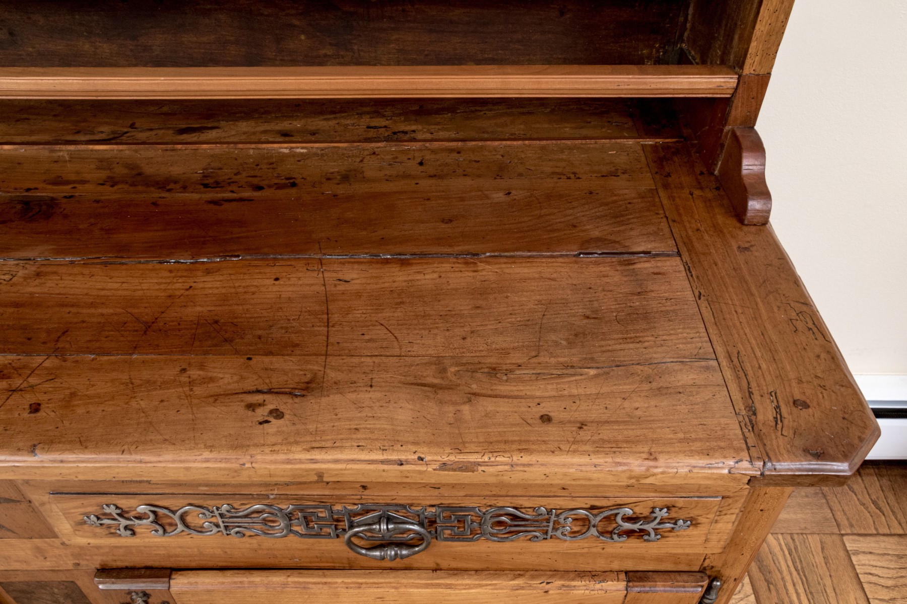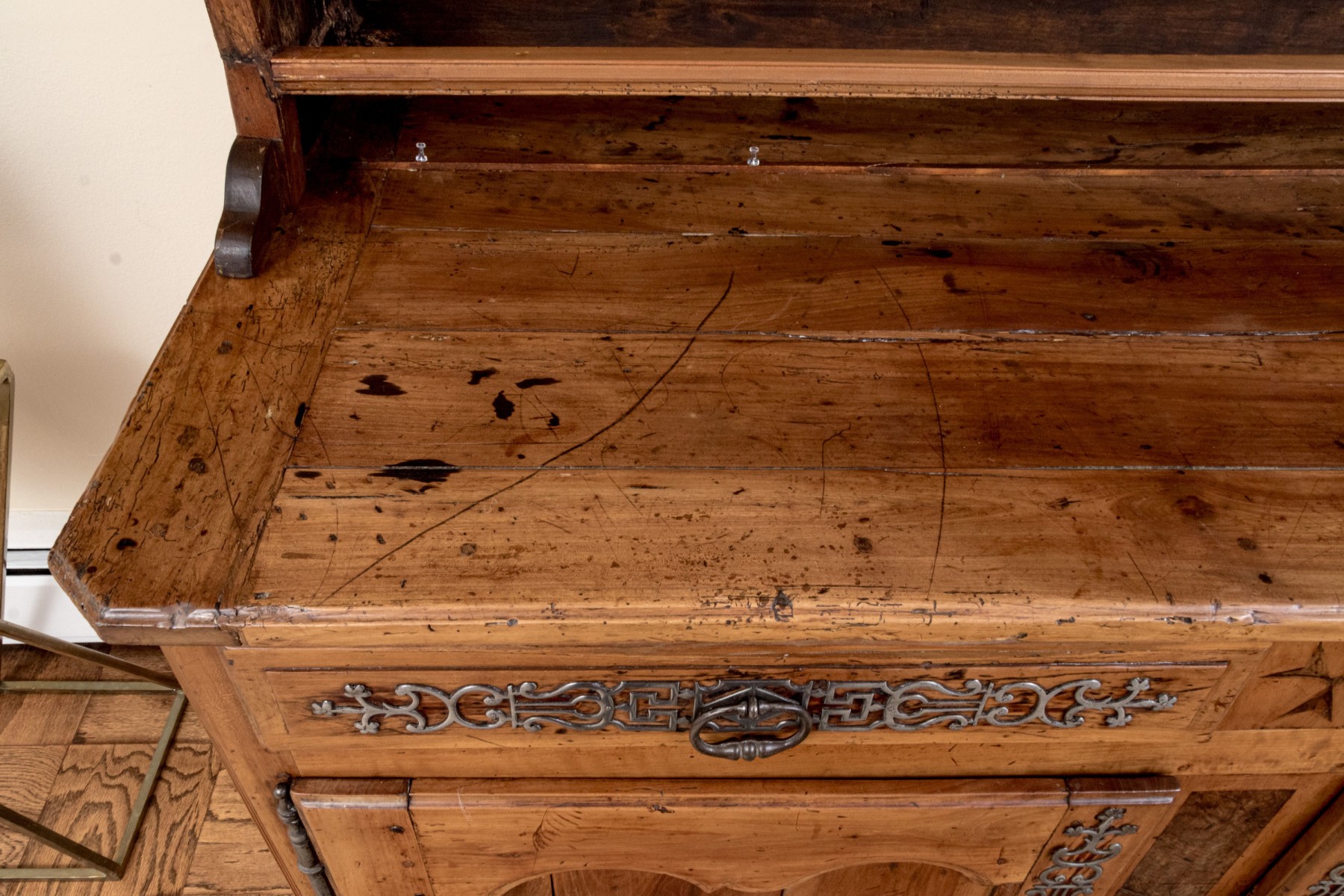 The French term vaisselier refers to a piece of furniture for storing and exhibiting china in the formal or informal dining rooms of provincial homes. Traditional French country vaisseliers, consist of a two door buffet, occasionally with drawers, with a shelved cupboard resting on top of it. With ornate brass mounts and hardware. A key. Opens to two paper lined shelves. Top Cupboard with four shelves.