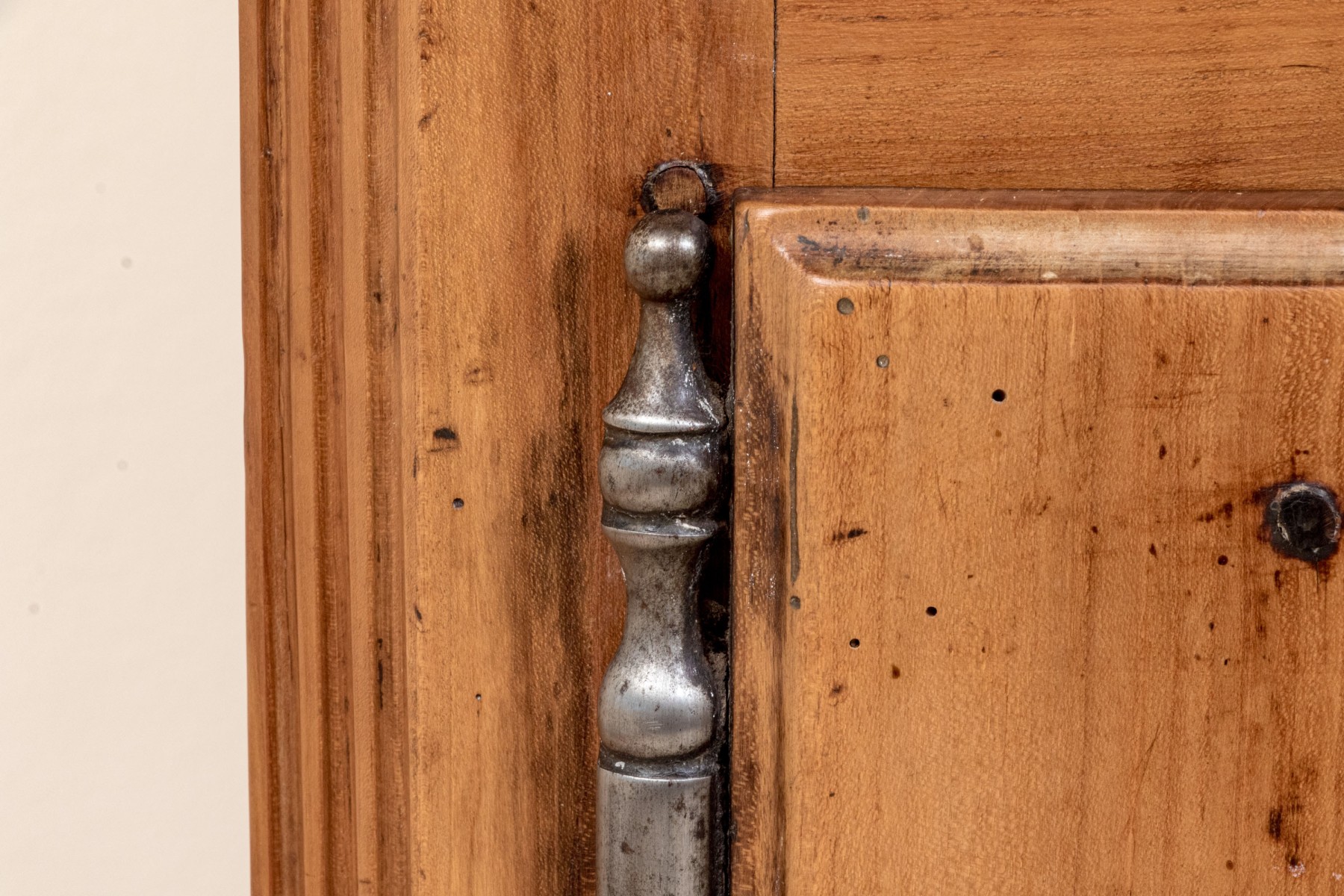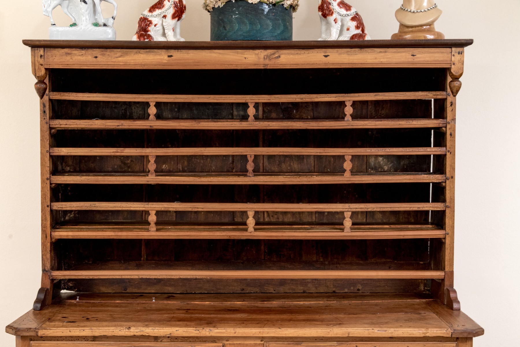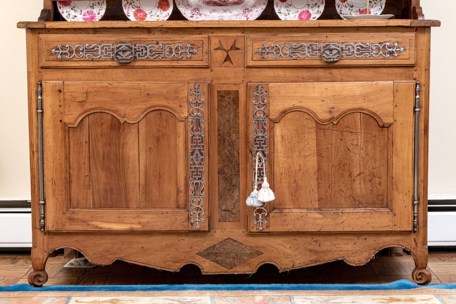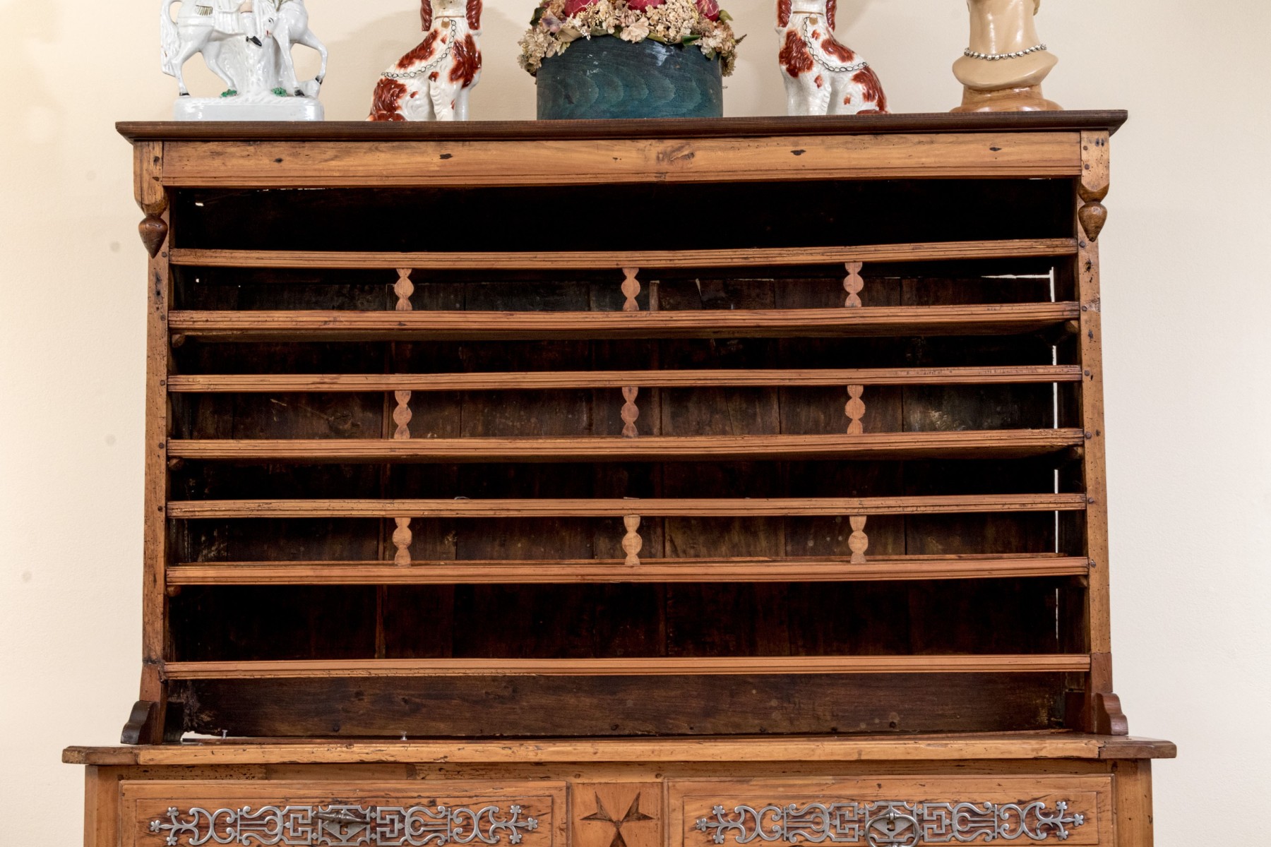 The French term vaisselier refers to a piece of furniture for storing and exhibiting china in the formal or informal dining rooms of provincial homes. Traditional French country vaisseliers, consist of a two door buffet, occasionally with drawers, with a shelved cupboard resting on top of it. With ornate brass mounts and hardware. A key. Opens to two paper lined shelves. Top Cupboard with four shelves.