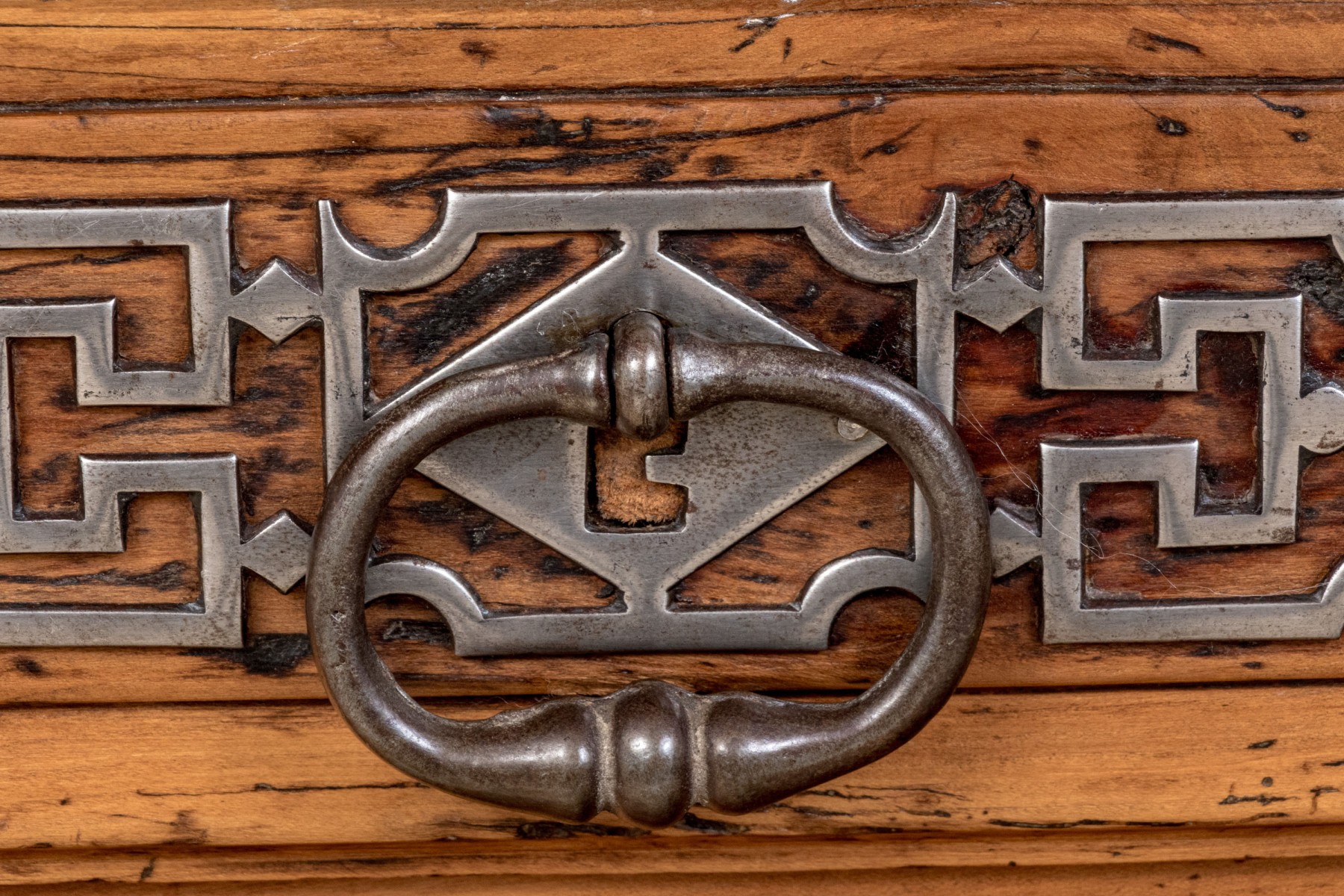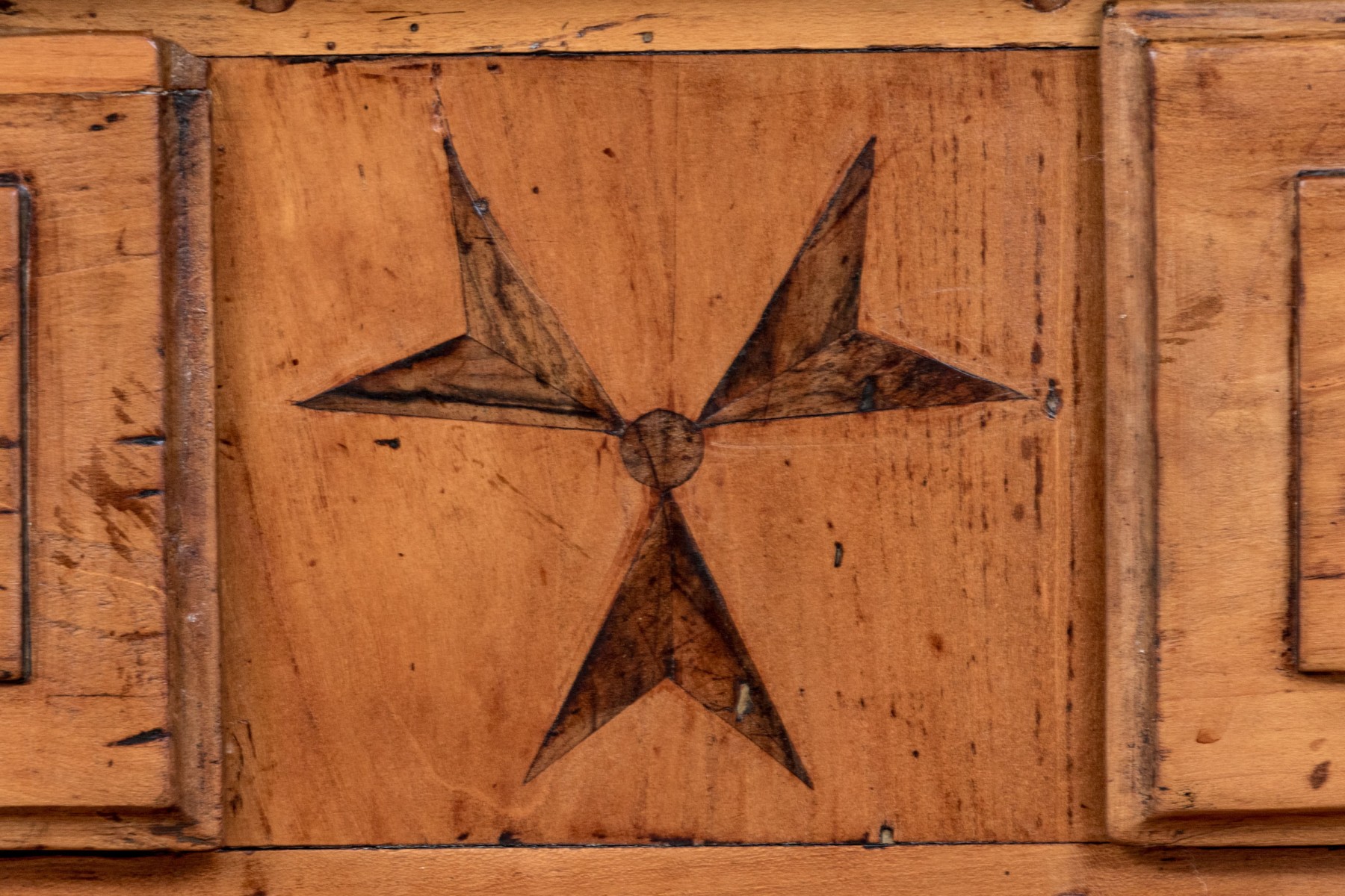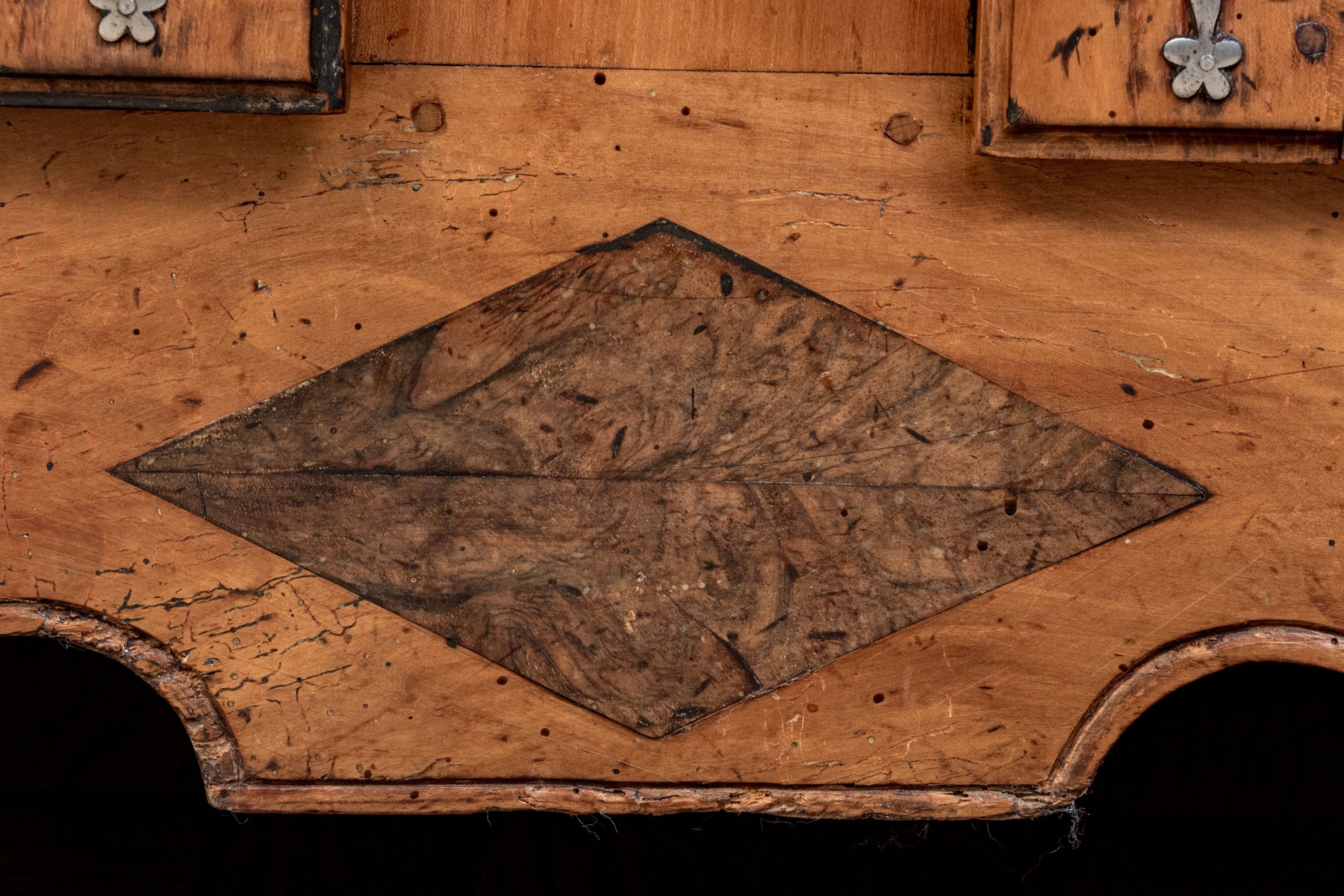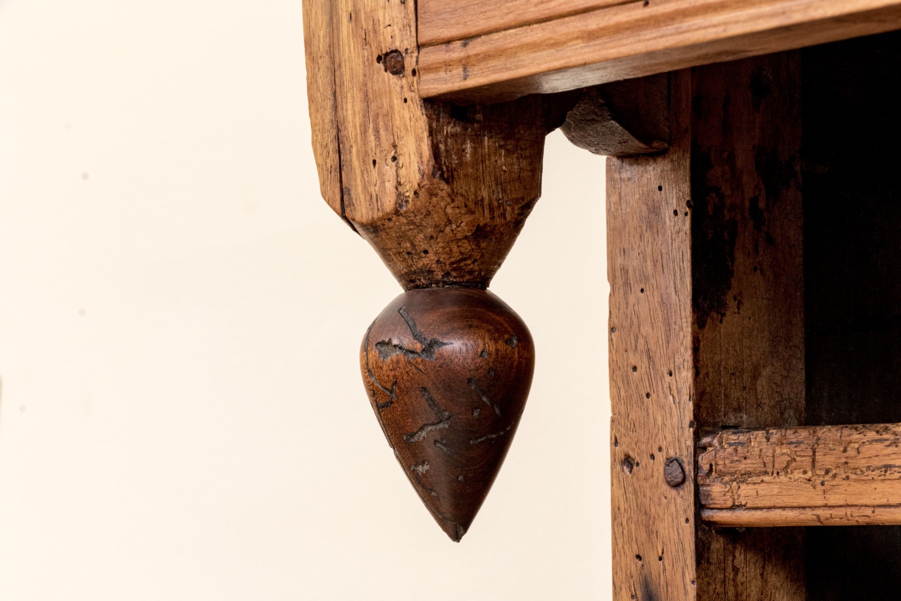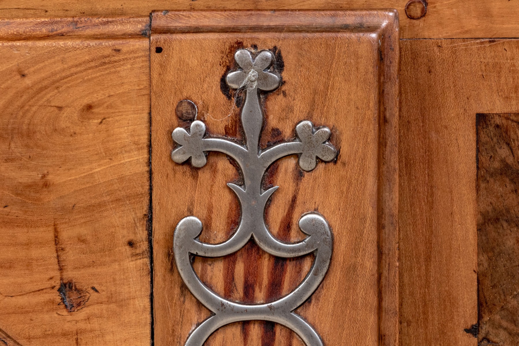 The French term vaisselier refers to a piece of furniture for storing and exhibiting china in the formal or informal dining rooms of provincial homes. Traditional French country vaisseliers, consist of a two door buffet, occasionally with drawers, with a shelved cupboard resting on top of it. With ornate brass mounts and hardware. A key. Opens to two paper lined shelves. Top Cupboard with four shelves.
