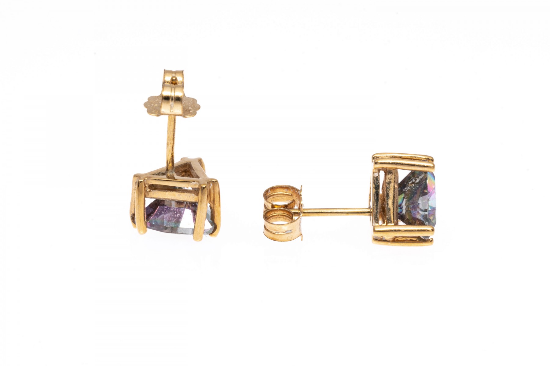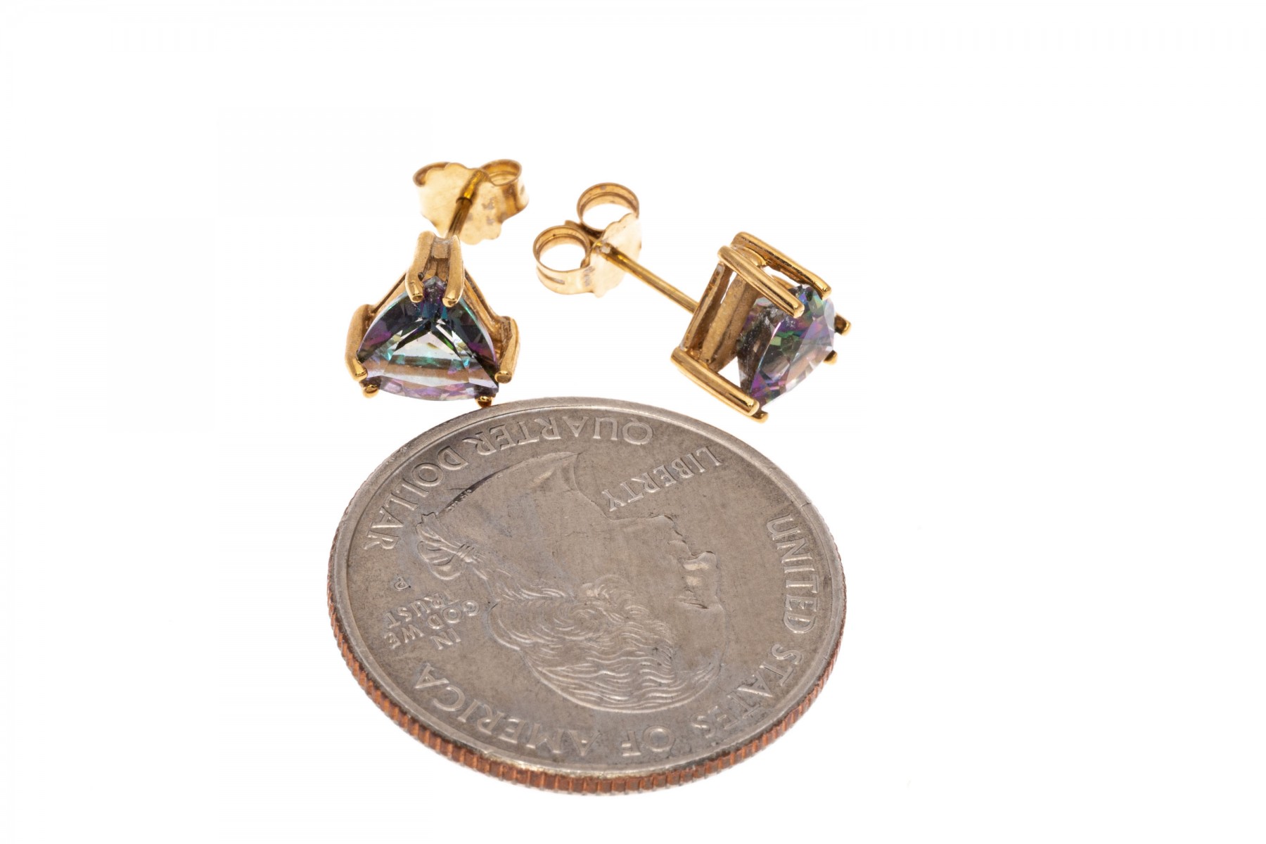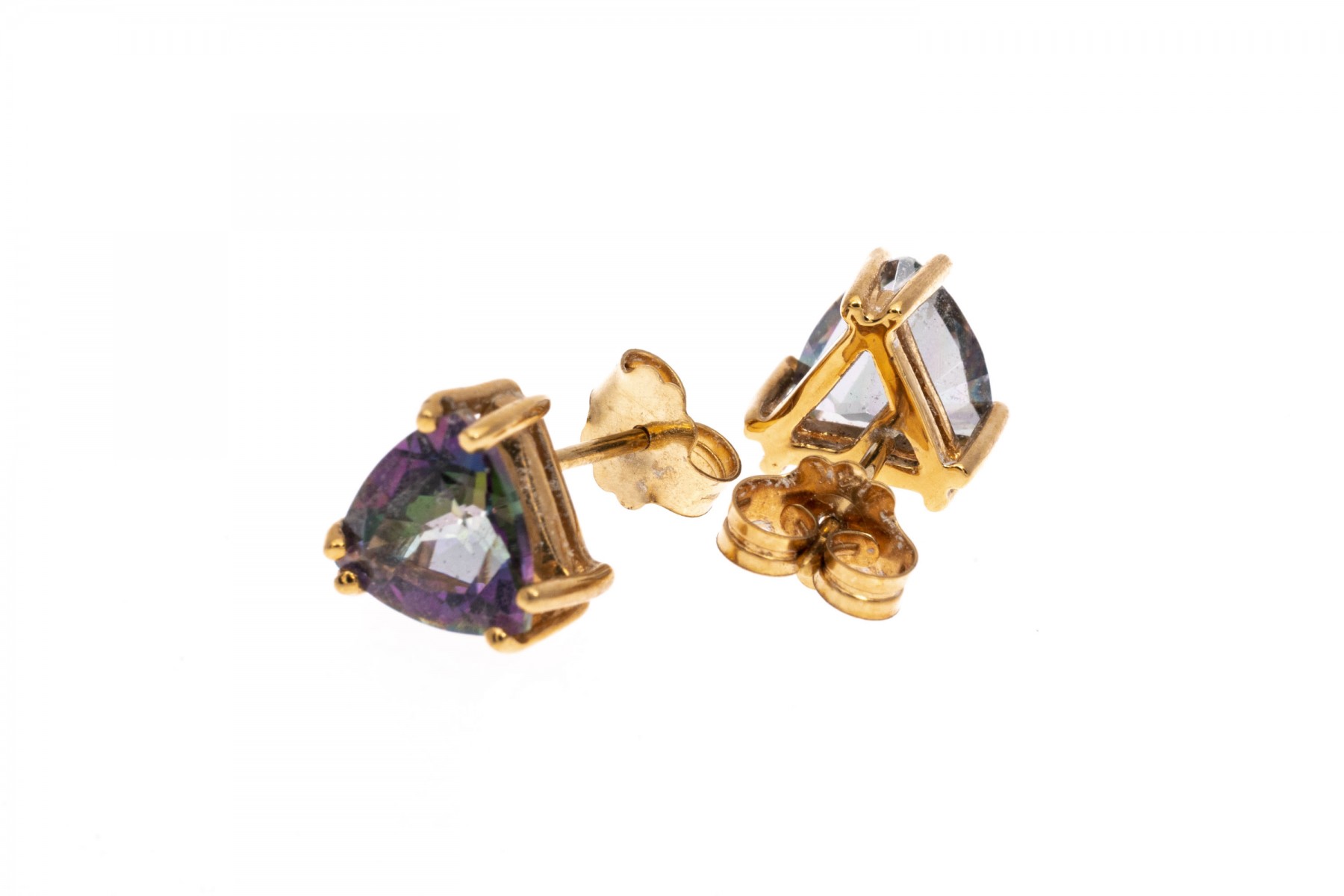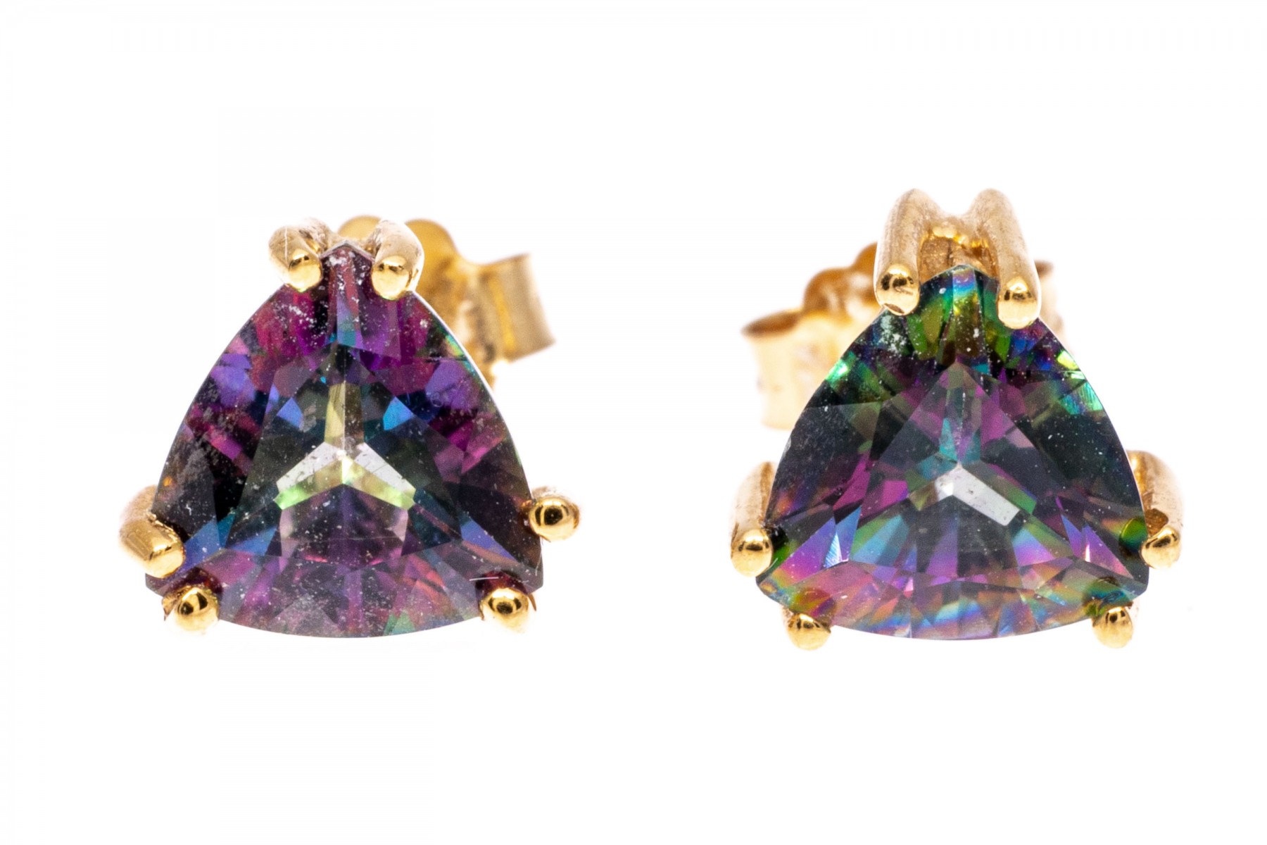 A colorful pair of 14K gold stud earrings featuring iridescent, triangular cut mystic topaz stones, approximately 1.95 TCW. Prong set stones with post and clutch backs.