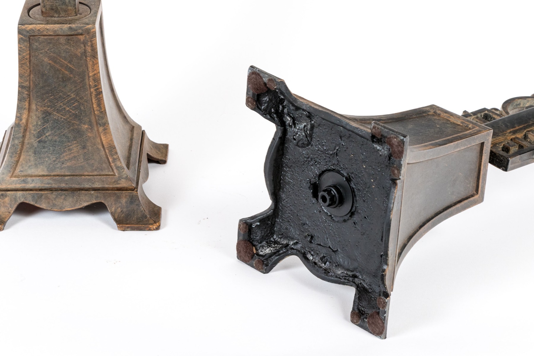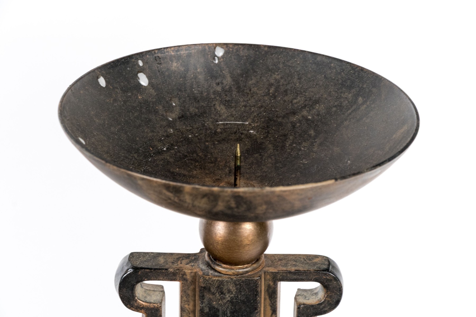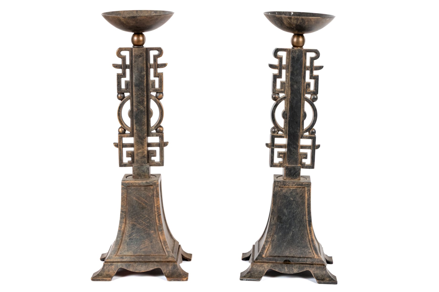 An eye-catching pair of Chinese cast bronze candlesticks designed with prick centers in deep rounded bowls on sphere knops heralding rectangular columns flanked by stylish openwork. The columns lead to elegantly tapered square bases on flared feet.