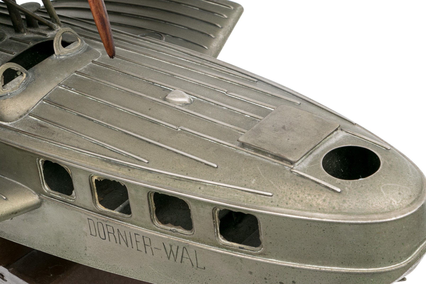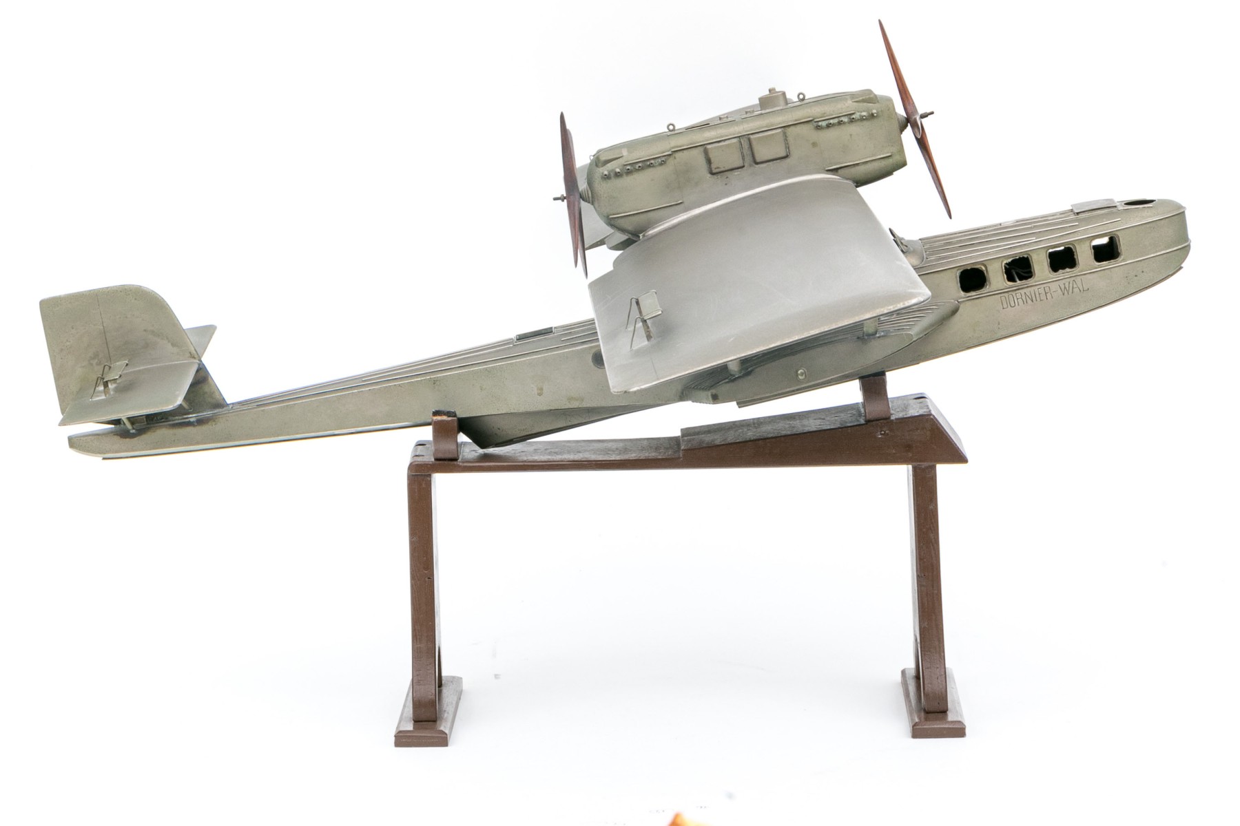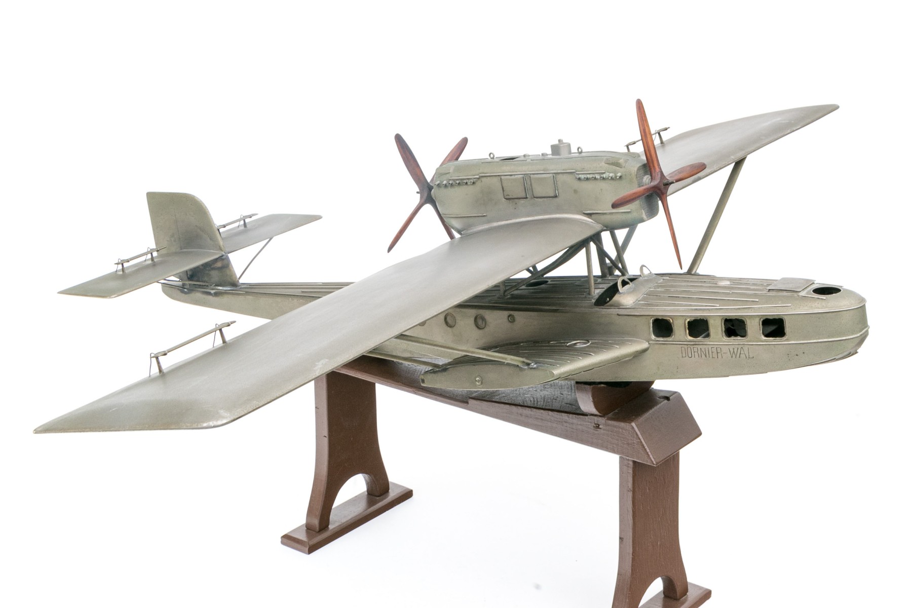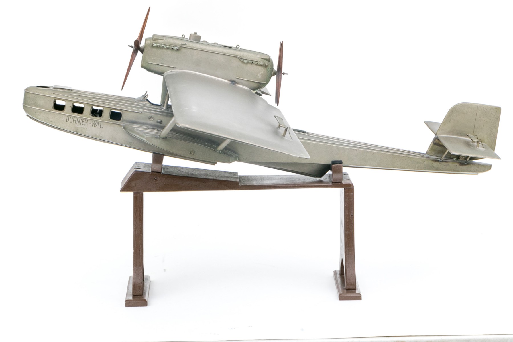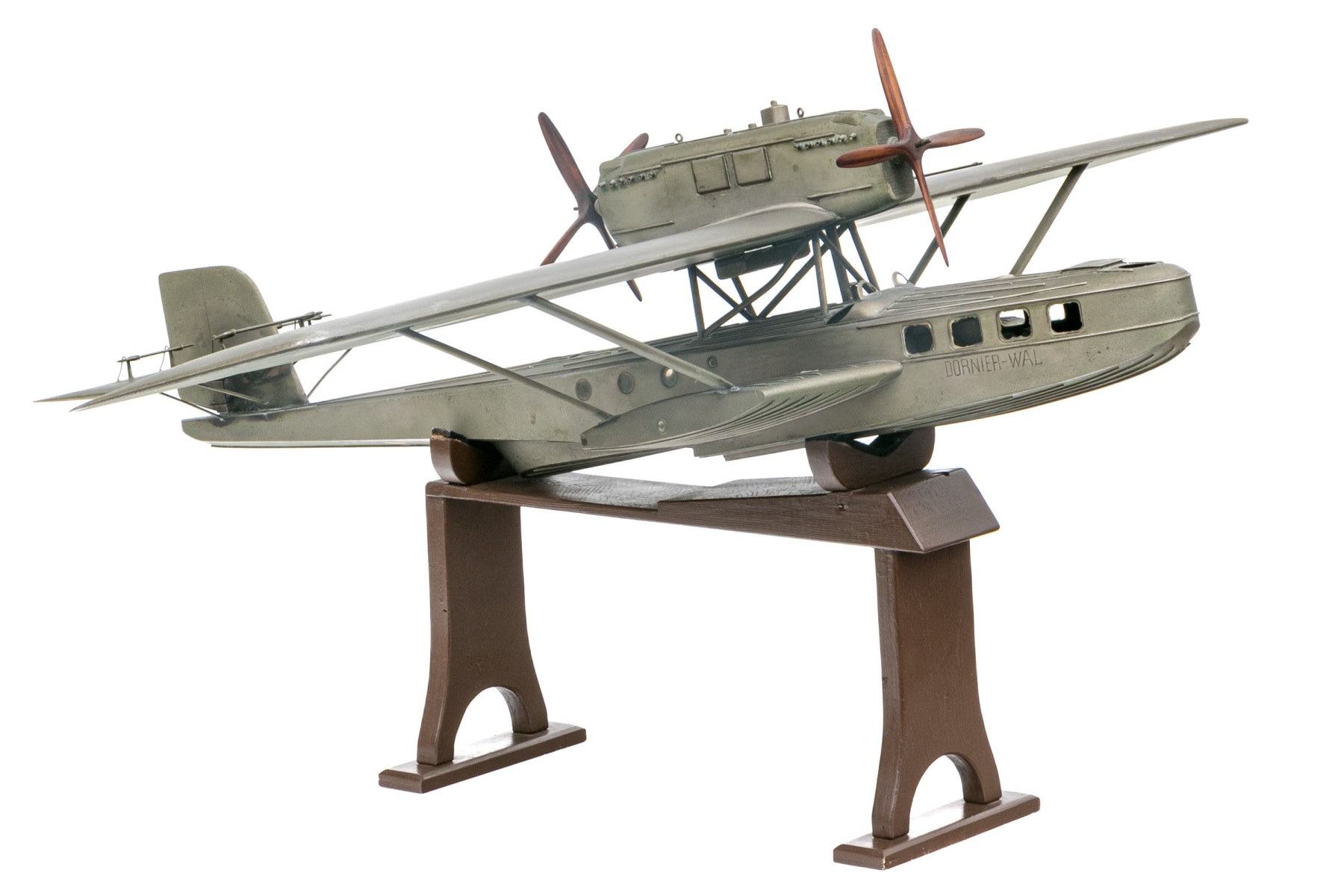 A 1930s nonferrous (probably white brass) engineering model of a “Dornier-Wal.” Handmade scale replica and most likely a journeyman's or machinist project. Examples are incredibly rare with all known examples either in the Smithsonian or Dornier-Wal Museum (Germany). The model is heavy and well constructed with great detail and beautiful welded or soldered joints, two hand carved wooden propellers are mounted on the top. It mounts on a custom wooden stand.