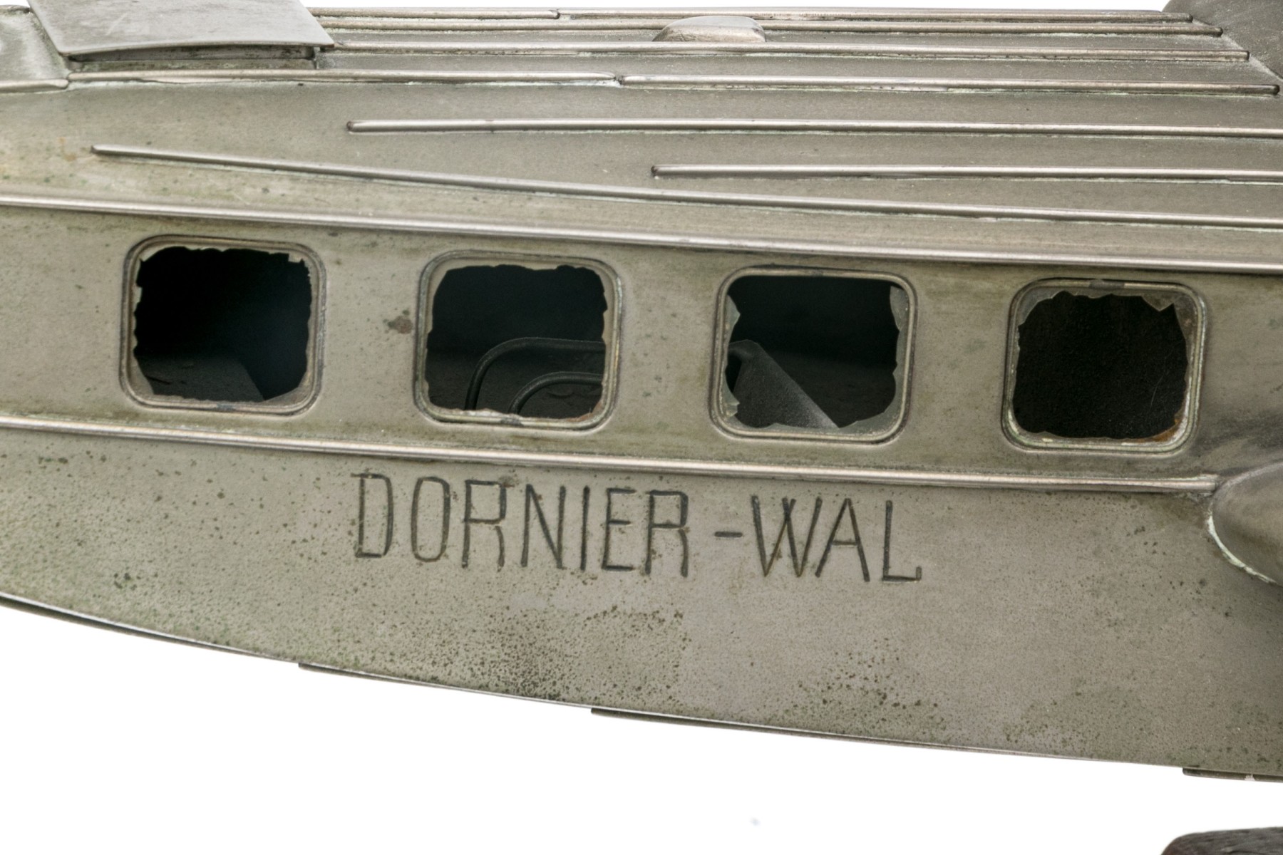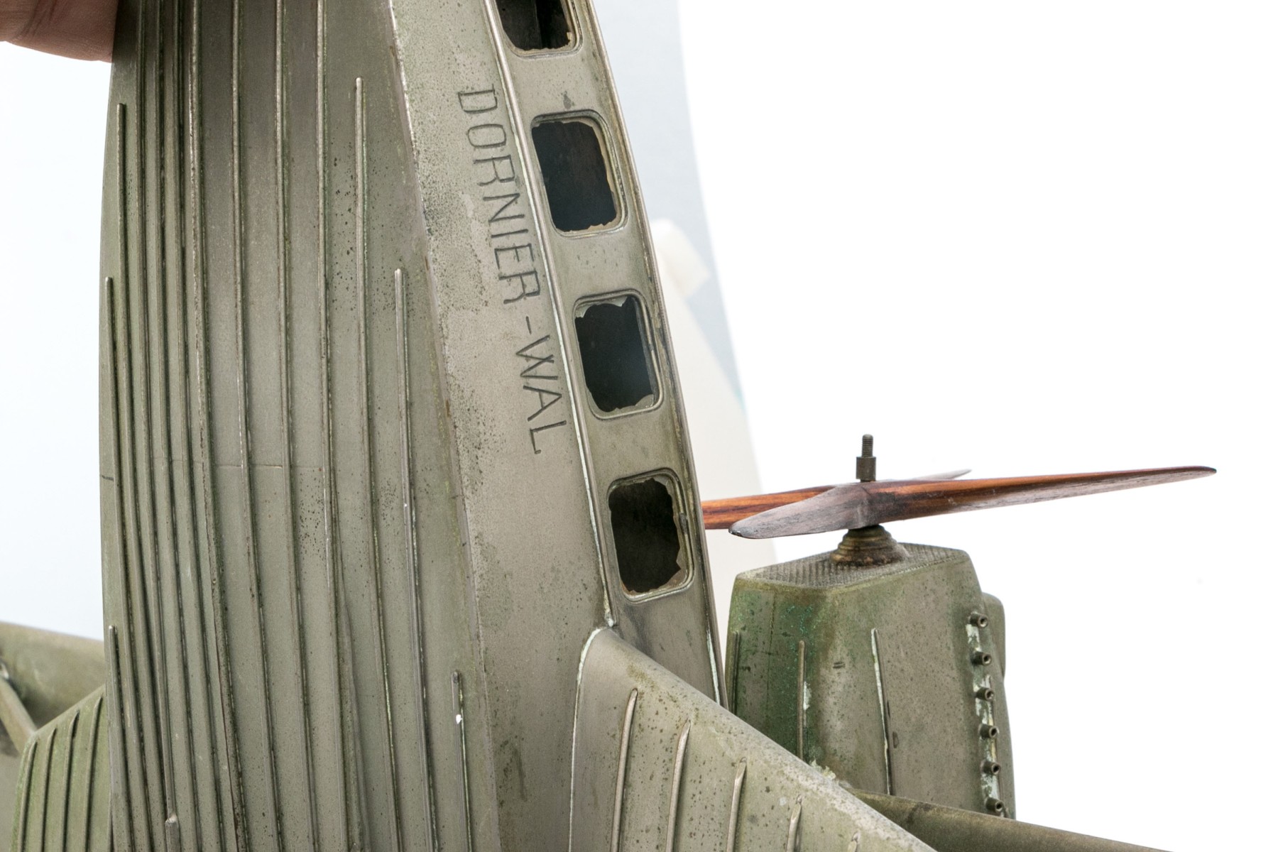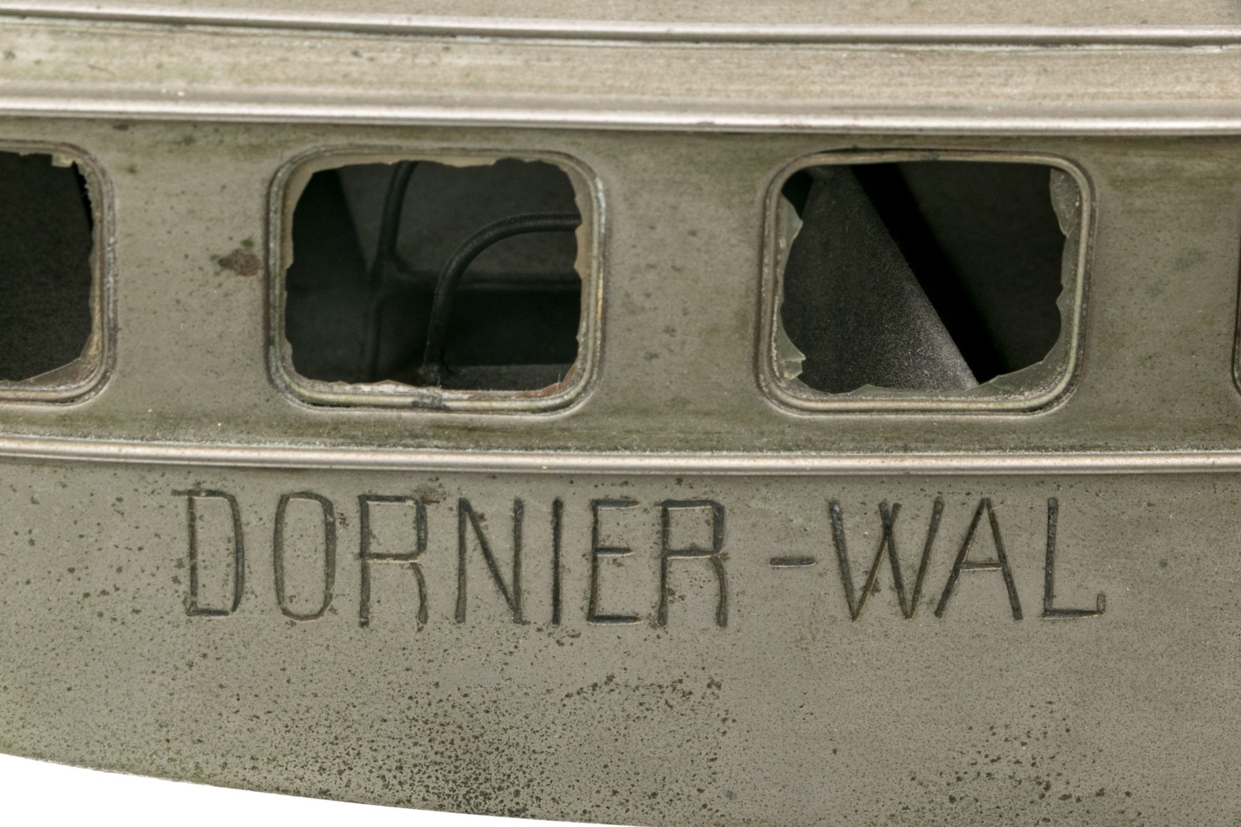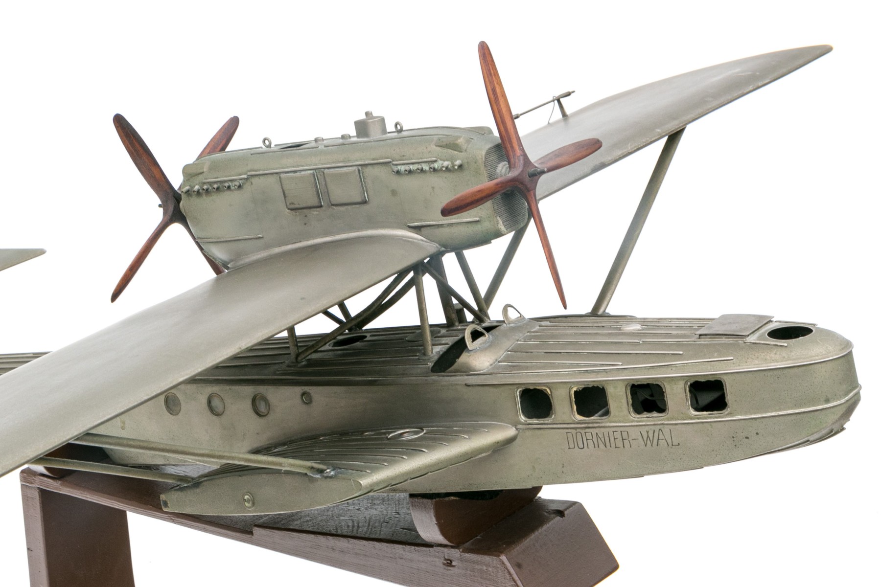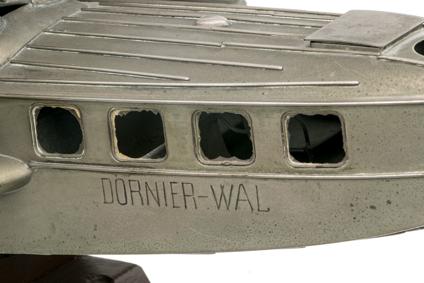 A 1930s nonferrous (probably white brass) engineering model of a “Dornier-Wal.” Handmade scale replica and most likely a journeyman's or machinist project. Examples are incredibly rare with all known examples either in the Smithsonian or Dornier-Wal Museum (Germany). The model is heavy and well constructed with great detail and beautiful welded or soldered joints, two hand carved wooden propellers are mounted on the top. It mounts on a custom wooden stand.