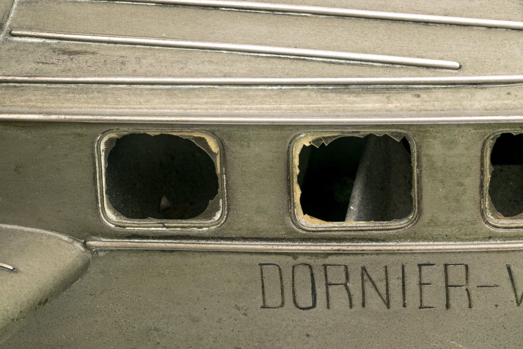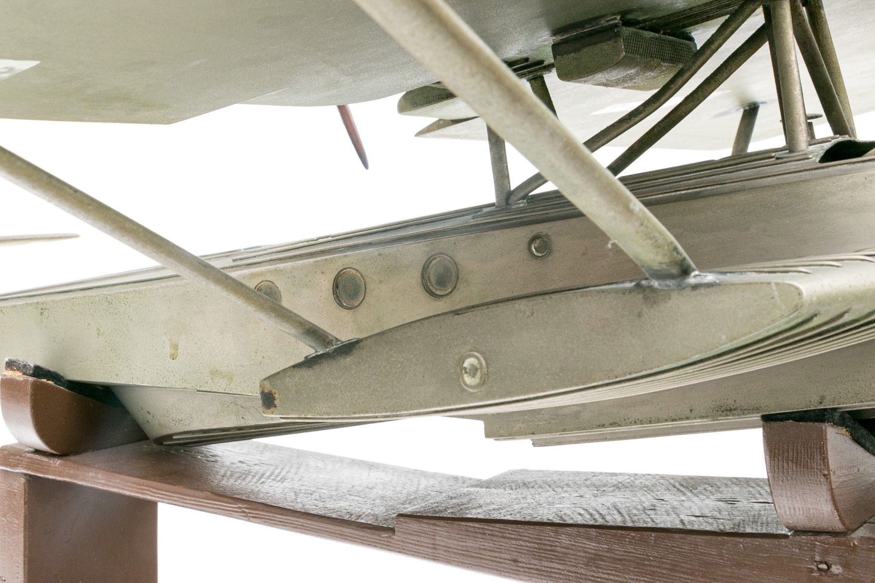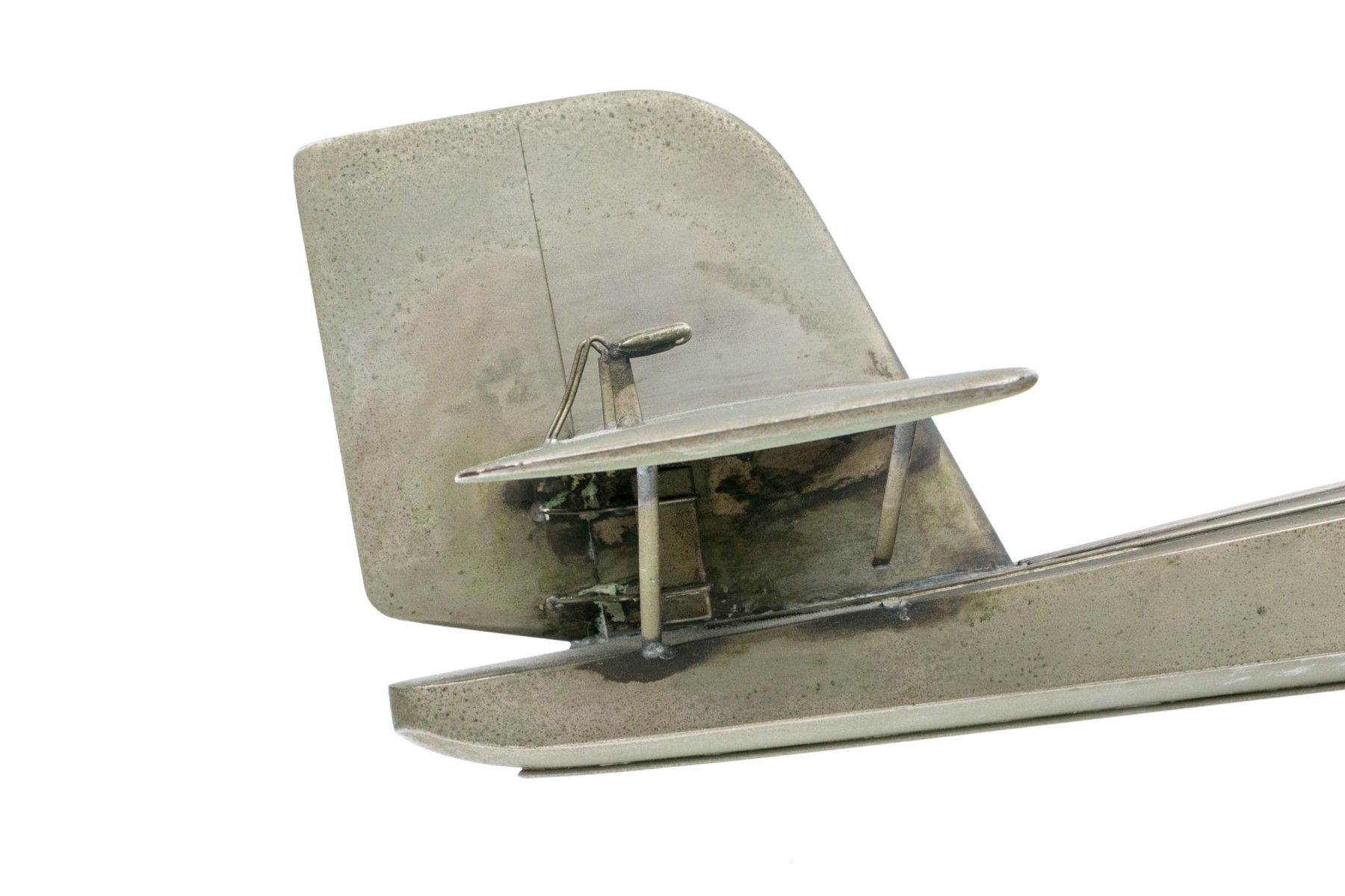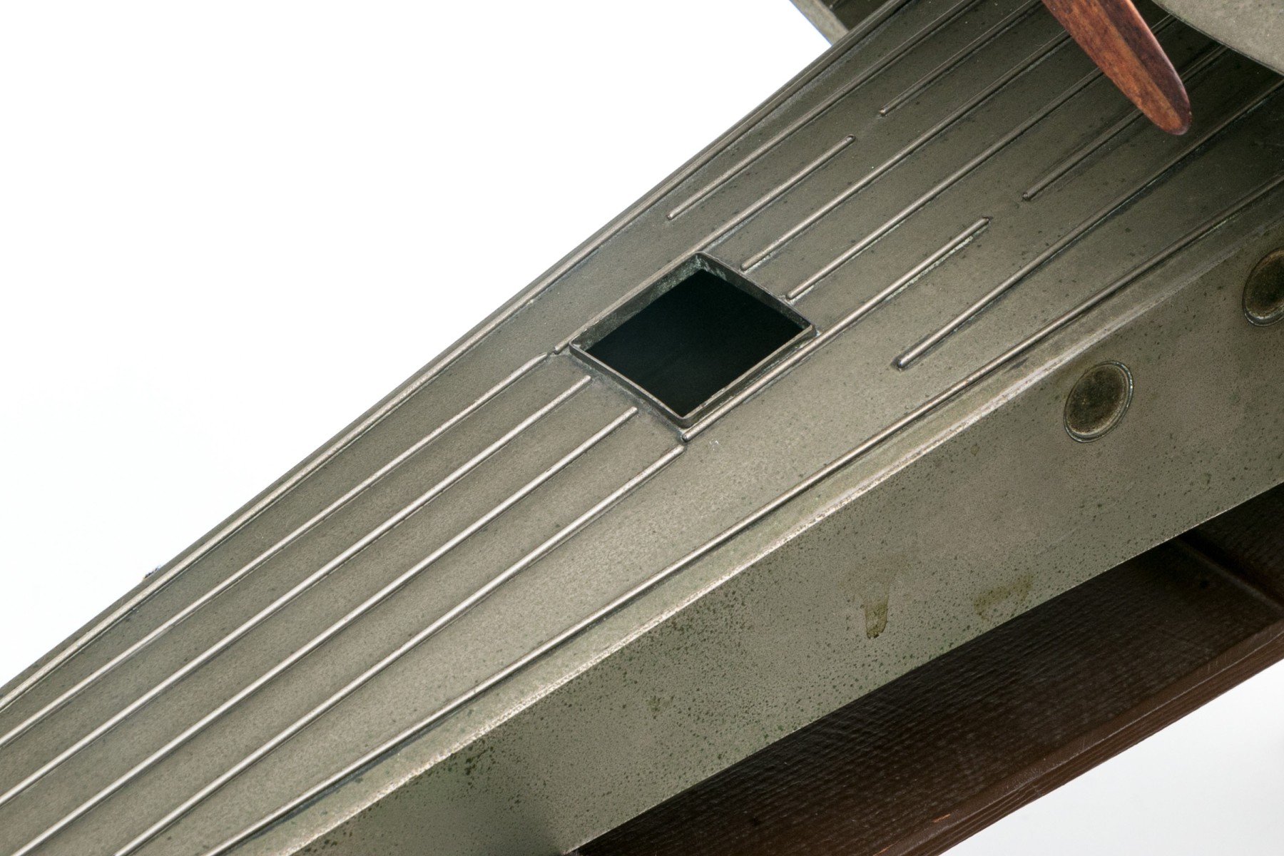 A 1930s nonferrous (probably white brass) engineering model of a “Dornier-Wal.” Handmade scale replica and most likely a journeyman's or machinist project. Examples are incredibly rare with all known examples either in the Smithsonian or Dornier-Wal Museum (Germany). The model is heavy and well constructed with great detail and beautiful welded or soldered joints, two hand carved wooden propellers are mounted on the top. It mounts on a custom wooden stand.