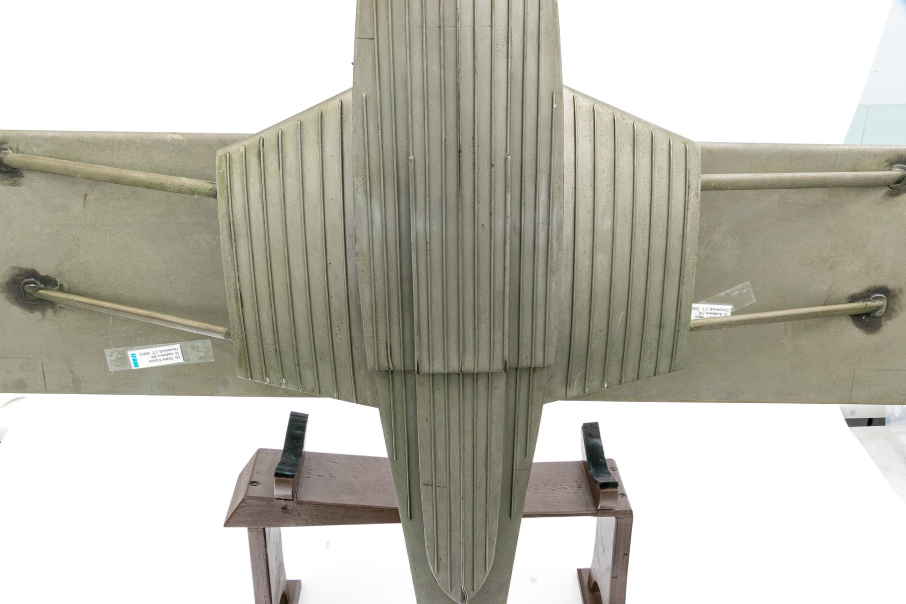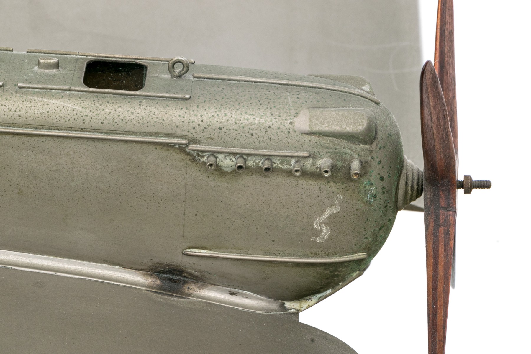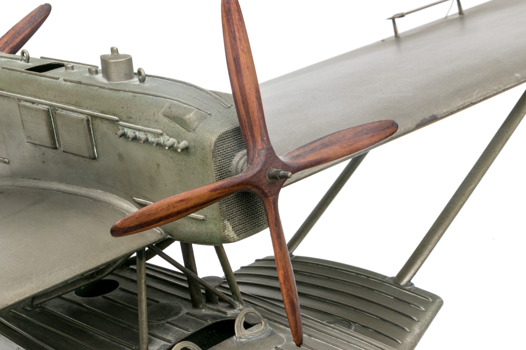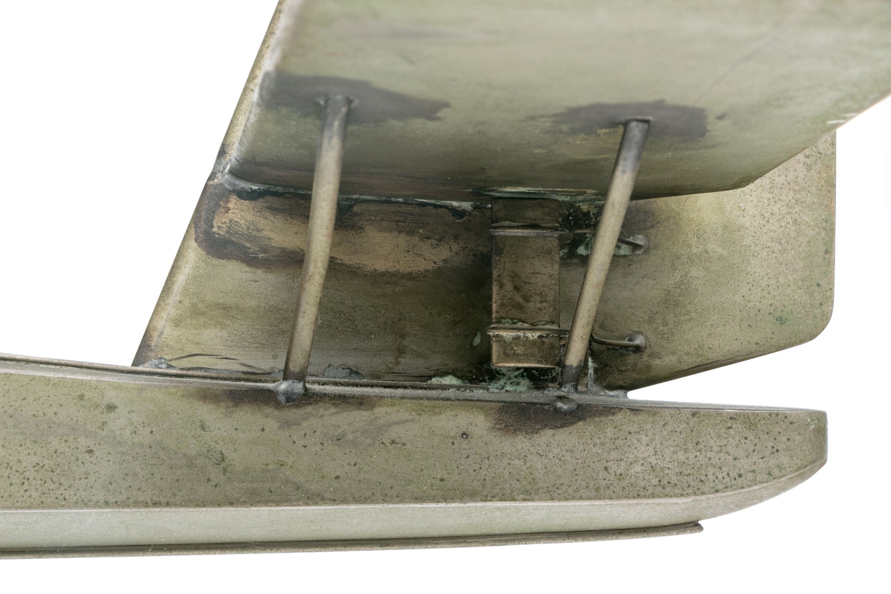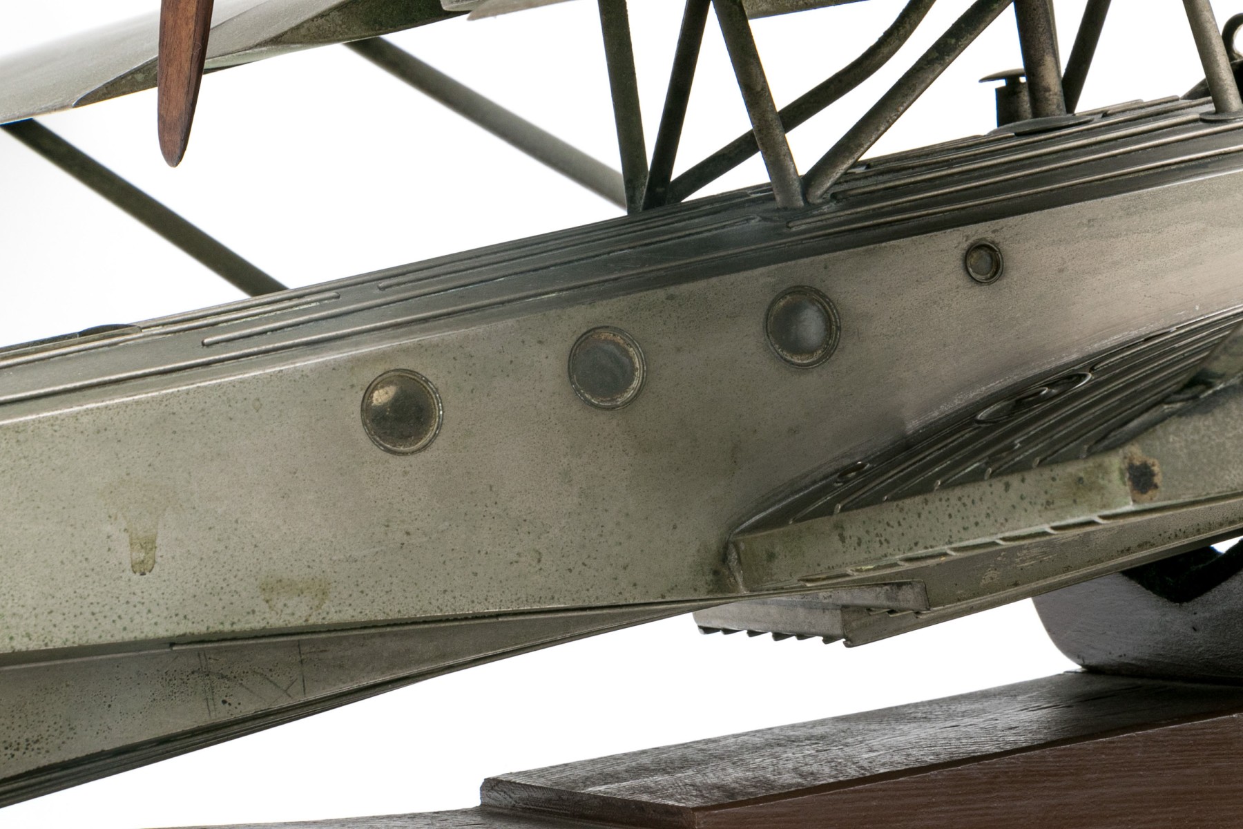 A 1930s nonferrous (probably white brass) engineering model of a “Dornier-Wal.” Handmade scale replica and most likely a journeyman's or machinist project. Examples are incredibly rare with all known examples either in the Smithsonian or Dornier-Wal Museum (Germany). The model is heavy and well constructed with great detail and beautiful welded or soldered joints, two hand carved wooden propellers are mounted on the top. It mounts on a custom wooden stand.