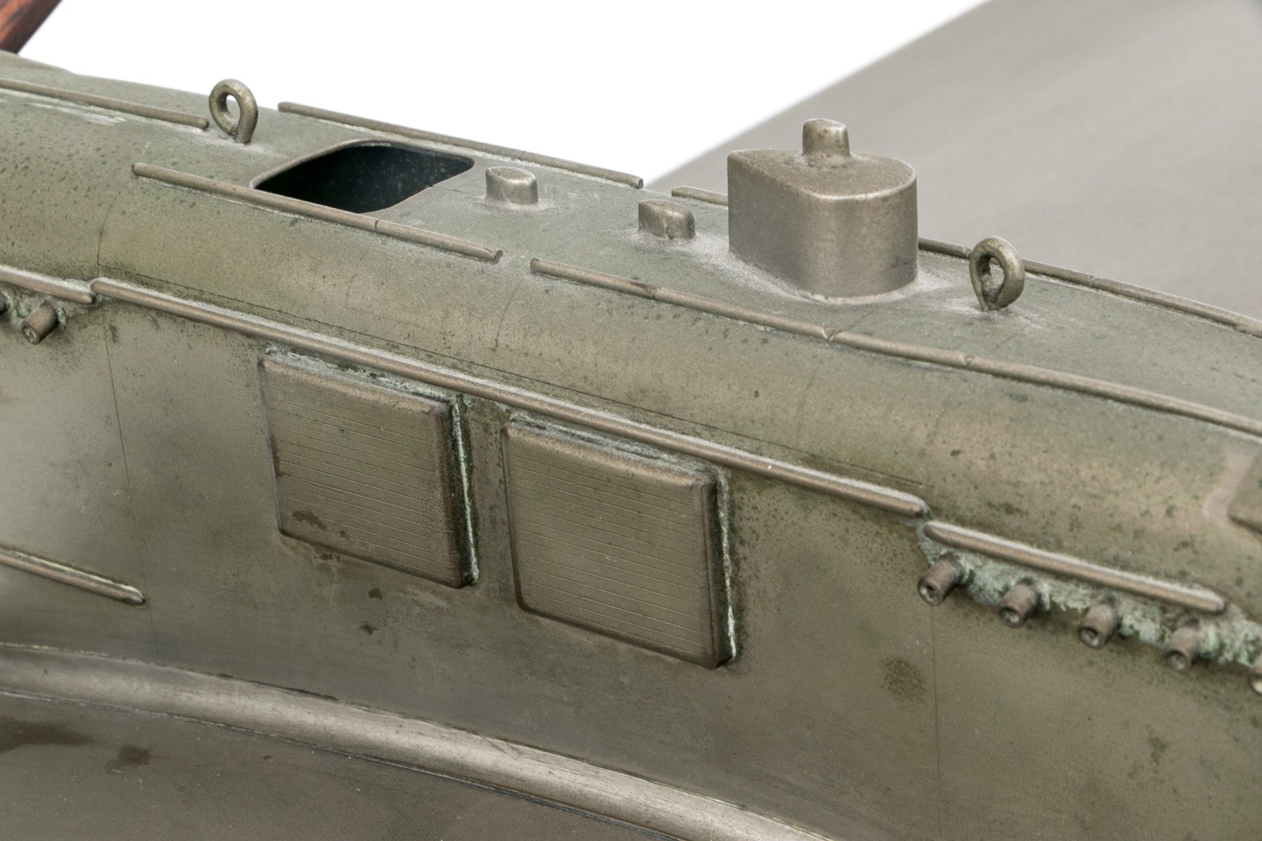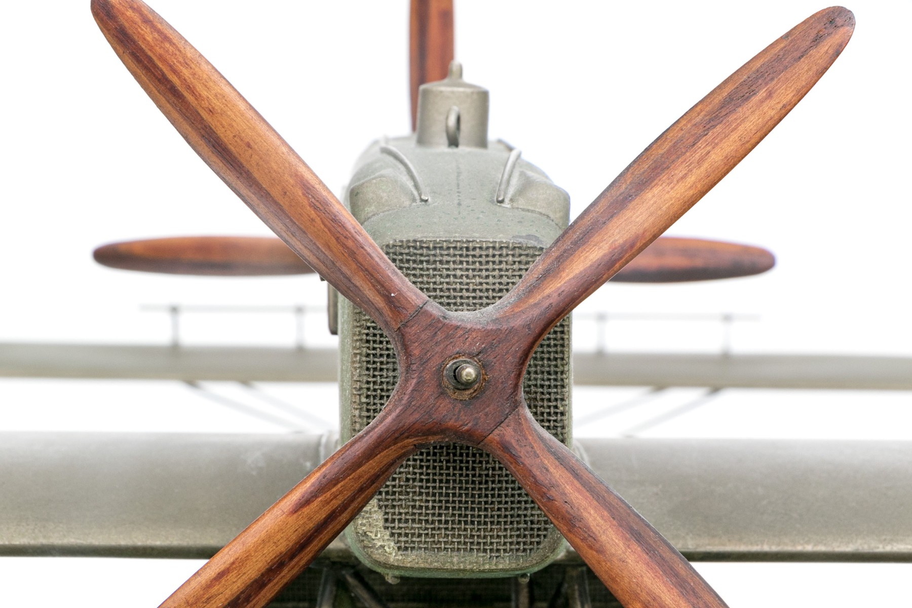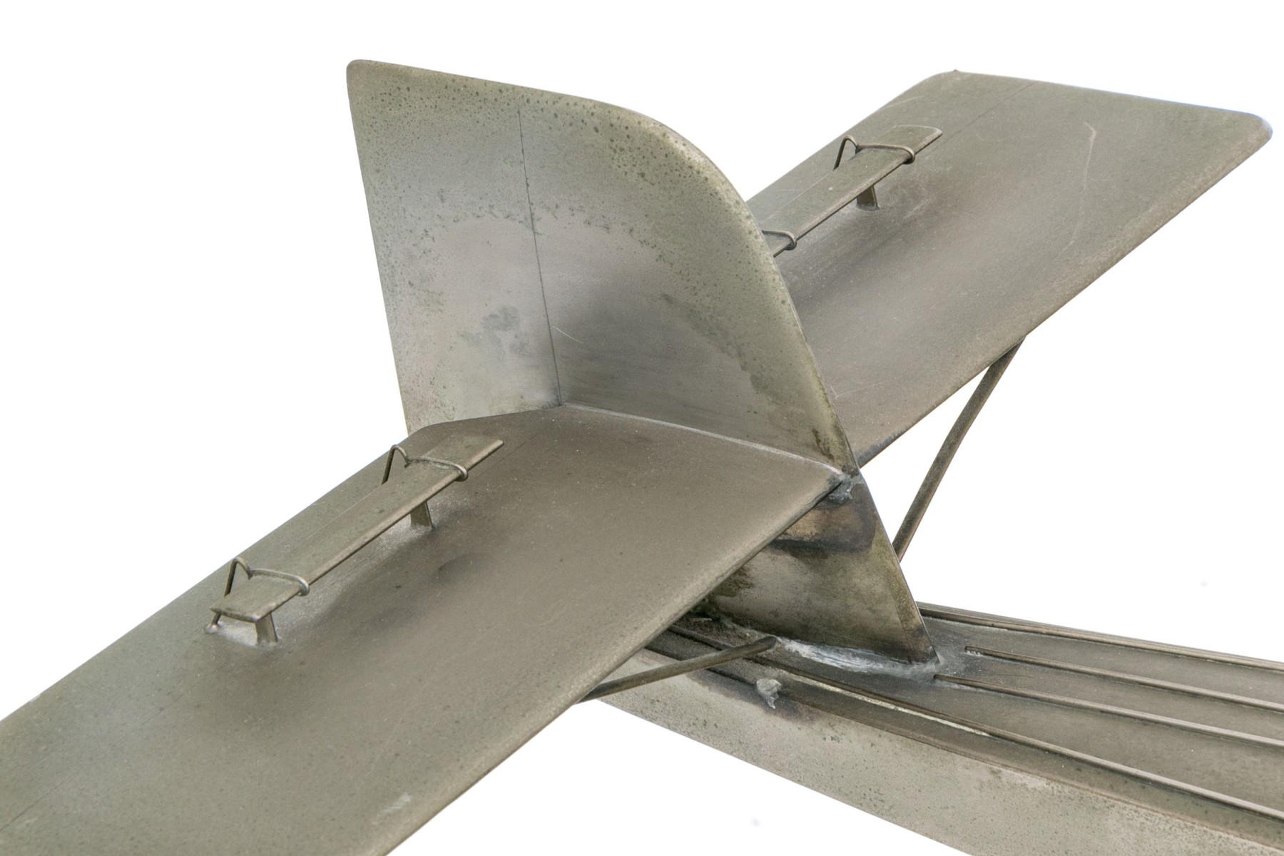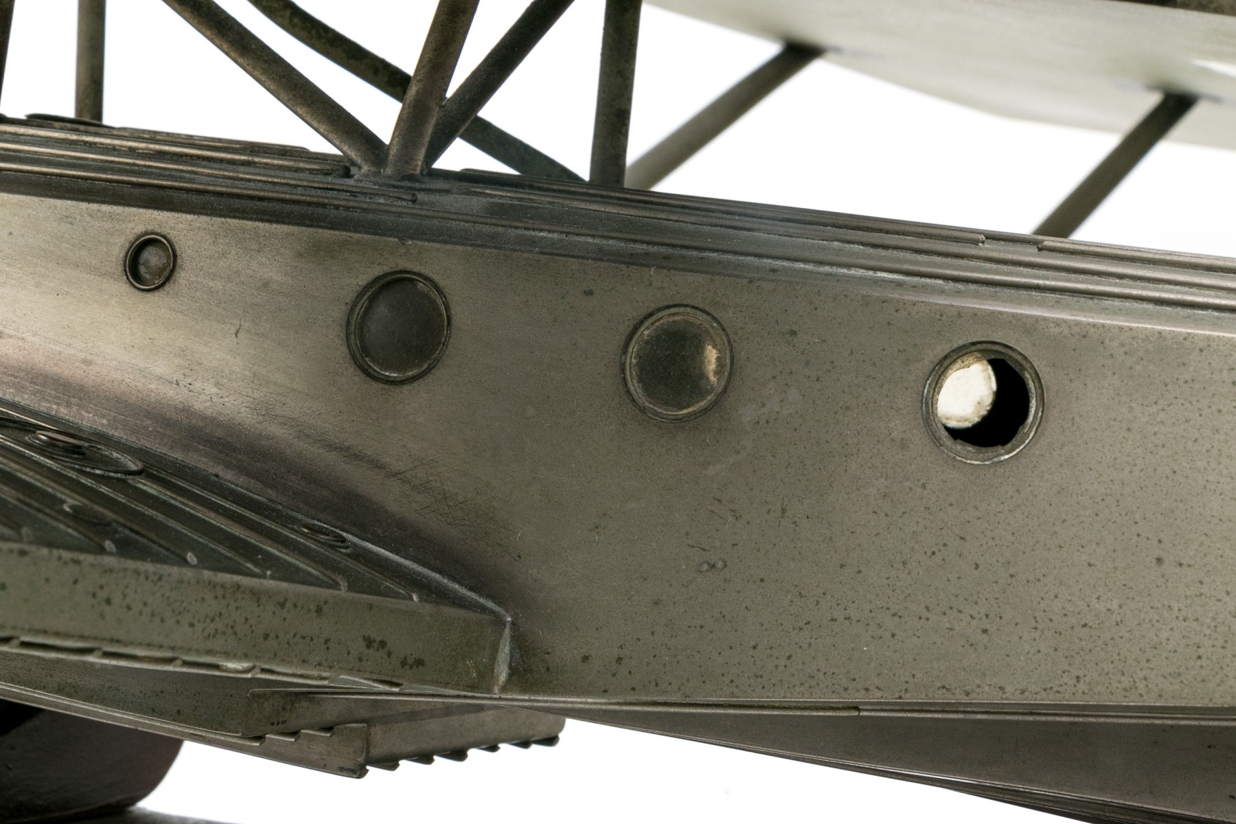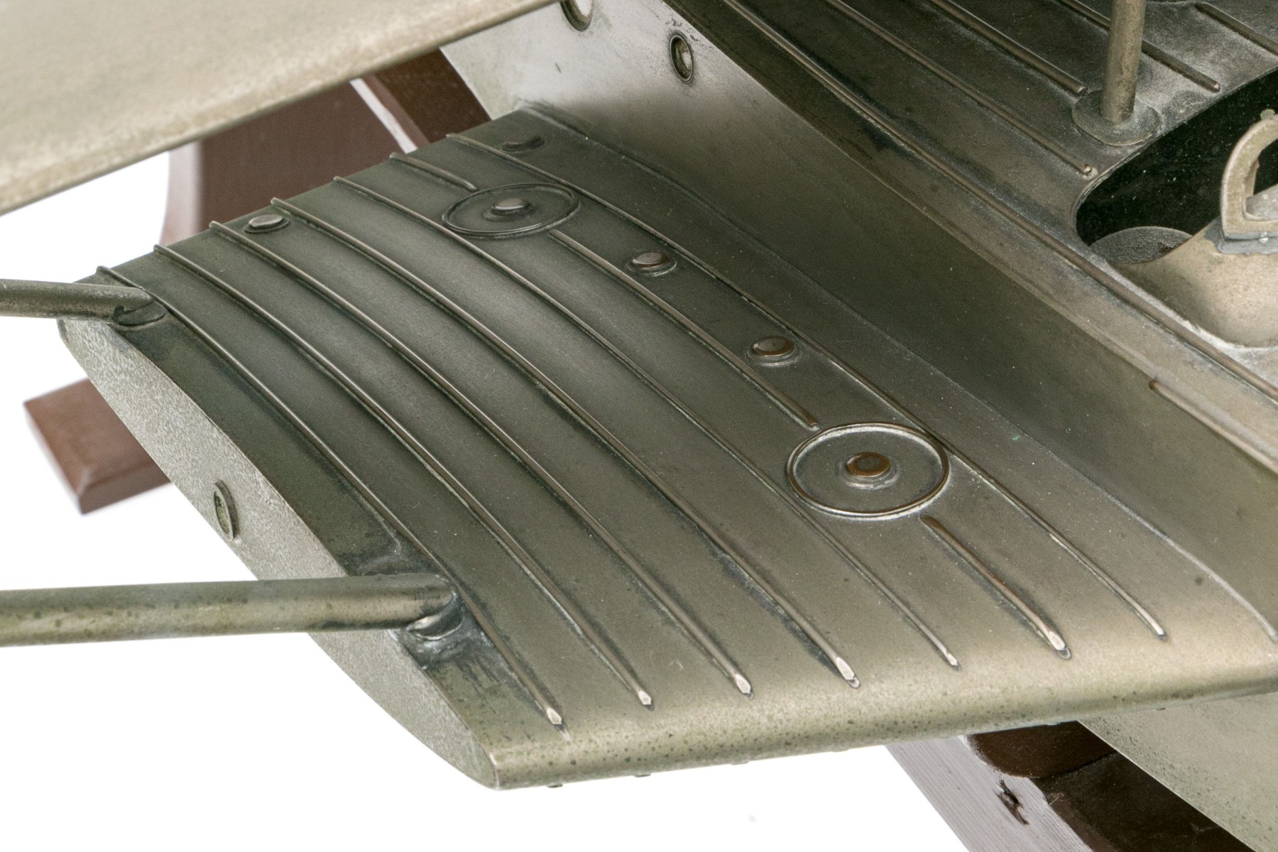 A 1930s nonferrous (probably white brass) engineering model of a “Dornier-Wal.” Handmade scale replica and most likely a journeyman's or machinist project. Examples are incredibly rare with all known examples either in the Smithsonian or Dornier-Wal Museum (Germany). The model is heavy and well constructed with great detail and beautiful welded or soldered joints, two hand carved wooden propellers are mounted on the top. It mounts on a custom wooden stand.