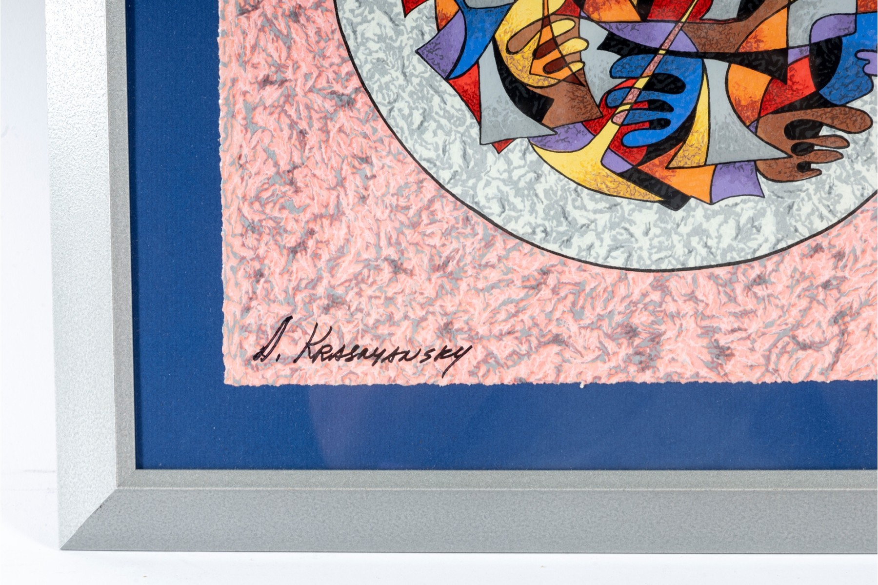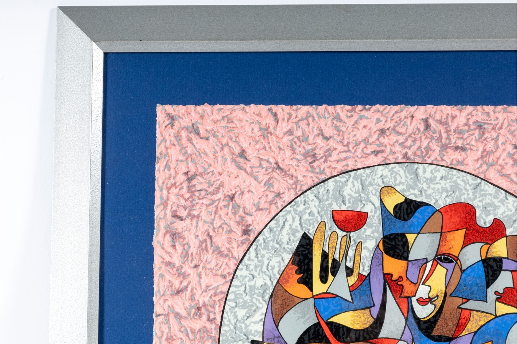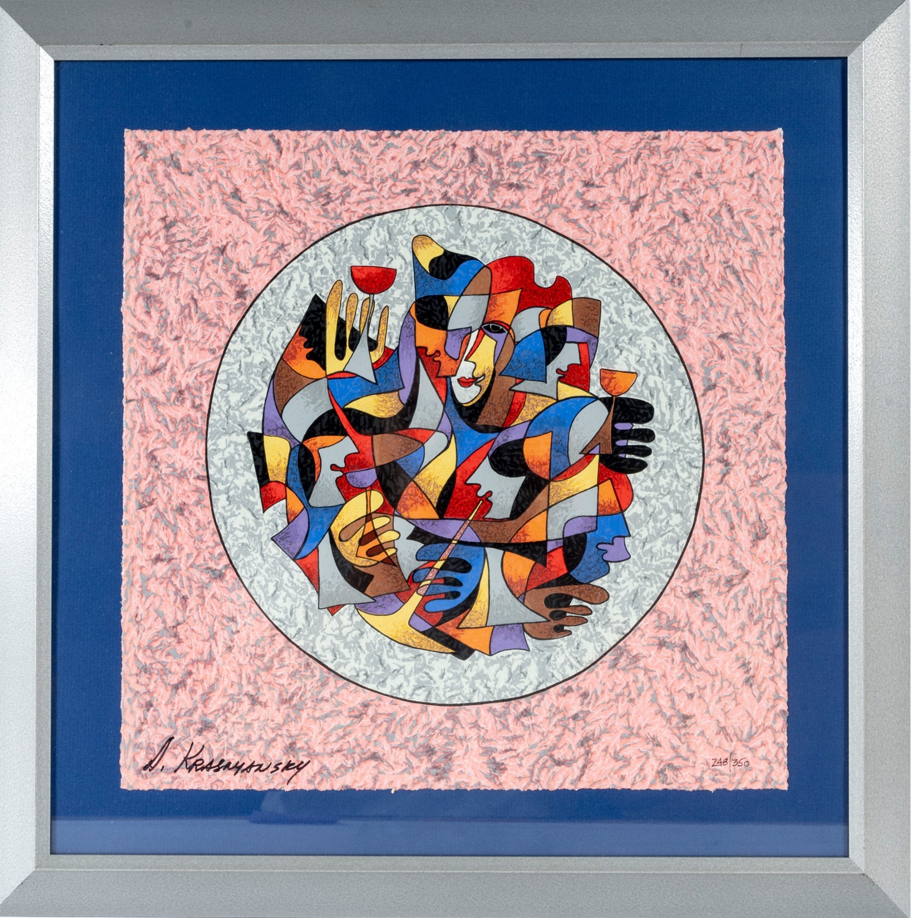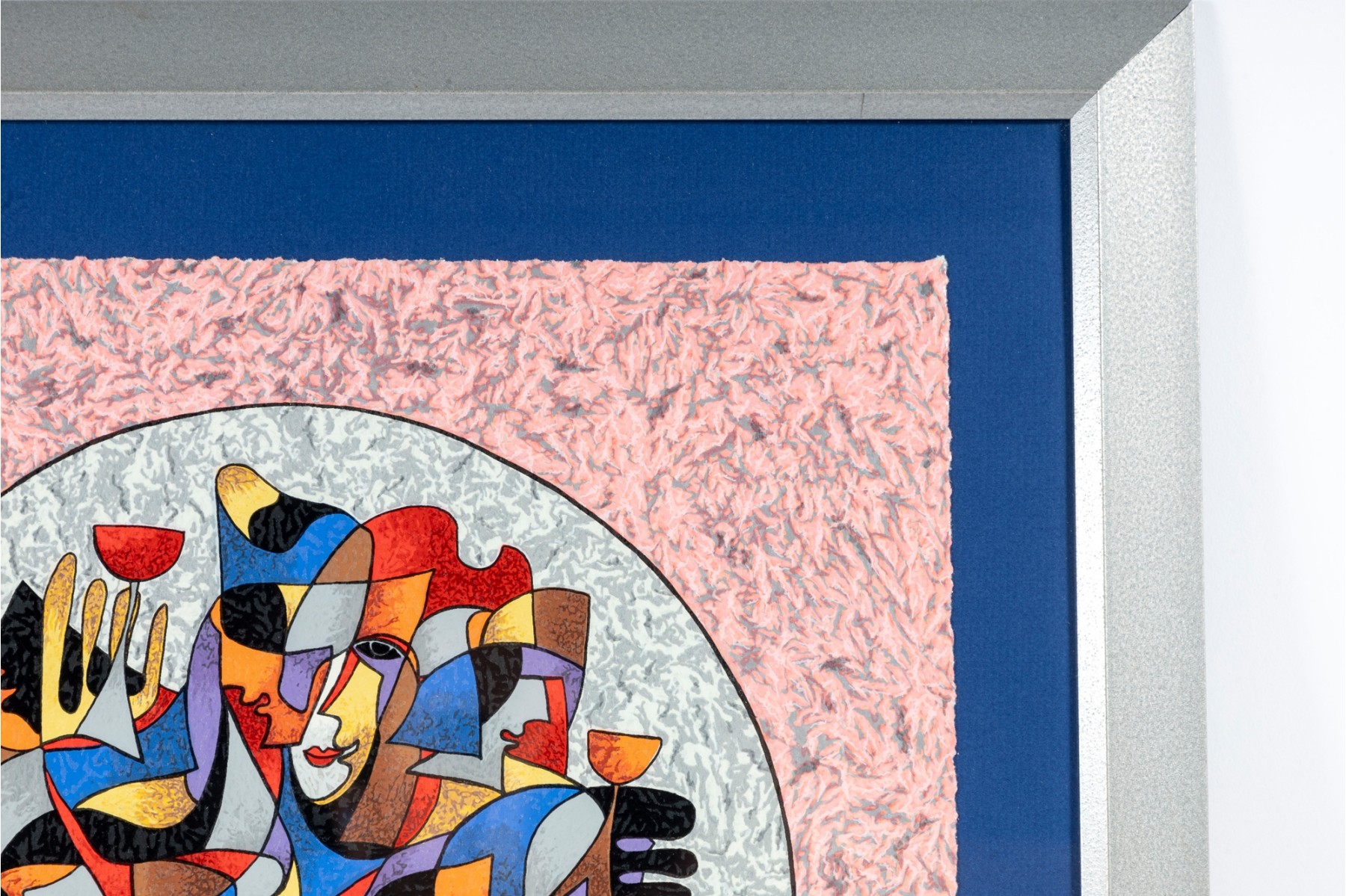 Anatole Krasnyansky (Ukrainian-American, 1930-2023) "Musical Sphere" serigraph depicting a cubist style gathering of musicians and figures holding goblets in fun, vibrant red, blue, orange, and brown with gestural linework creating a sense of movement and fluidity. The figures gather against a circular gray background, surrounded by a textural pink and gray field.