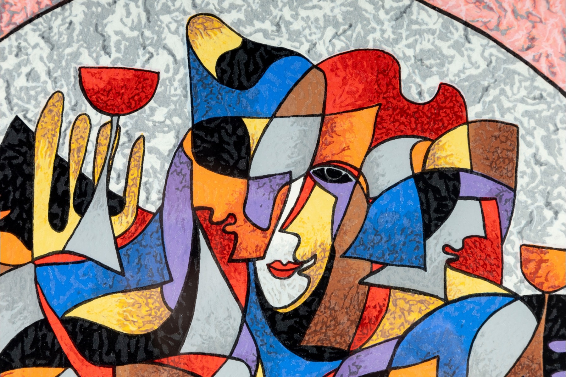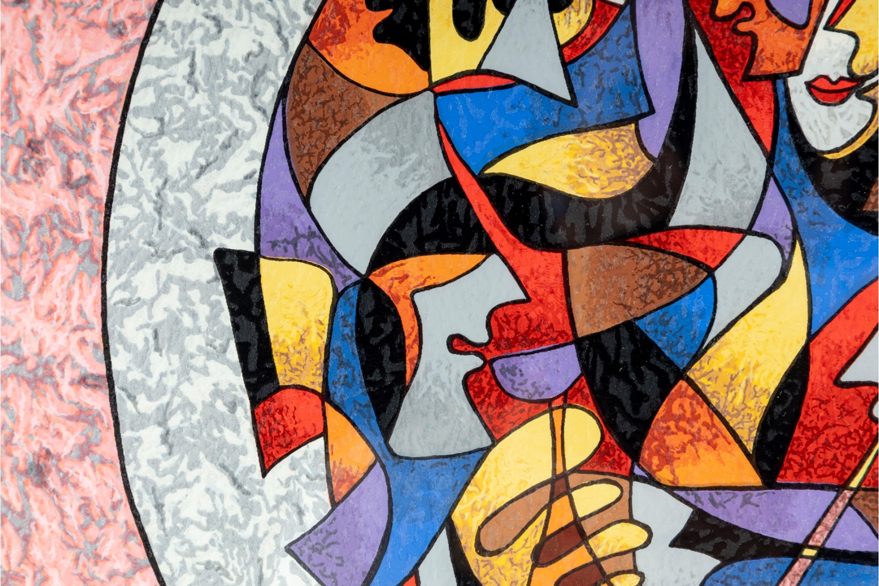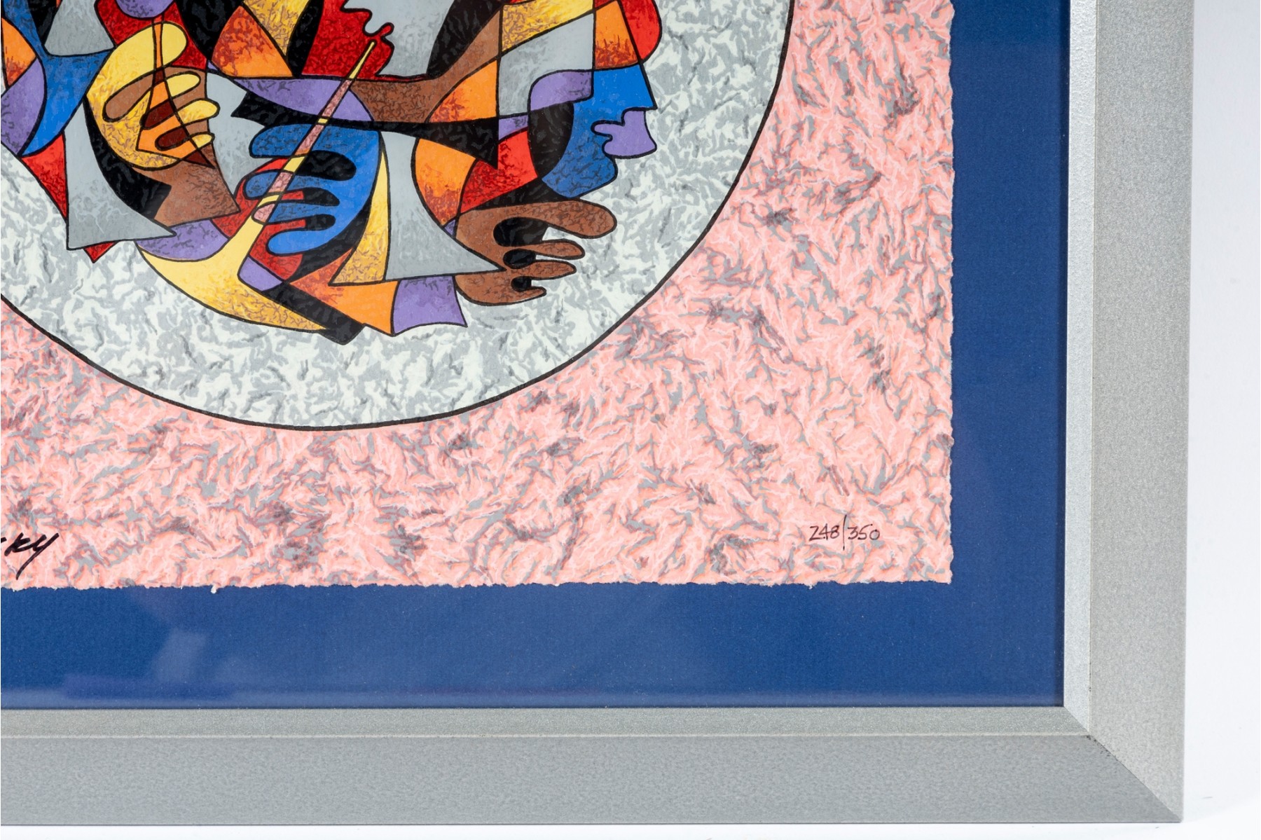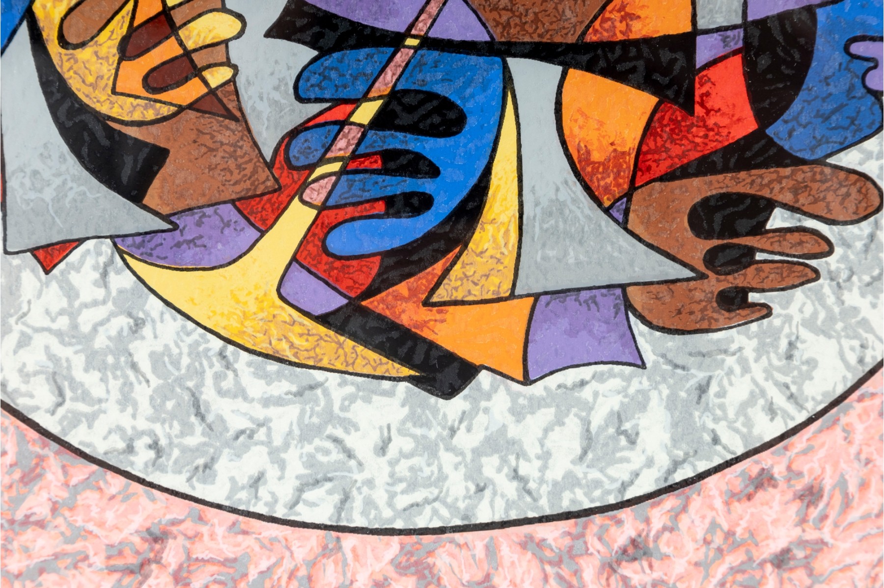 Anatole Krasnyansky (Ukrainian-American, 1930-2023) "Musical Sphere" serigraph depicting a cubist style gathering of musicians and figures holding goblets in fun, vibrant red, blue, orange, and brown with gestural linework creating a sense of movement and fluidity. The figures gather against a circular gray background, surrounded by a textural pink and gray field.