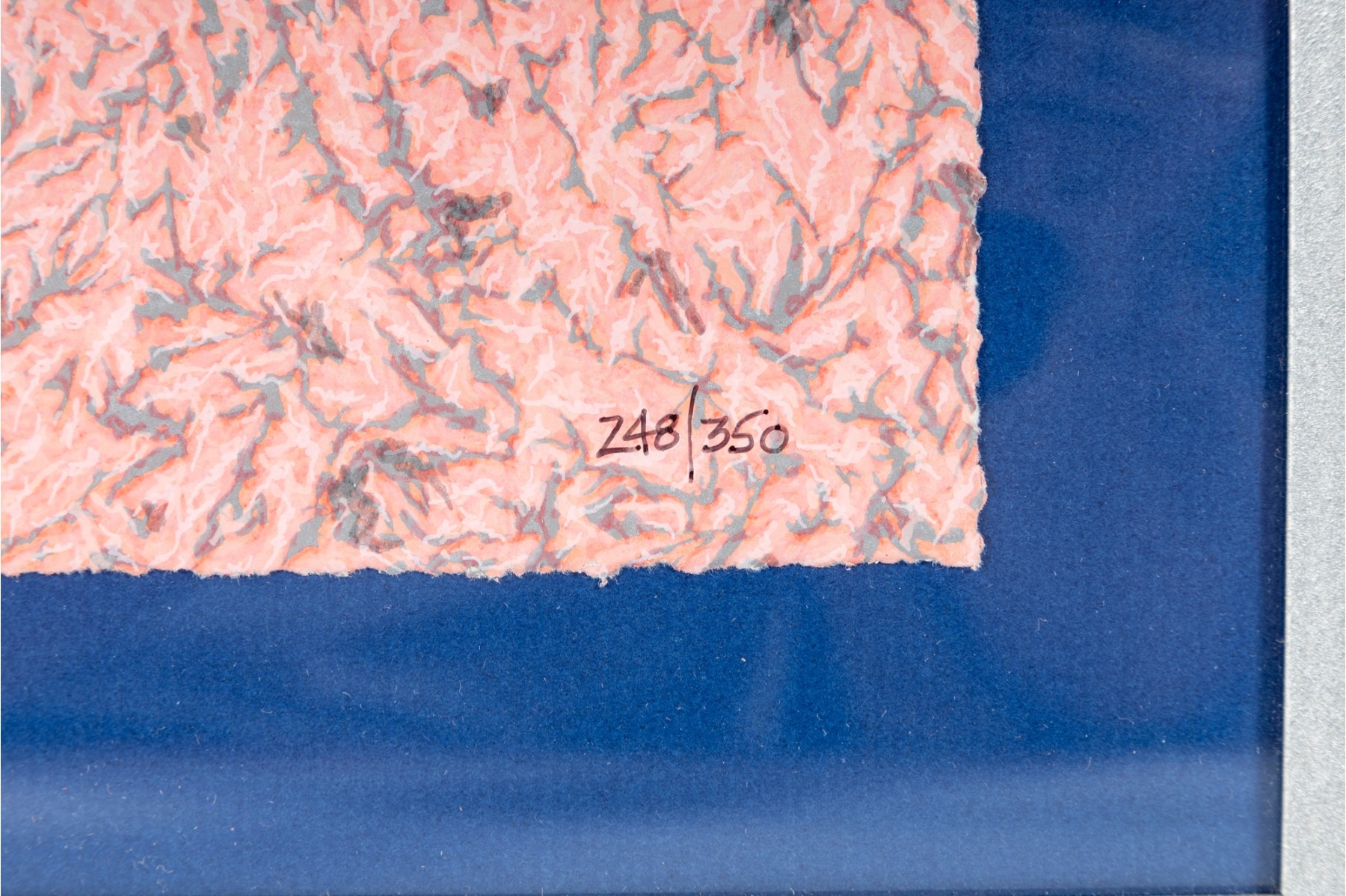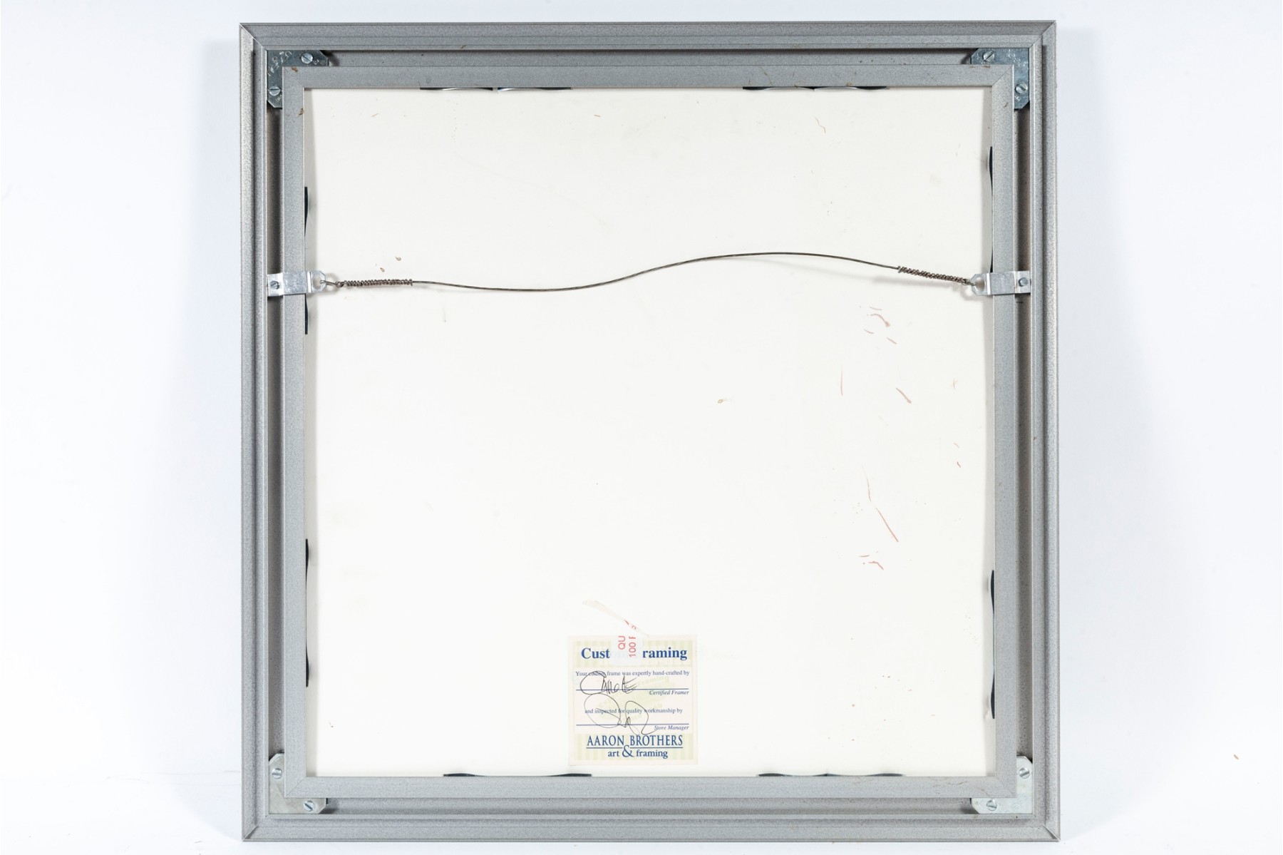 Mounted to a blue background, glazed, and displayed in a gray beveled frame.