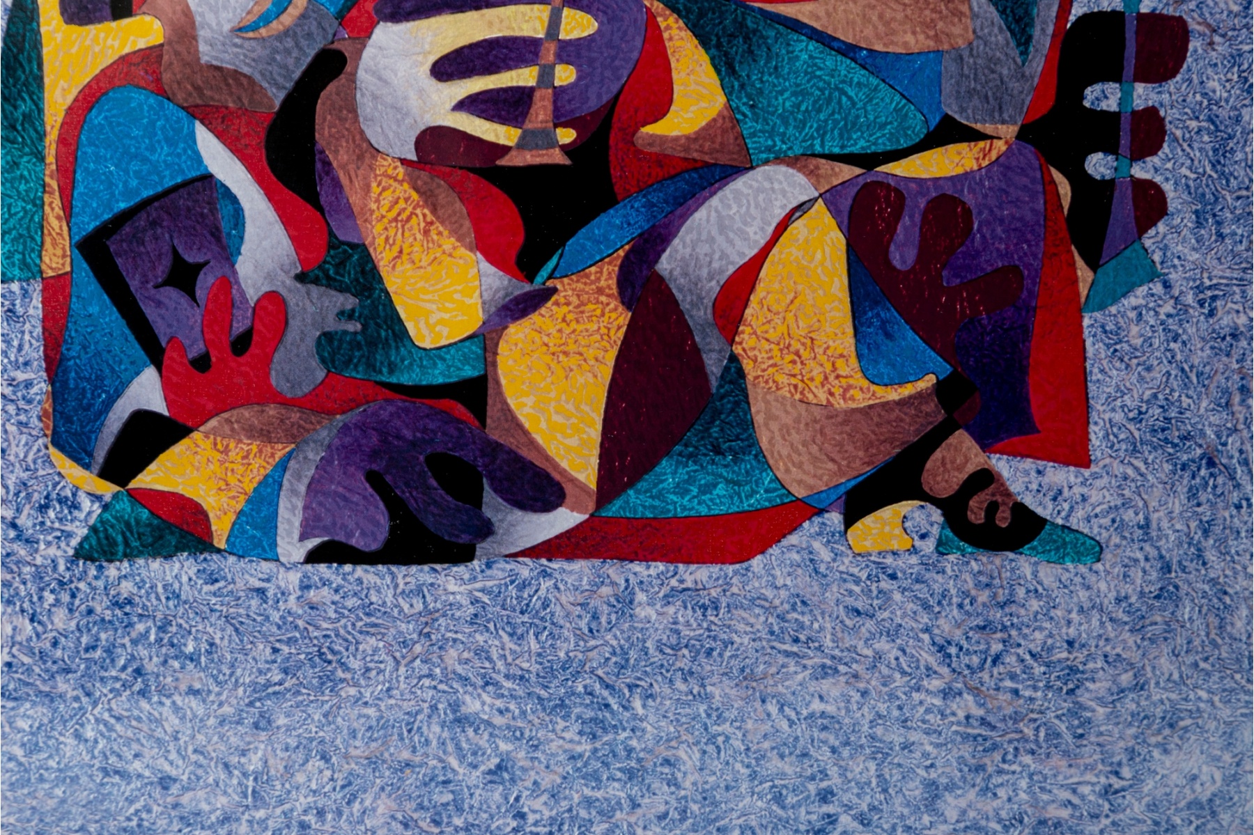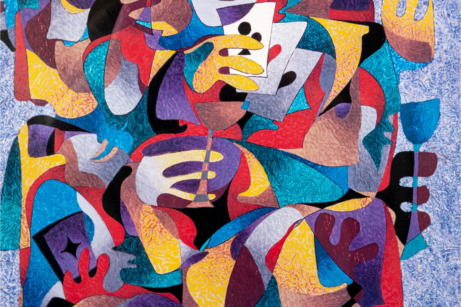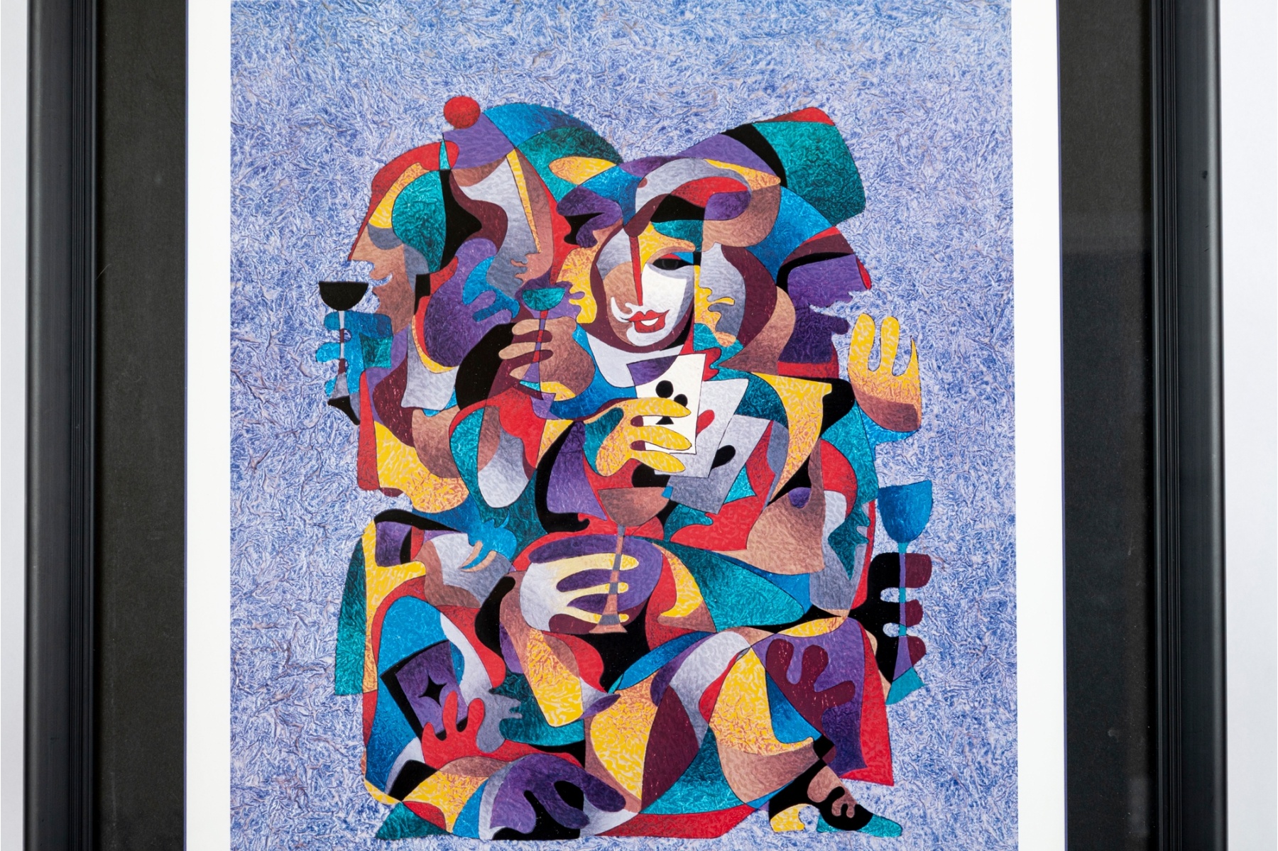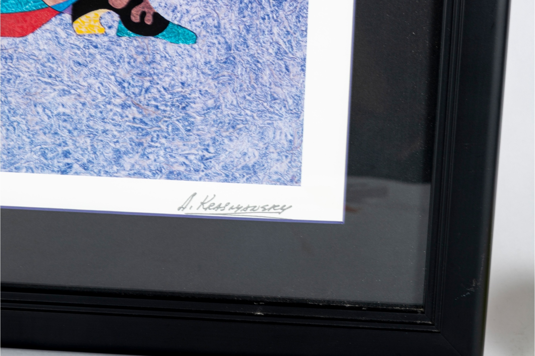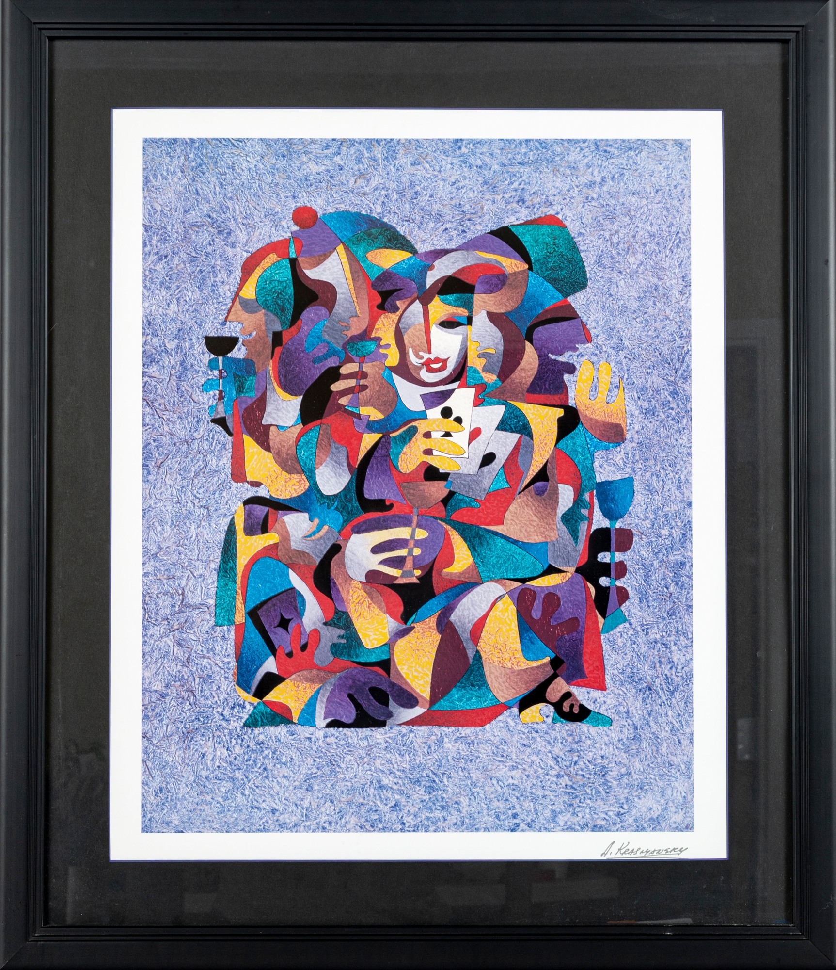 Anatole Krasnyansky (Ukrainian-American, 1930-2023) "To Be or Not to Be" print featuring a richly layered abstract figure rendered in bold jewel tones with Krasnyansky’s distinctive use of fragmented shapes and expressive color. Krasnyansky is known for his colorful, architectural, and cubist-influenced compositions. Signed in the bottom right corner. Presented within a modern black frame.
