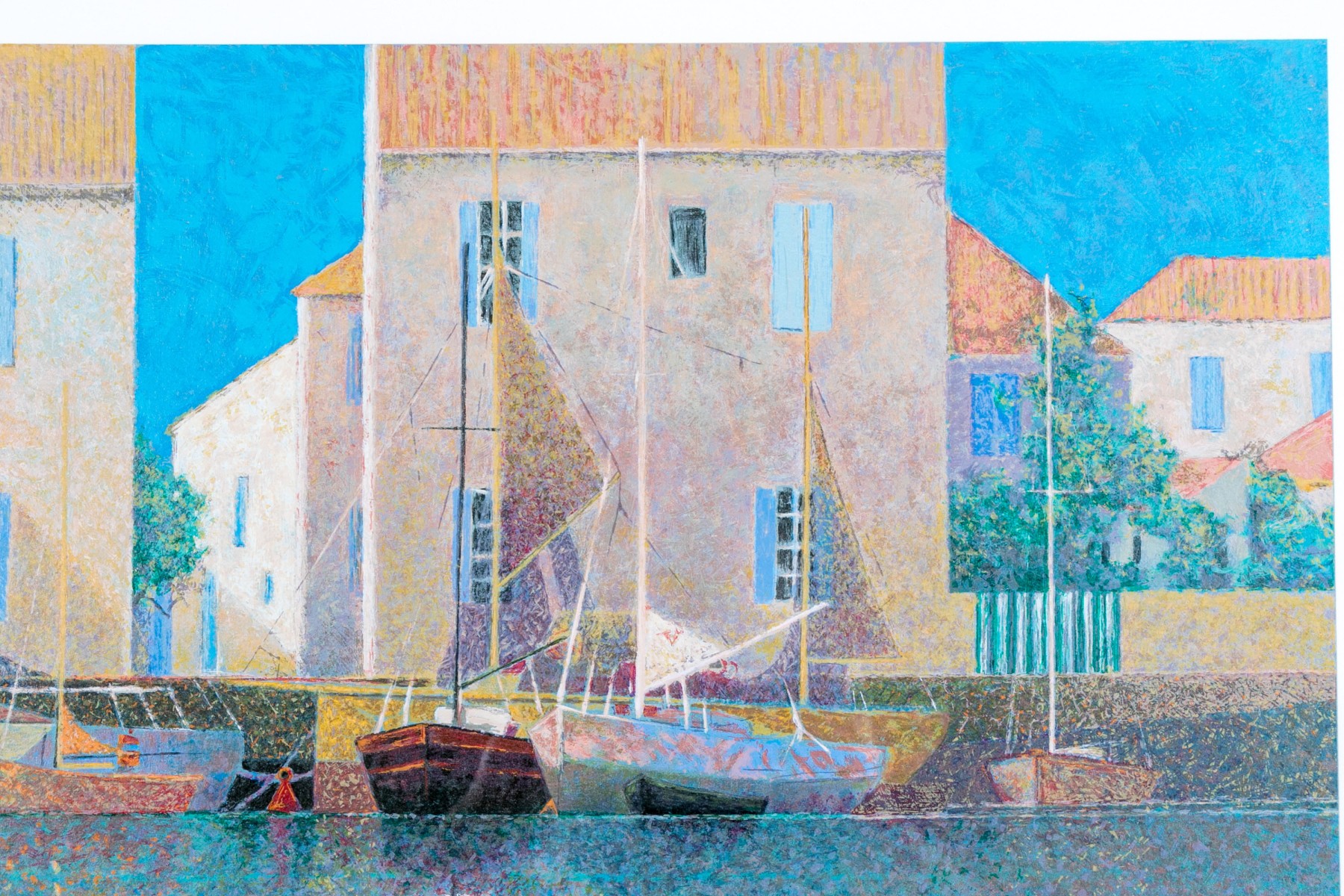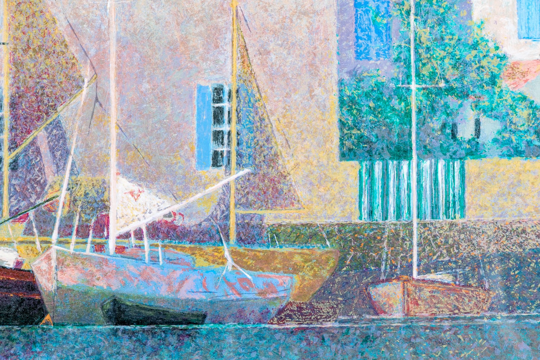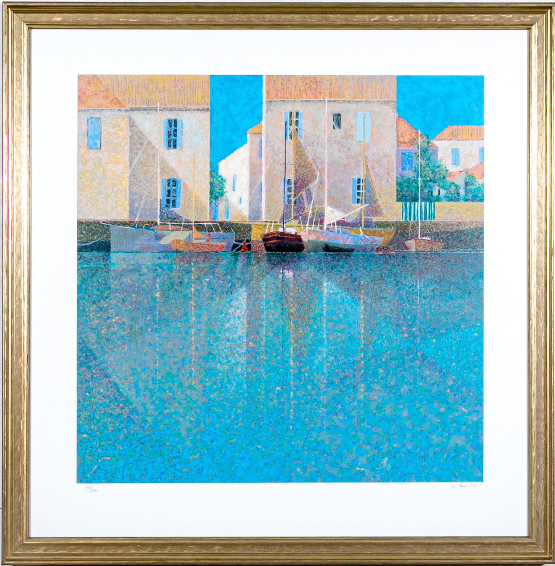 Pencil signed lower right, numbered 100/150 lower left. A lovely pastel tone scene of village houses on a river with sailboats moored on the quay. Their masts are reflected in the pointiilist rendered river below. Presented in a gilt frame with glass.