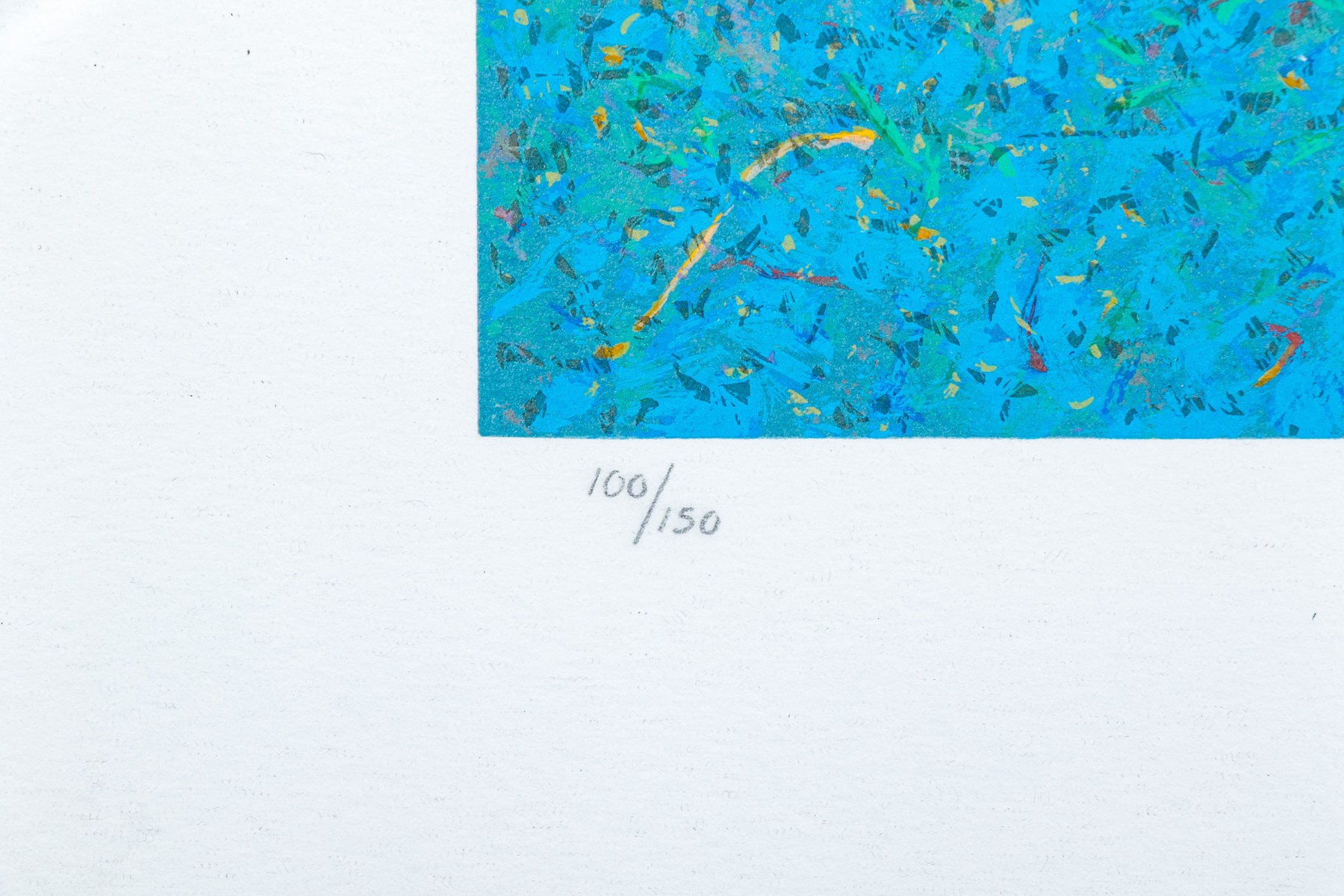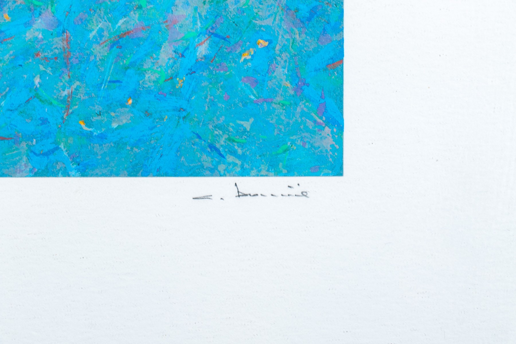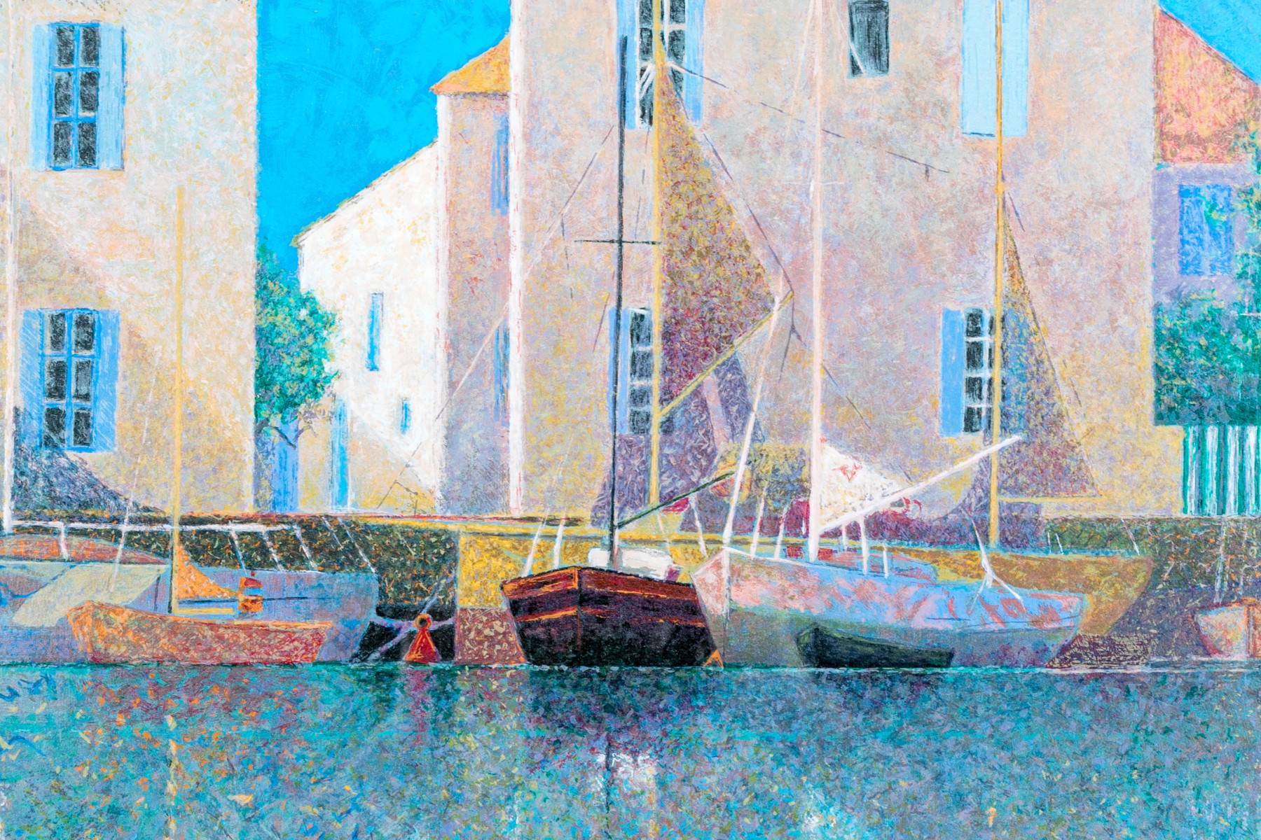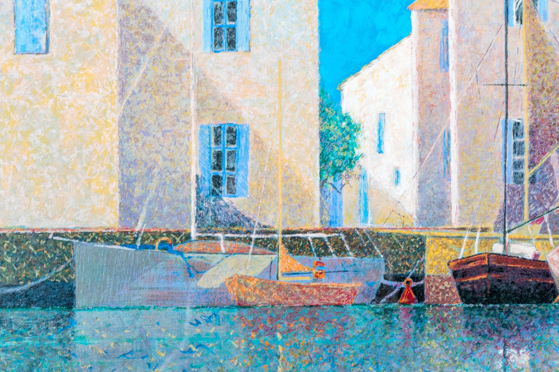 Pencil signed lower right, numbered 100/150 lower left. A lovely pastel tone scene of village houses on a river with sailboats moored on the quay. Their masts are reflected in the pointiilist rendered river below. Presented in a gilt frame with glass.