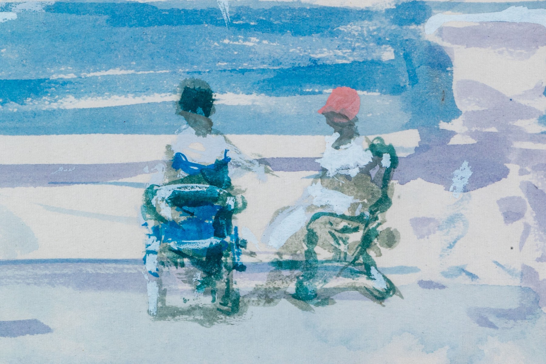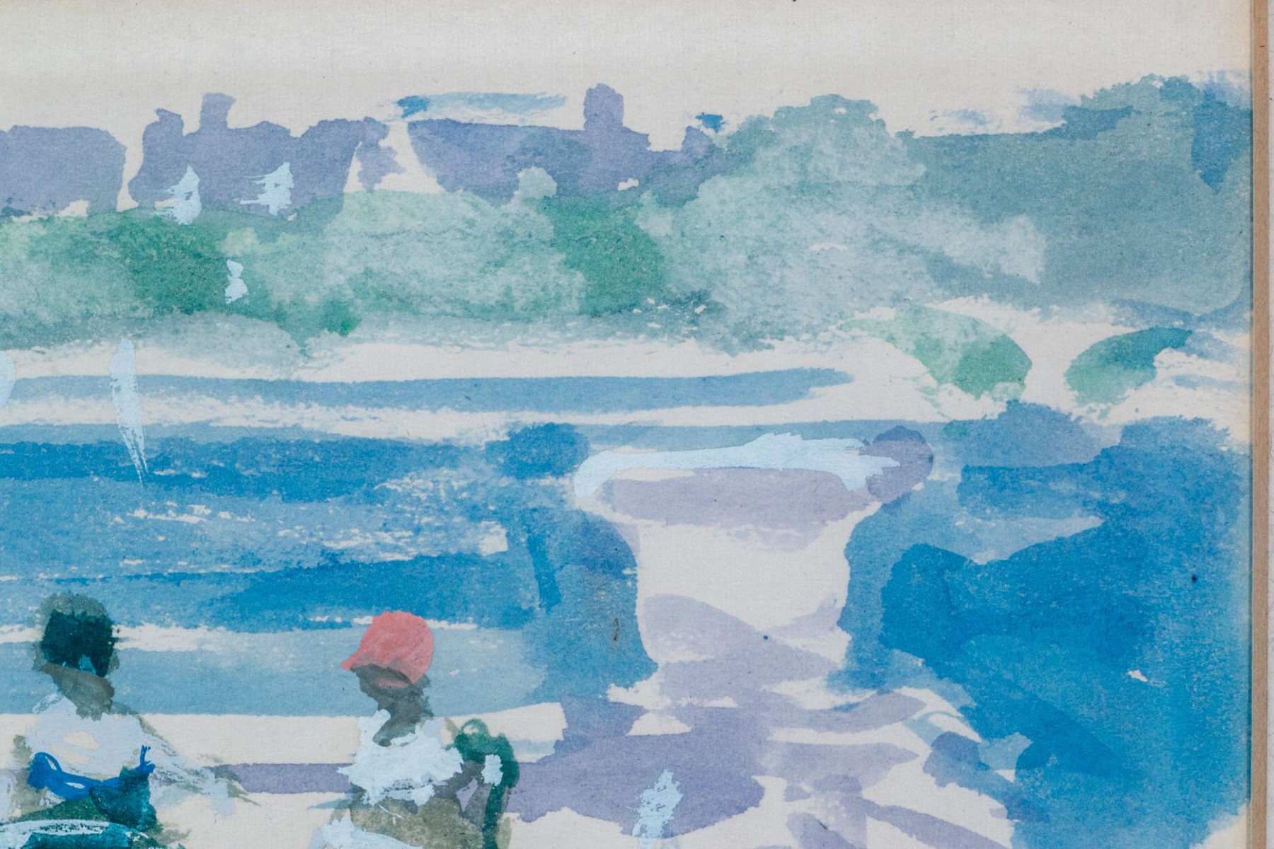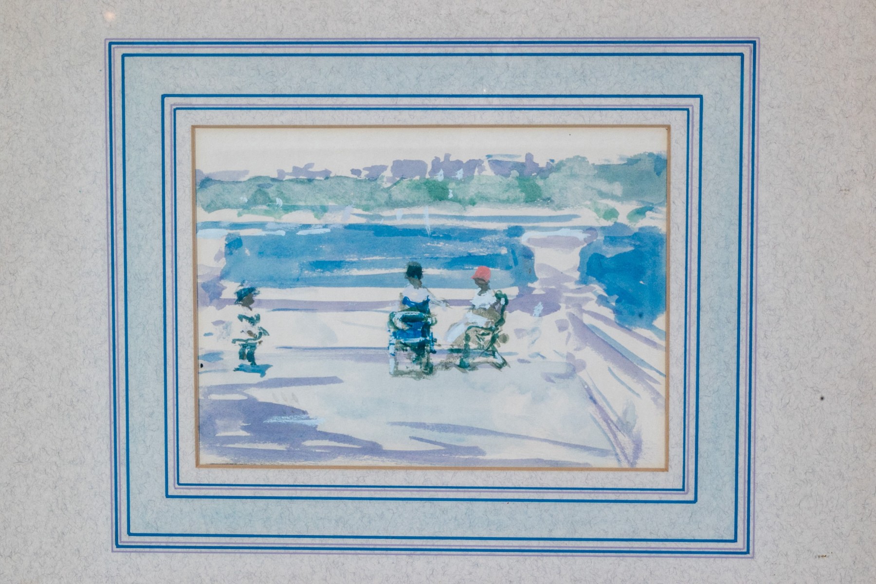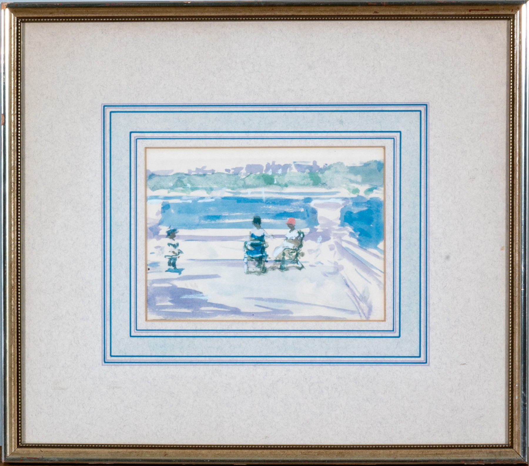 A beautiful watercolor painting on paper depicting an Impressionist style figural landscape with two individuals, wearing hats, depicted seated in chairs on a patio with a young child in dress with hat. The trio of figures looks out over a river with architectural landscape in the distance.
