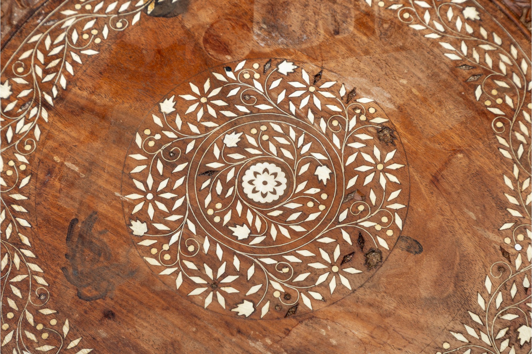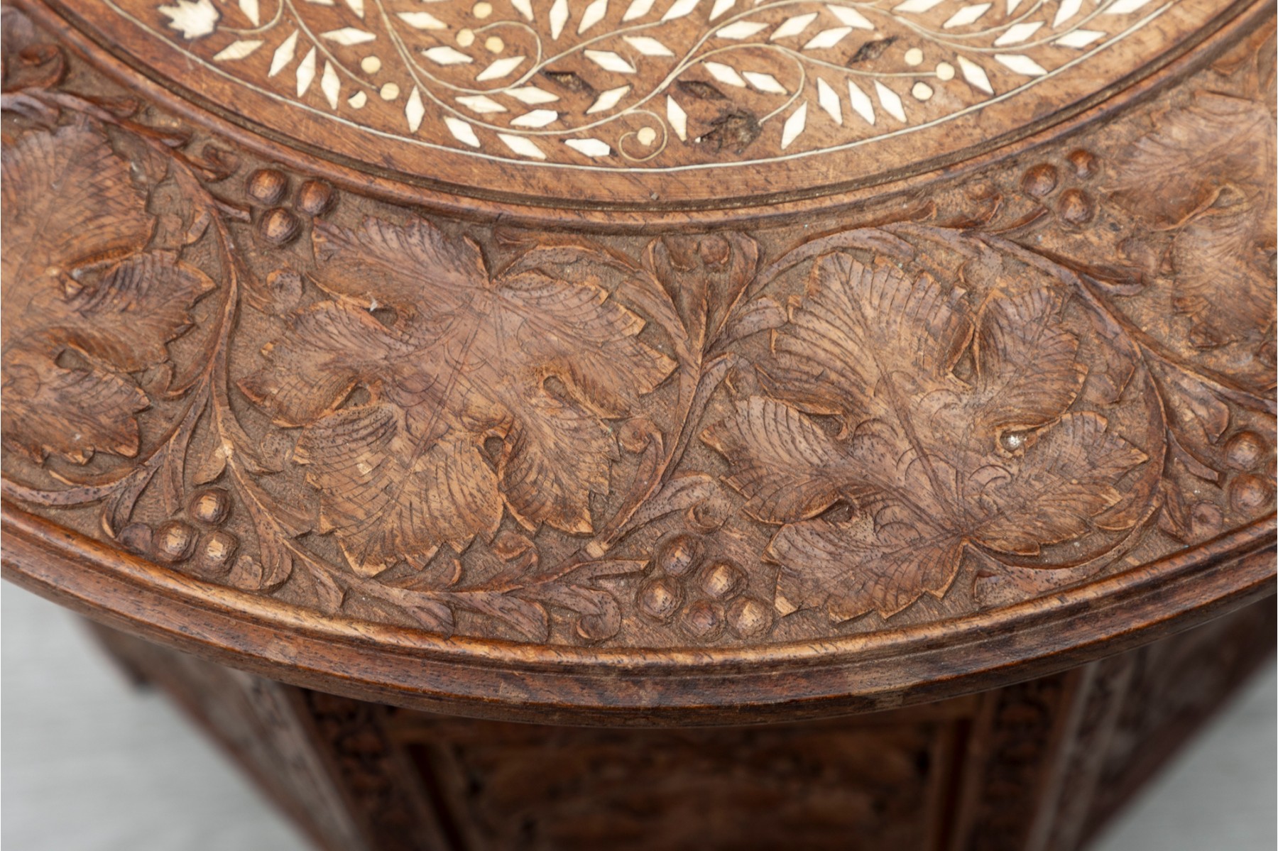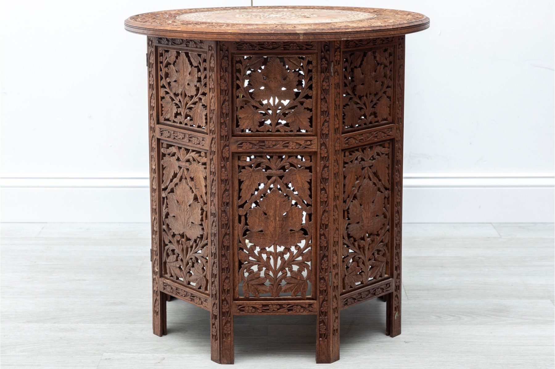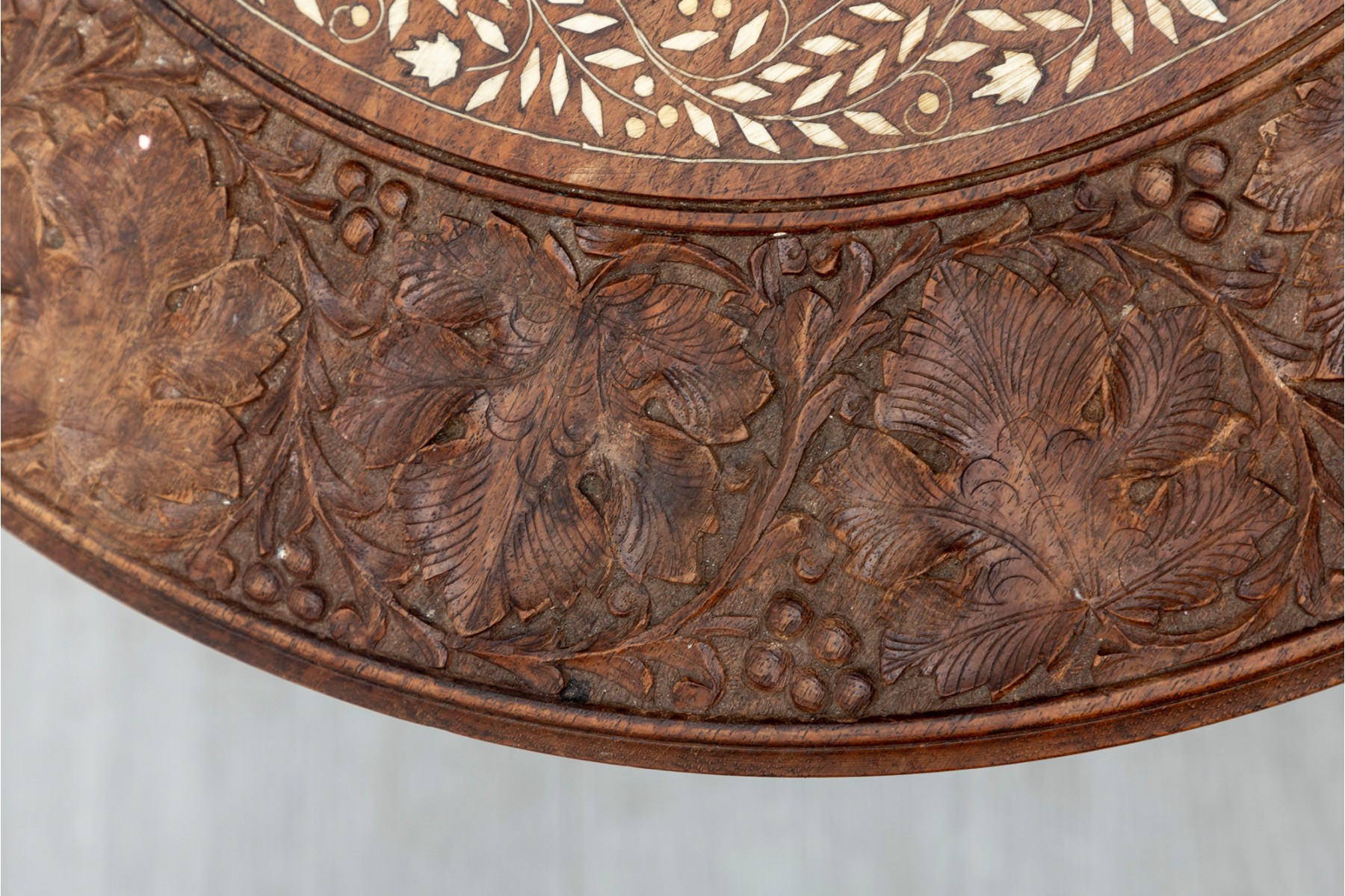Anglo-Indian carved wood side table with a folding base. Top showcases inlays in floral vine mandala pattern. Tables such as these were used as end tables in palaces and large homes in Northern India.