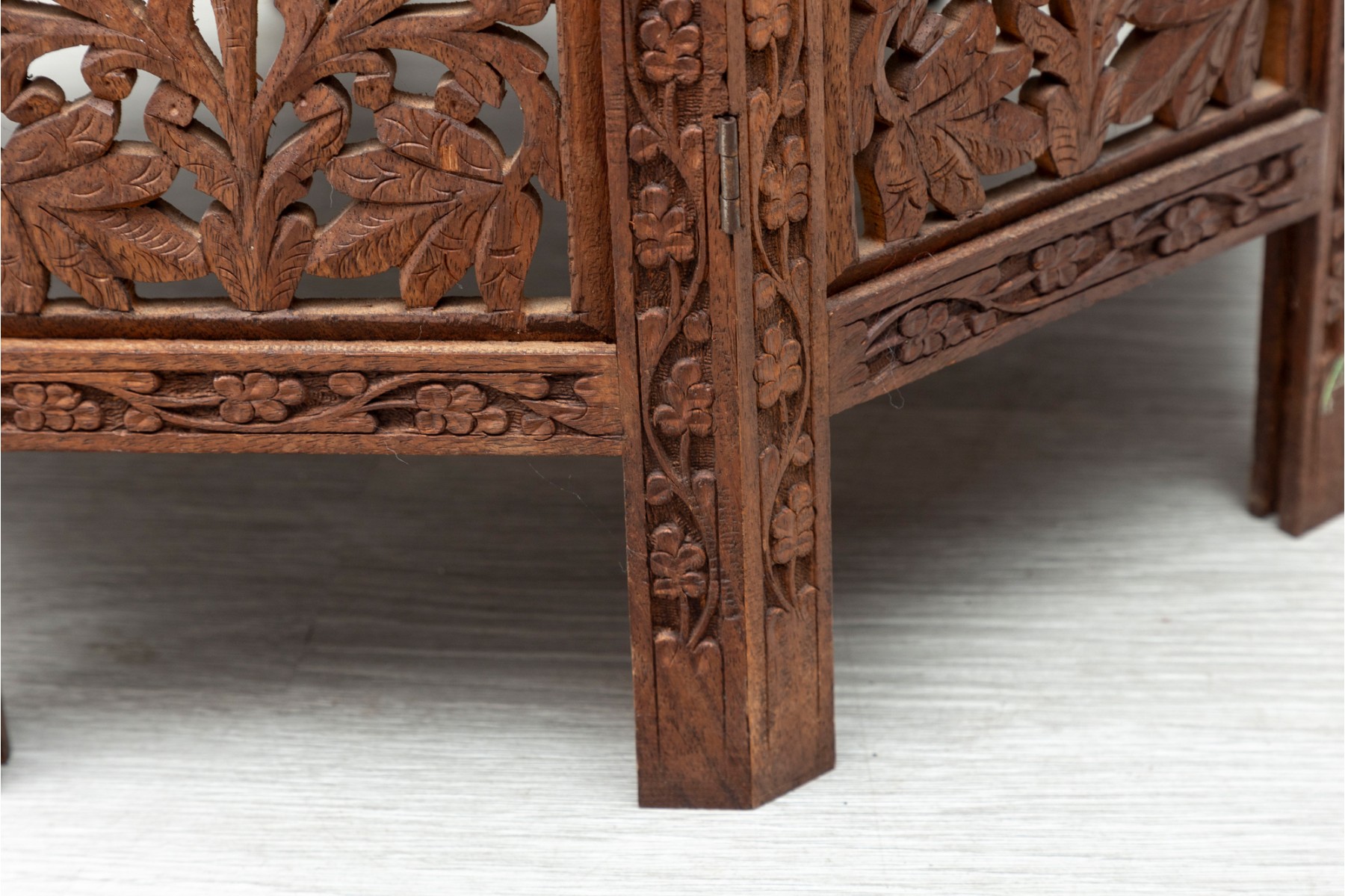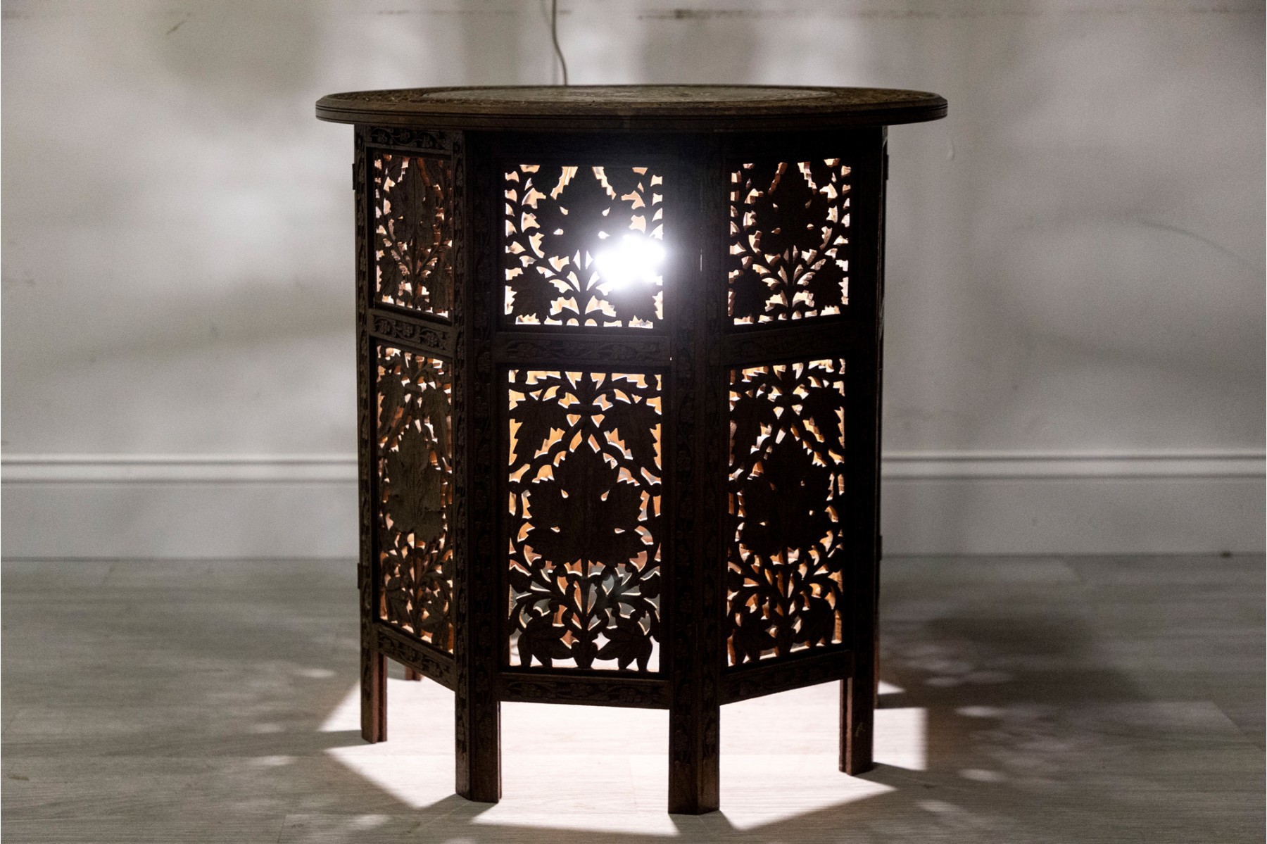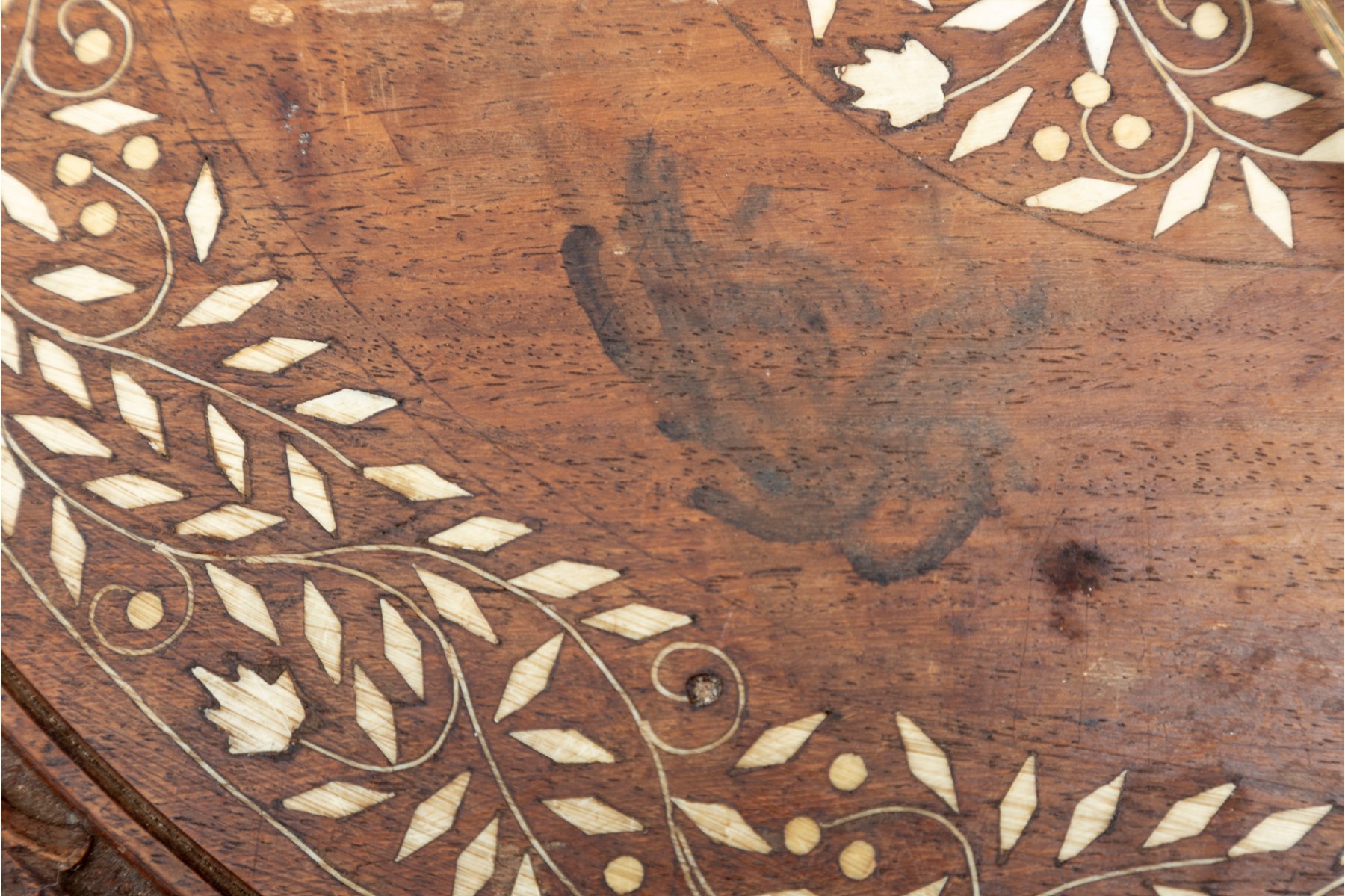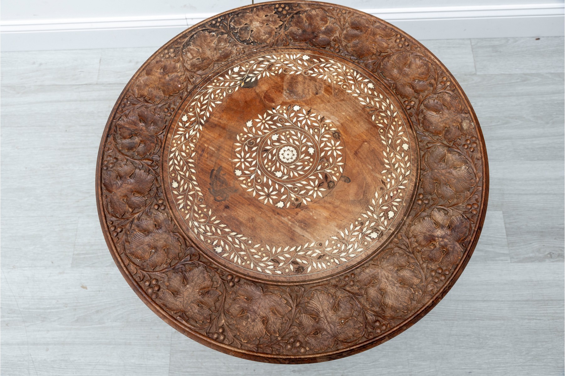 Anglo-Indian carved wood side table with a folding base. Top showcases inlays in floral vine mandala pattern. Tables such as these were used as end tables in palaces and large homes in Northern India.