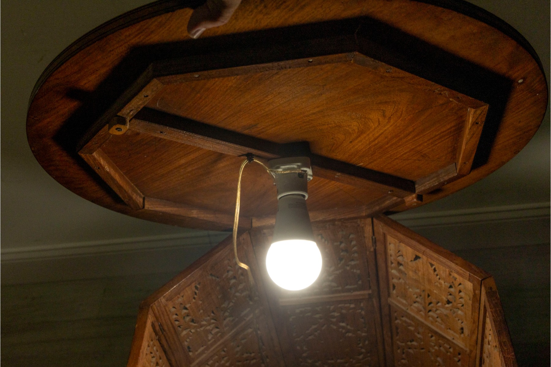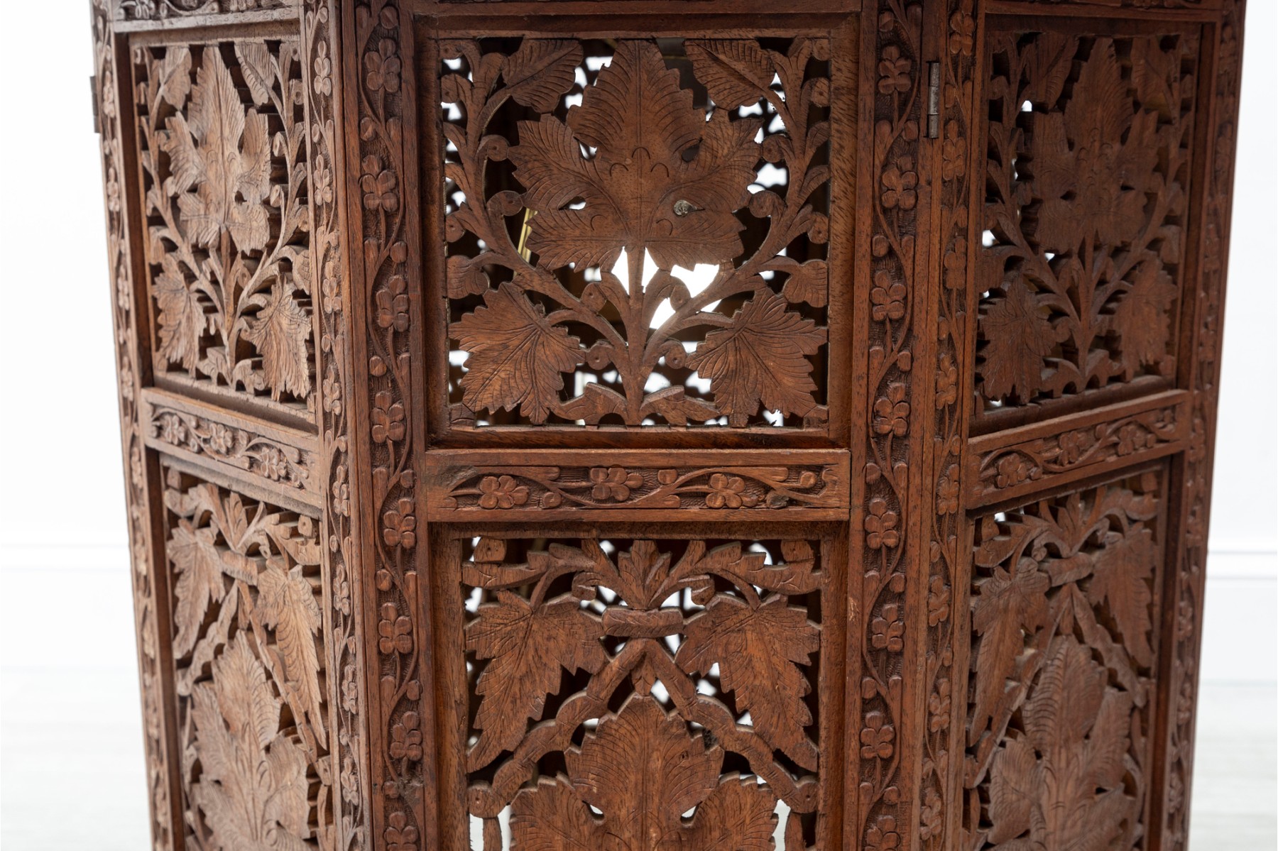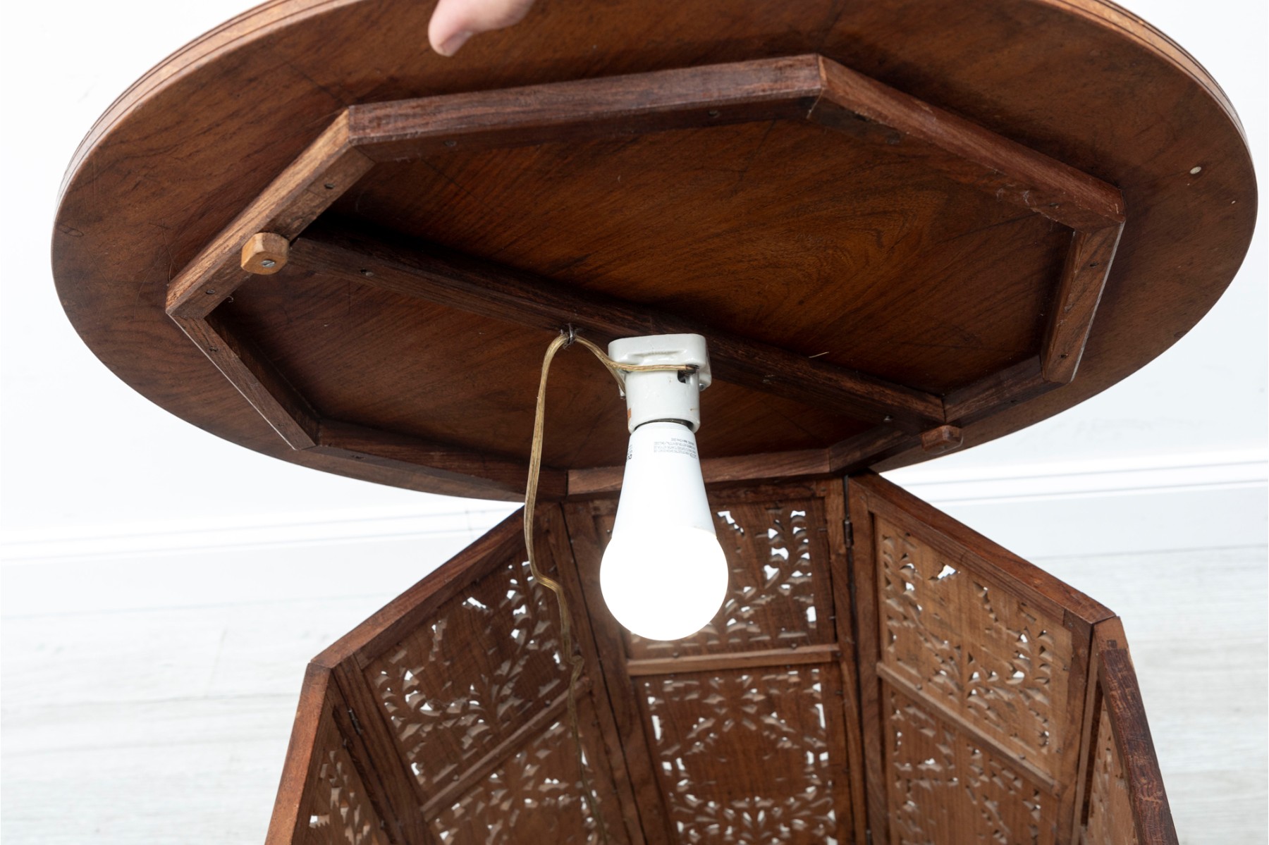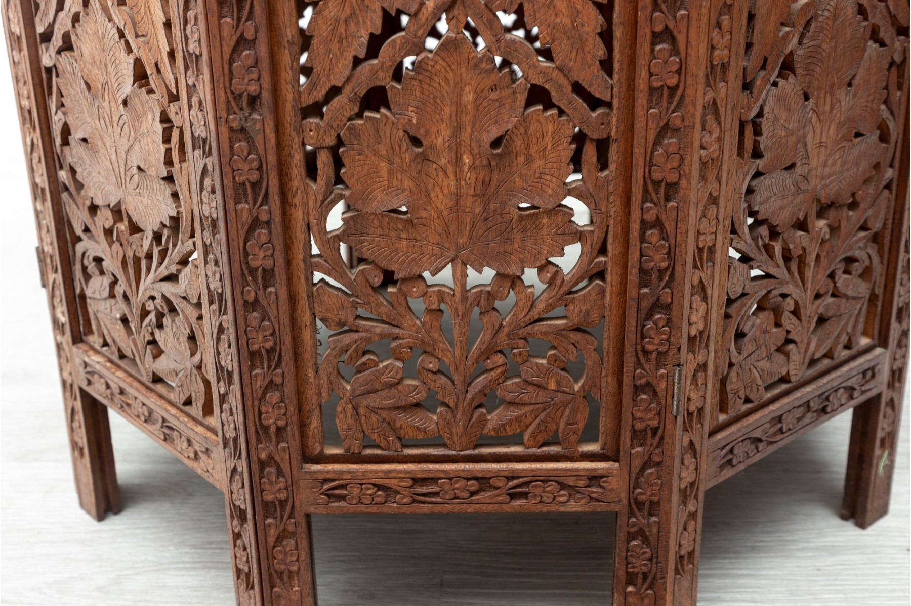 Anglo-Indian carved wood side table with a folding base. Top showcases inlays in floral vine mandala pattern. Tables such as these were used as end tables in palaces and large homes in Northern India.