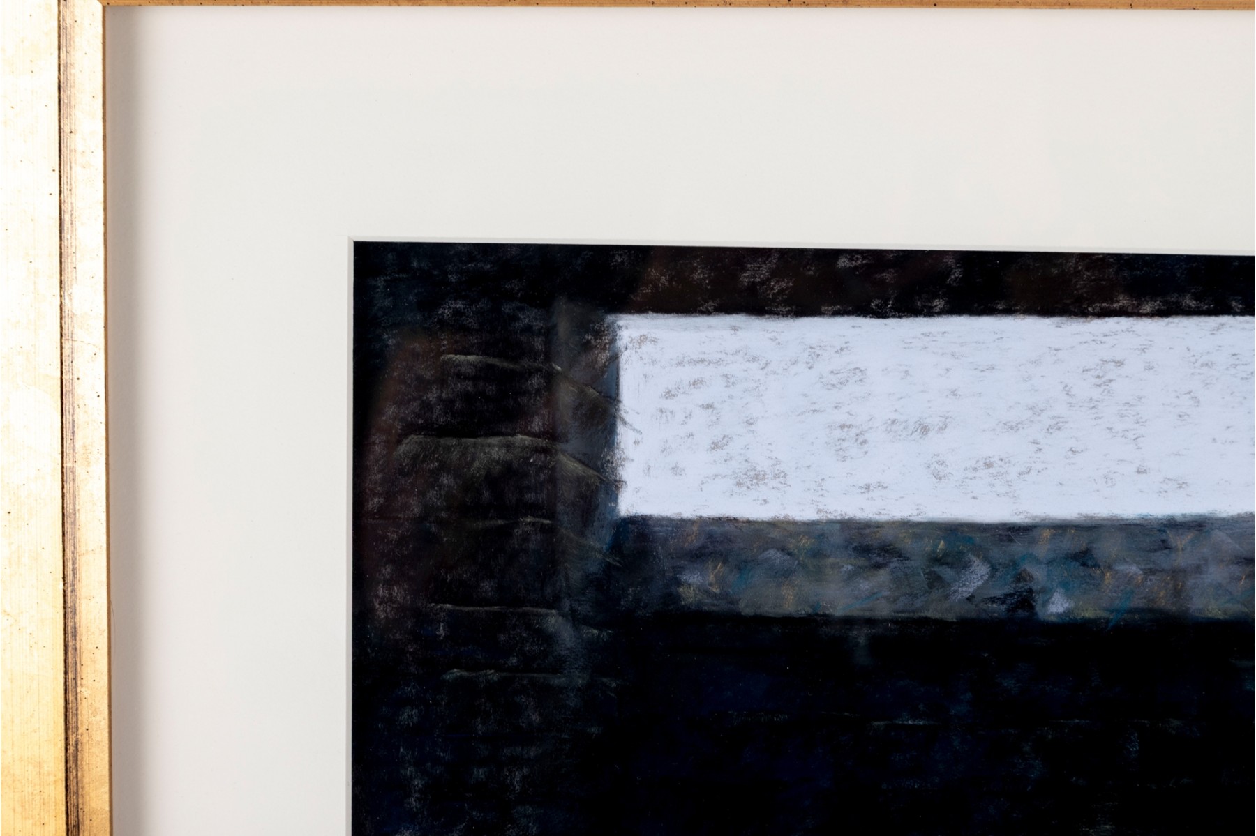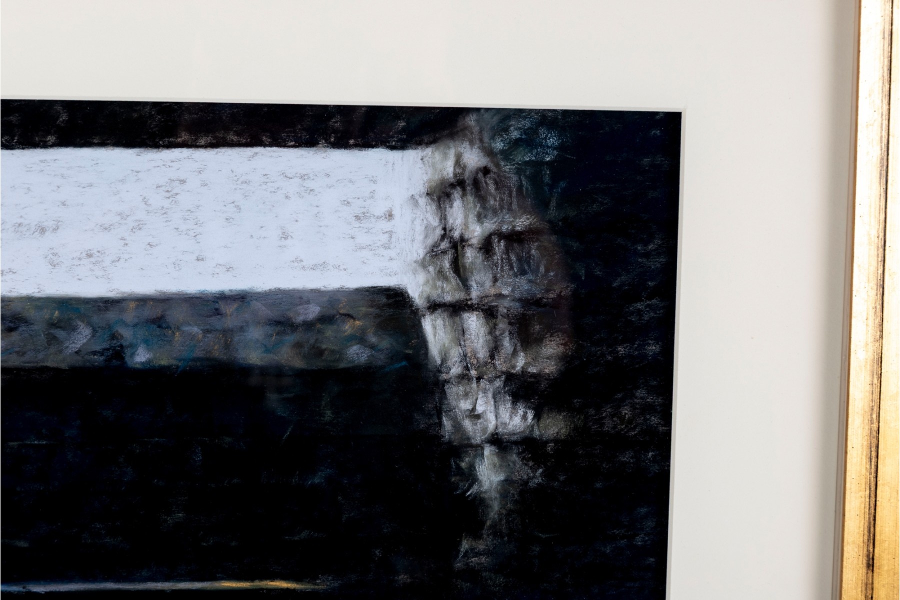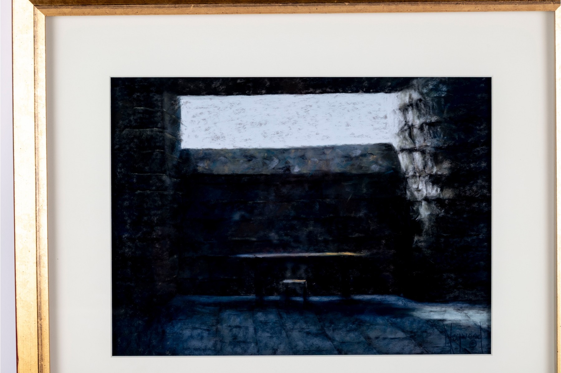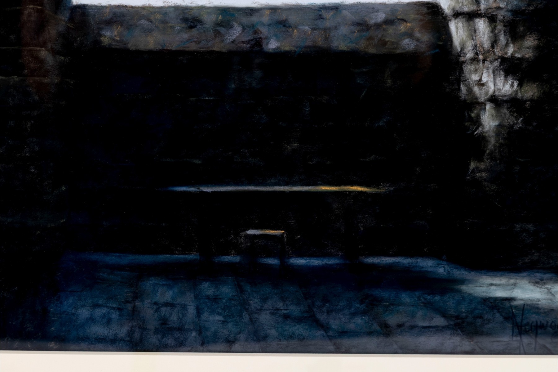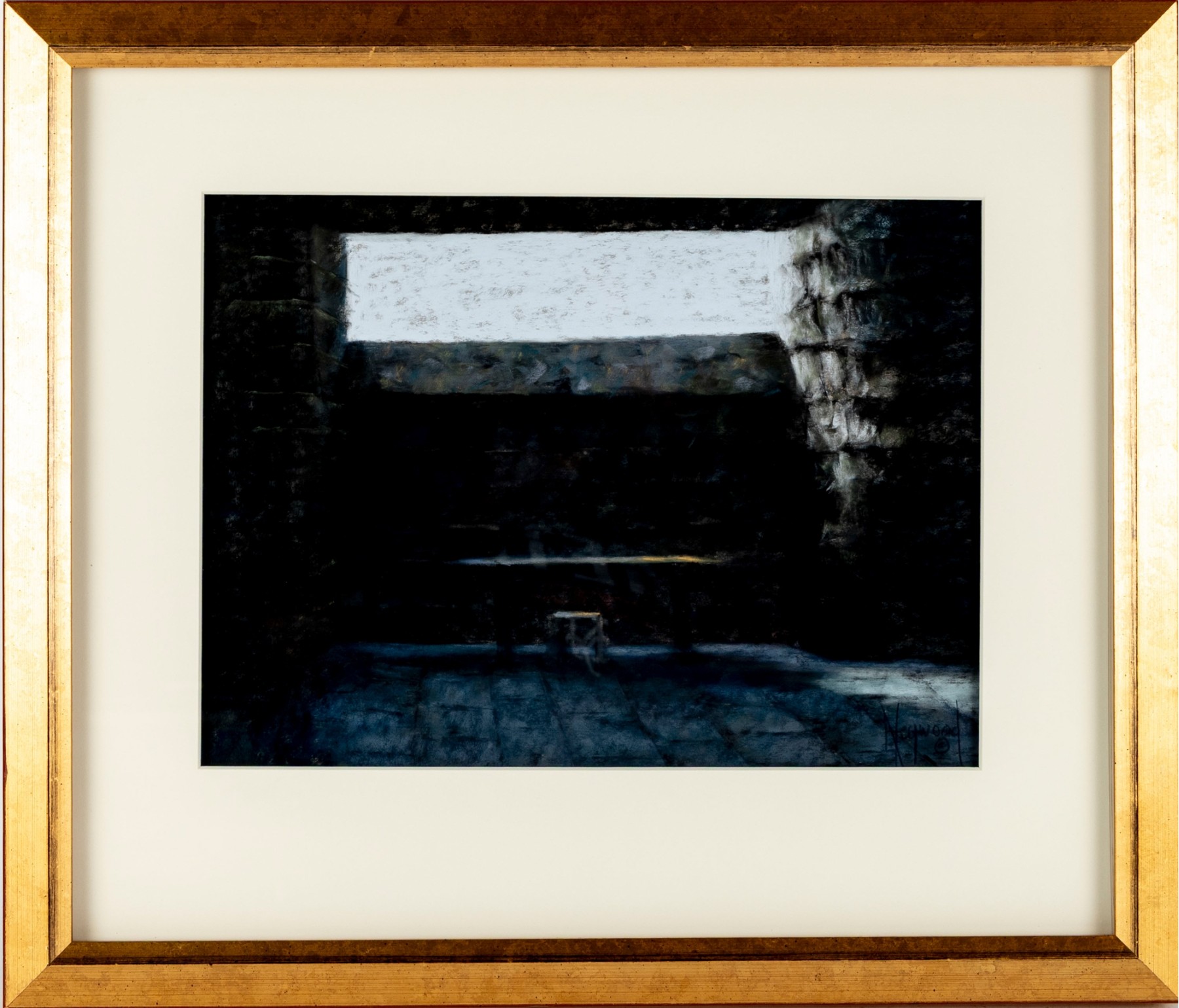Anne Heywood (American [MA], b. 1951) "One Setting" pastel on paper depicting a moody, abstract scene of light streaming through a long rectangular window to an interior. Signed lower right and affixed with the artist's label on the verso.