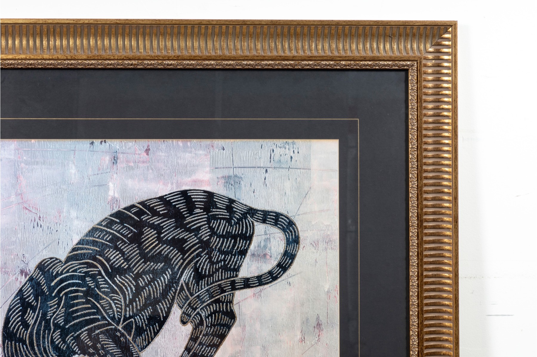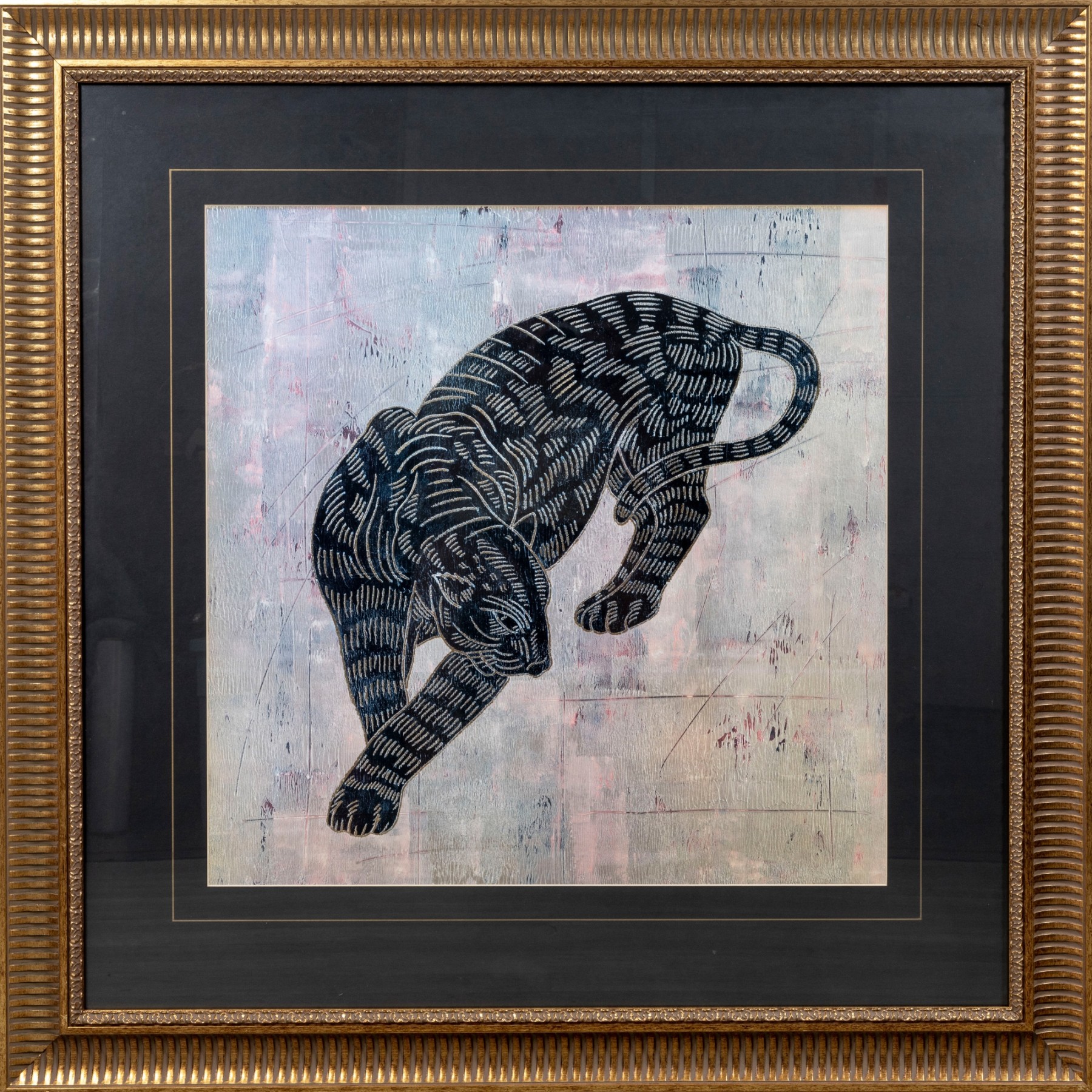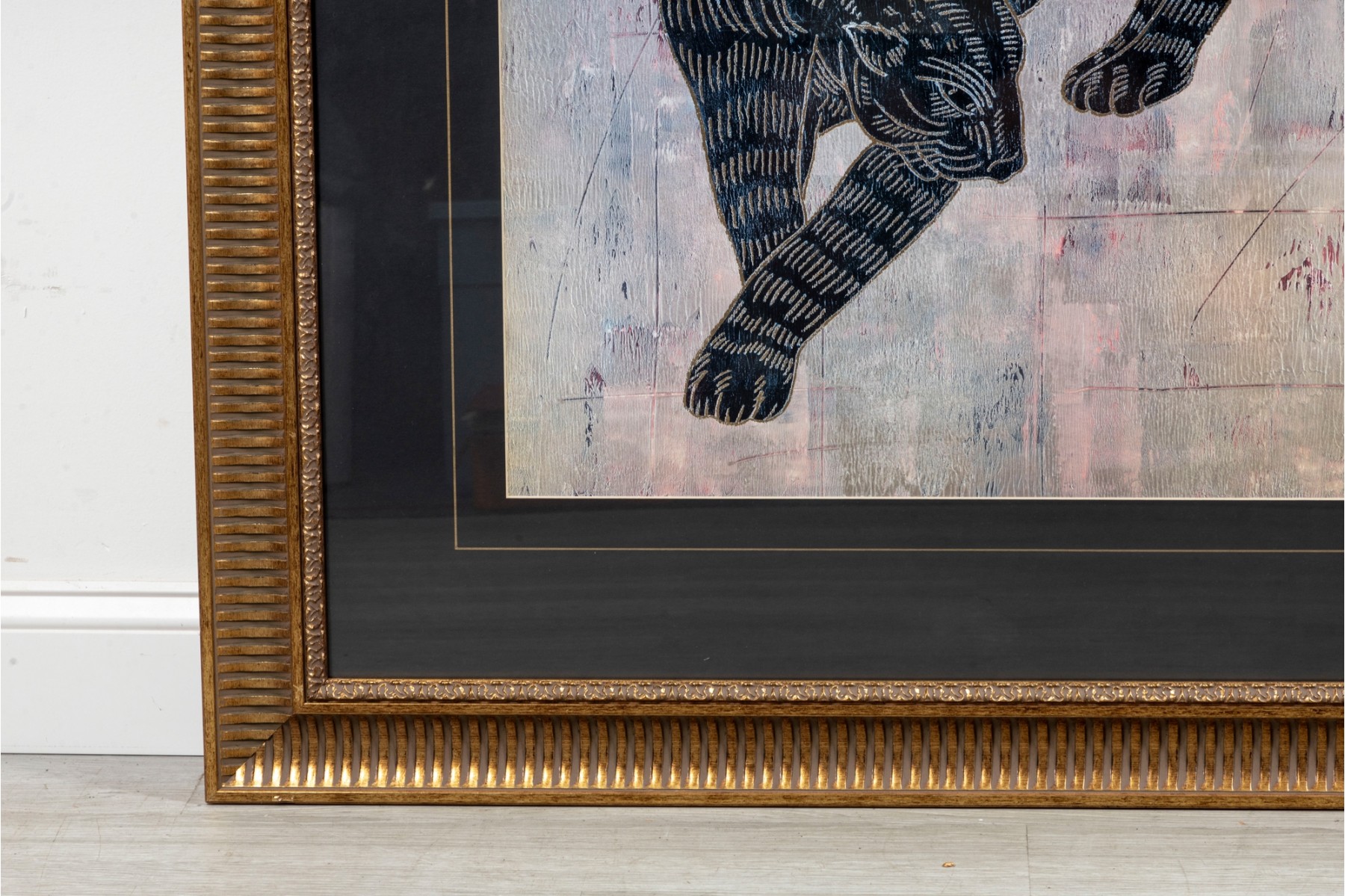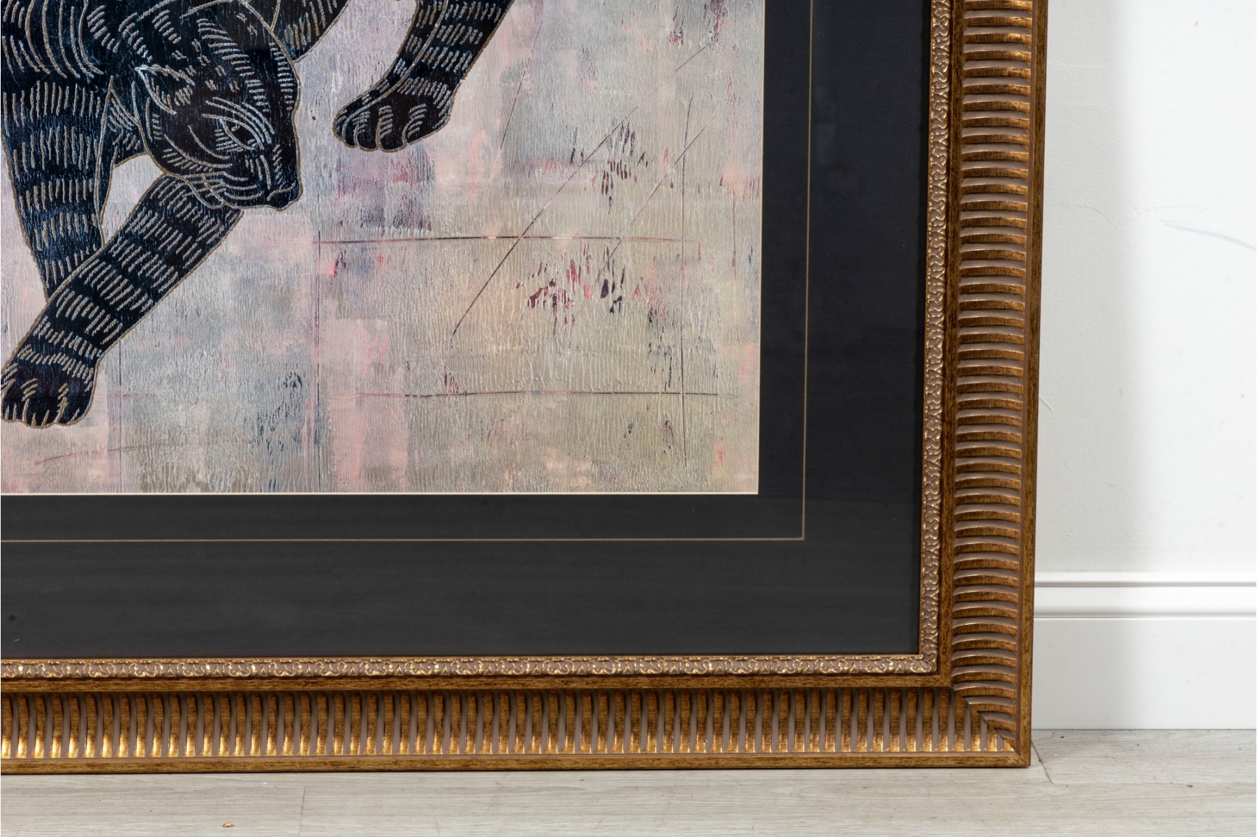 A large framed art print of Annrika Mccavitt's "Chimera 1" which displays a primitive depiction of a prowling black panther outlined in gold overlay. The artwork is presented in a grand gold-tone wood frame with faceted detailing, as well as a large black/gold pinstripe mat-border contained behind glass.