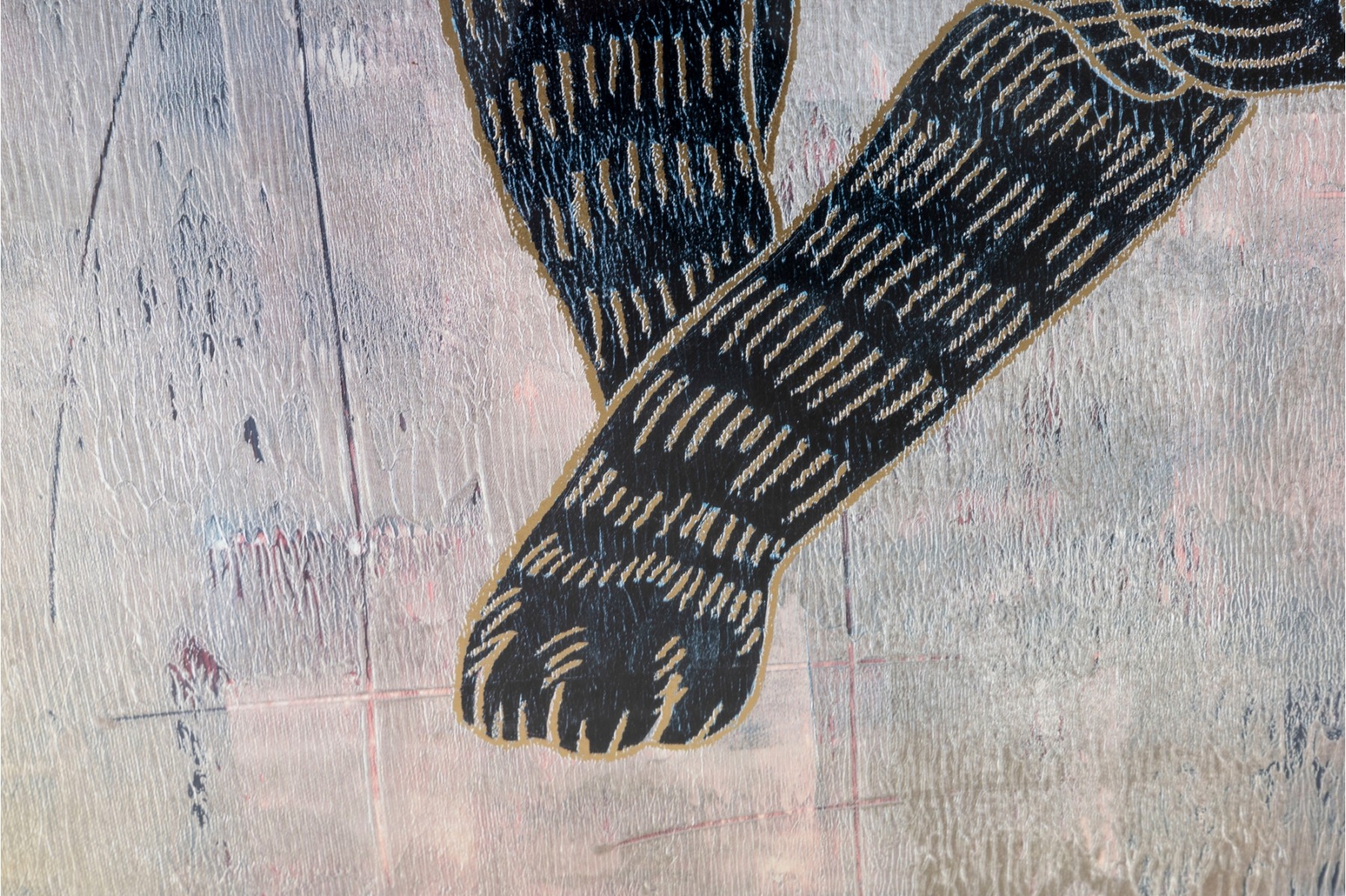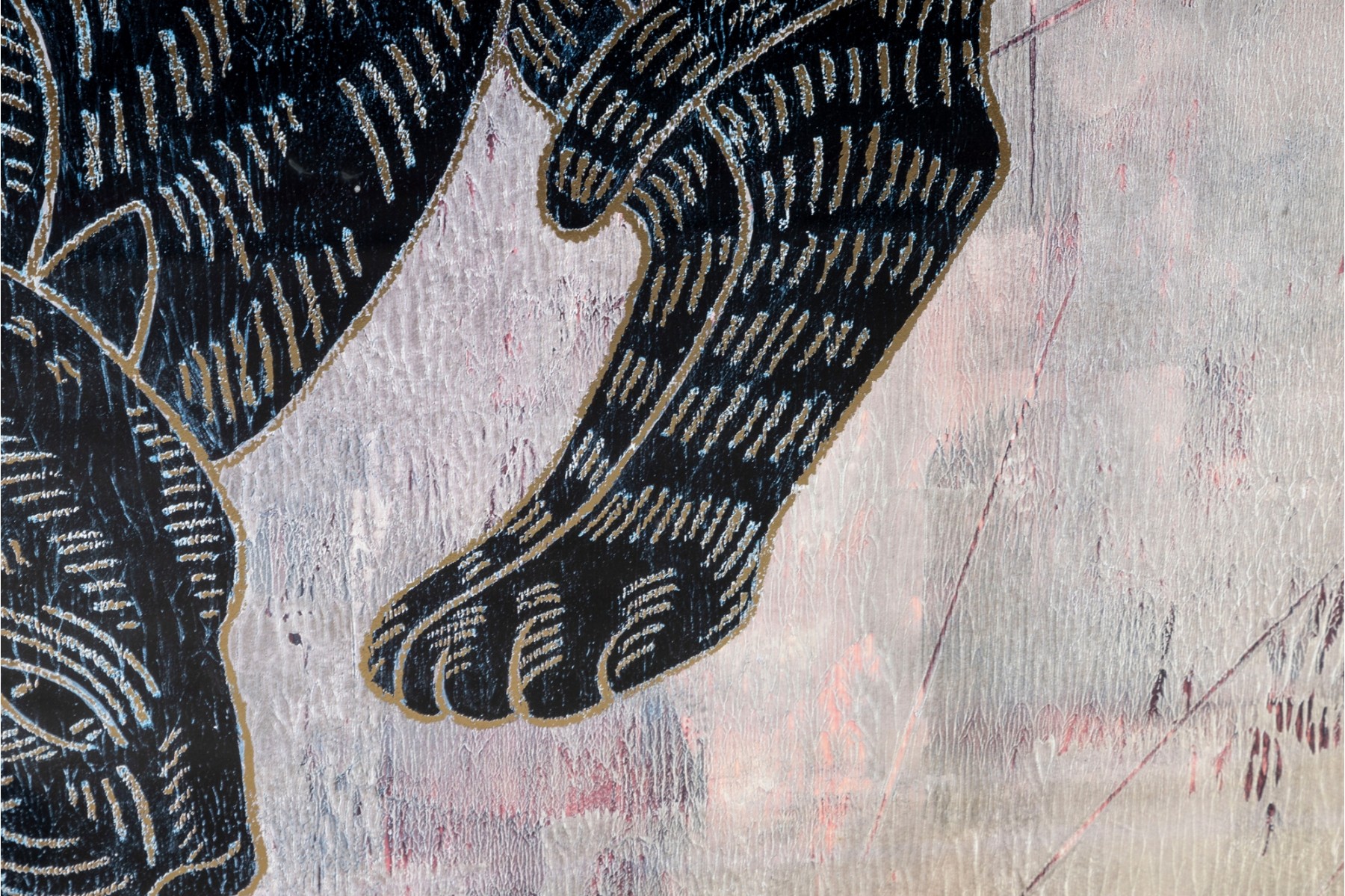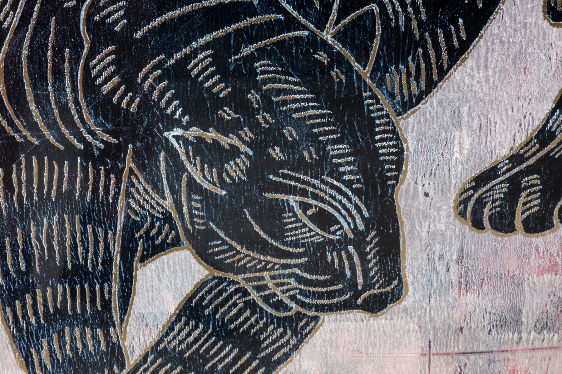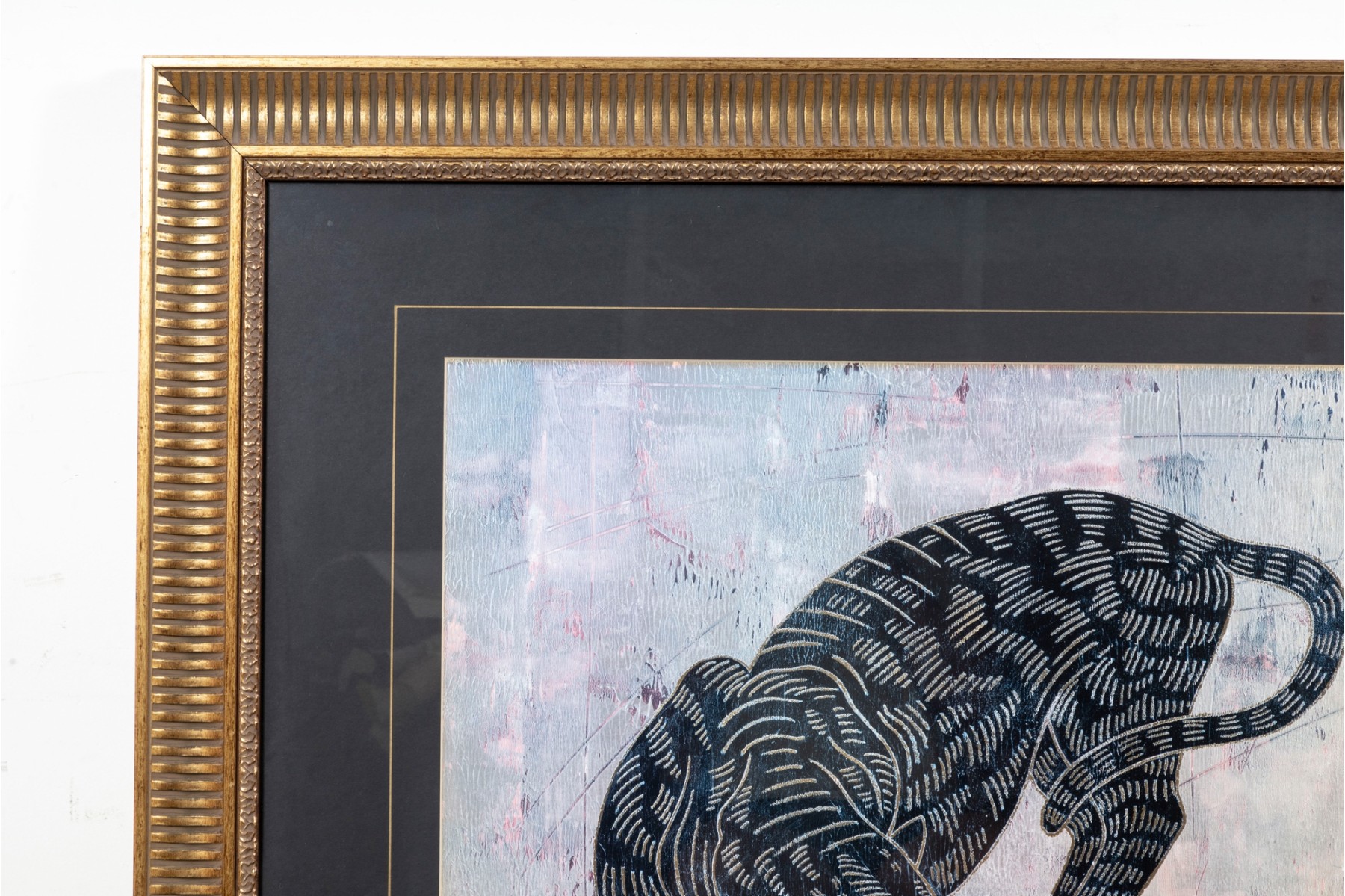 A large framed art print of Annrika Mccavitt's "Chimera 1" which displays a primitive depiction of a prowling black panther outlined in gold overlay. The artwork is presented in a grand gold-tone wood frame with faceted detailing, as well as a large black/gold pinstripe mat-border contained behind glass.