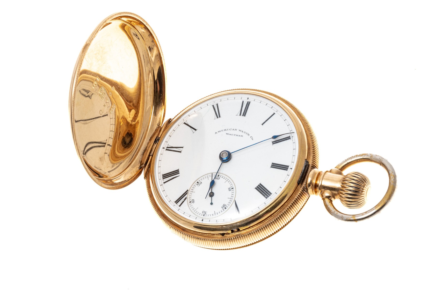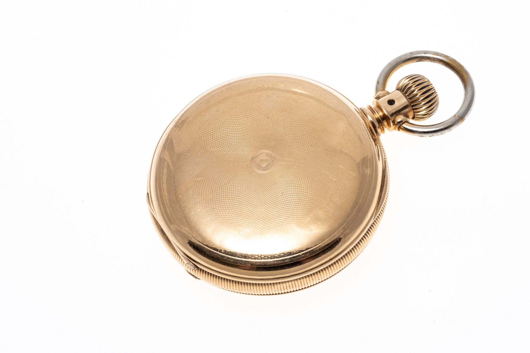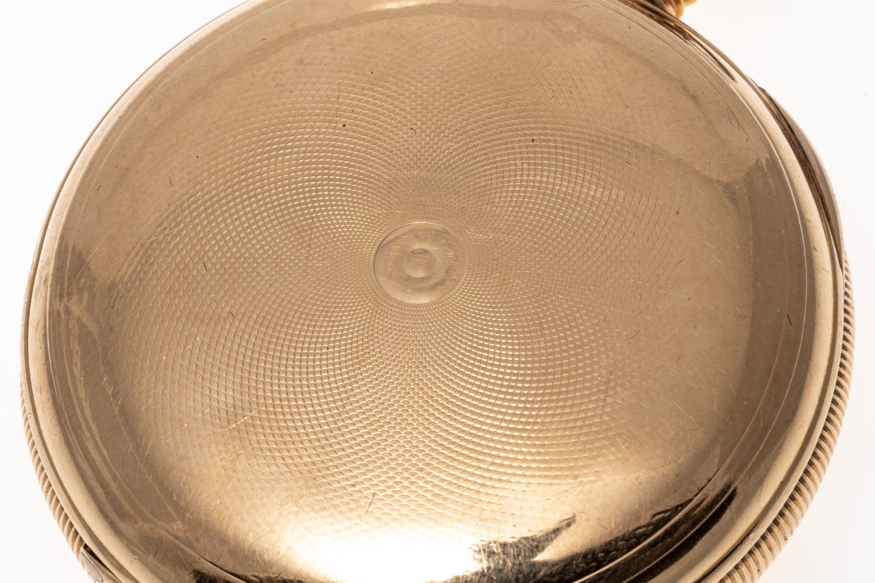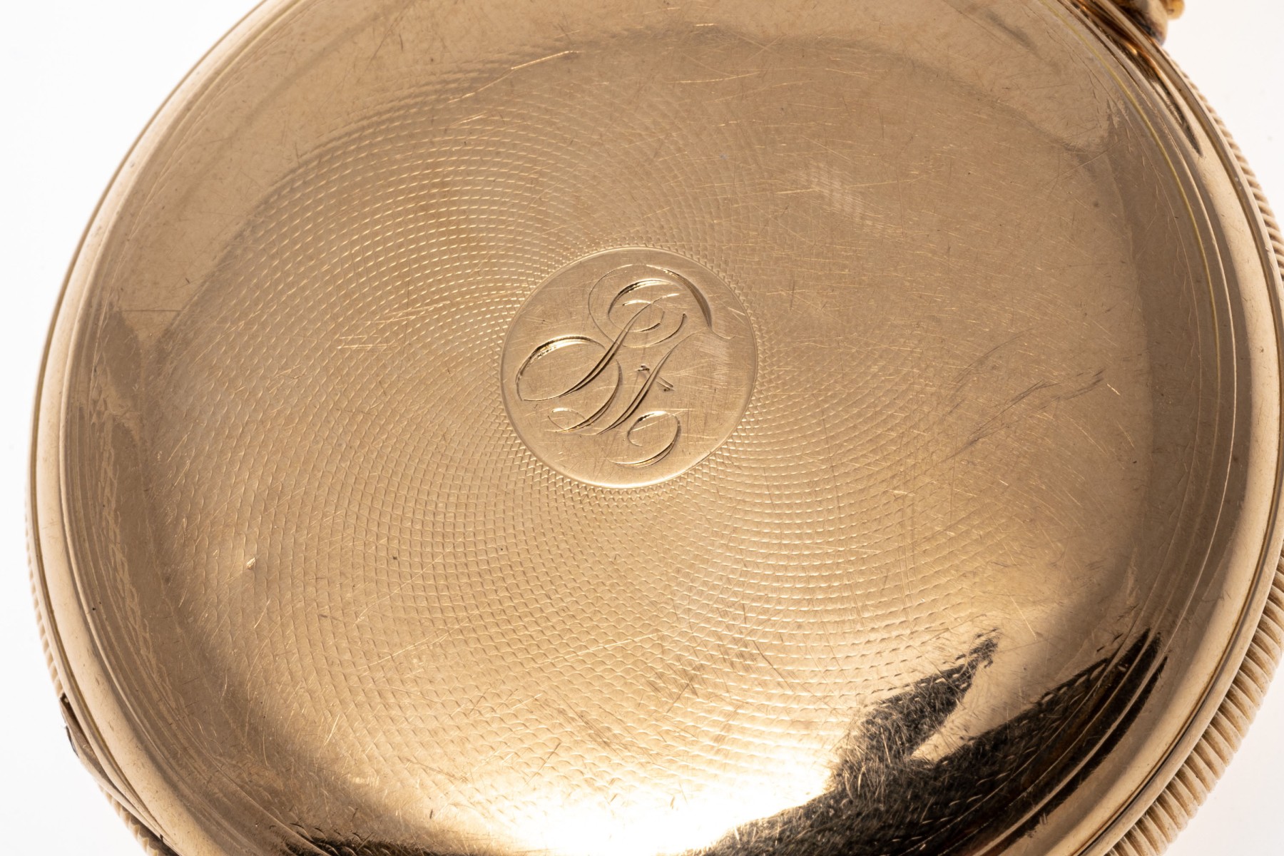 Antique 14K Waltham mechanical pocket watch. The watch as an engine tool case and a dial with Roman numeral indices, sub second dial at the 6:00 position. Circa 1883.